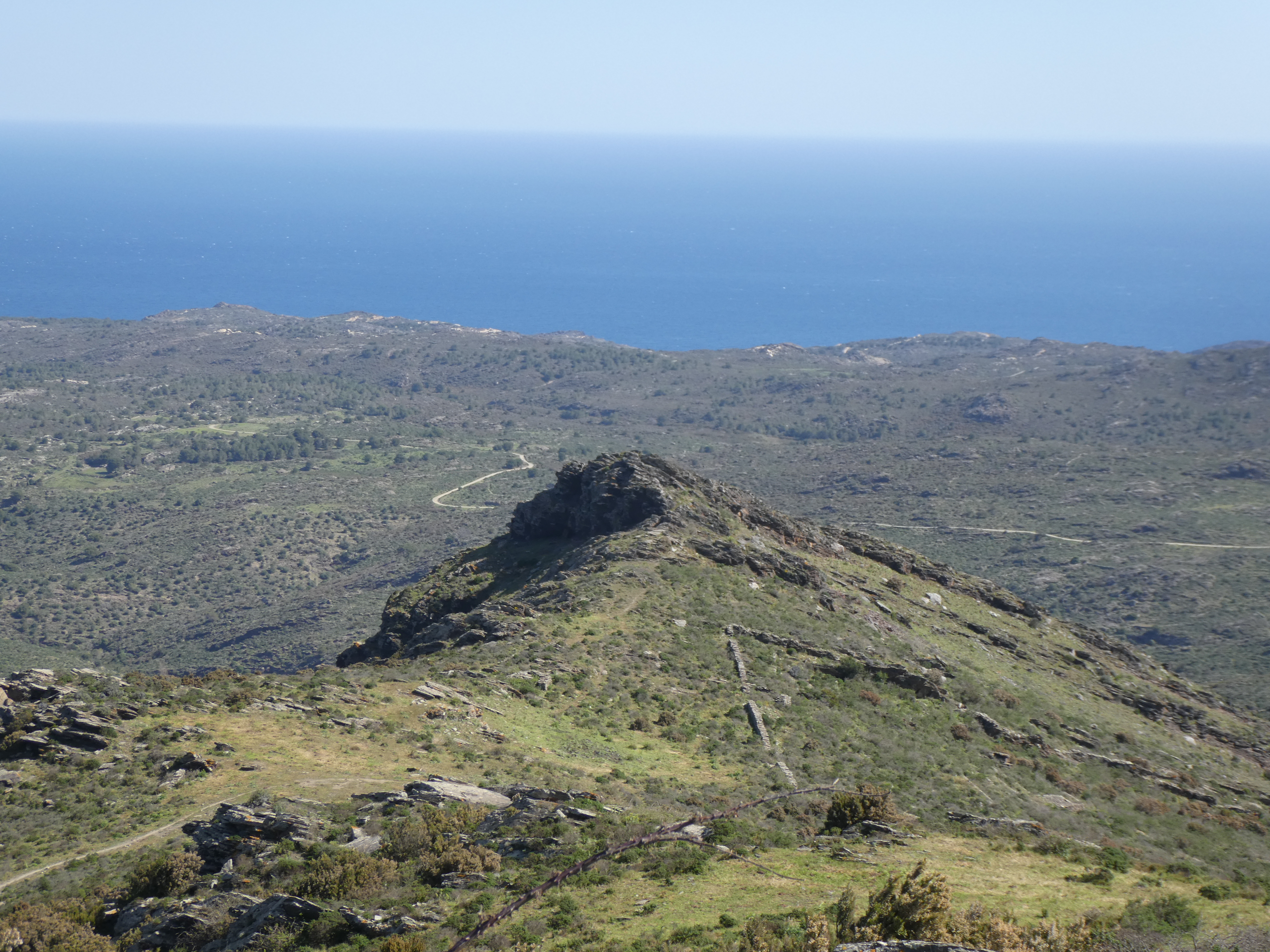 Arrivée au sommet du Puig dels Bufadors (432 m) : beau panorama sur les sommets du Parc Natural de Cap de Creus, de l'Alt Empordà, du massif des Albères ainsi que sur la partie septentrionale de la Costa Brava