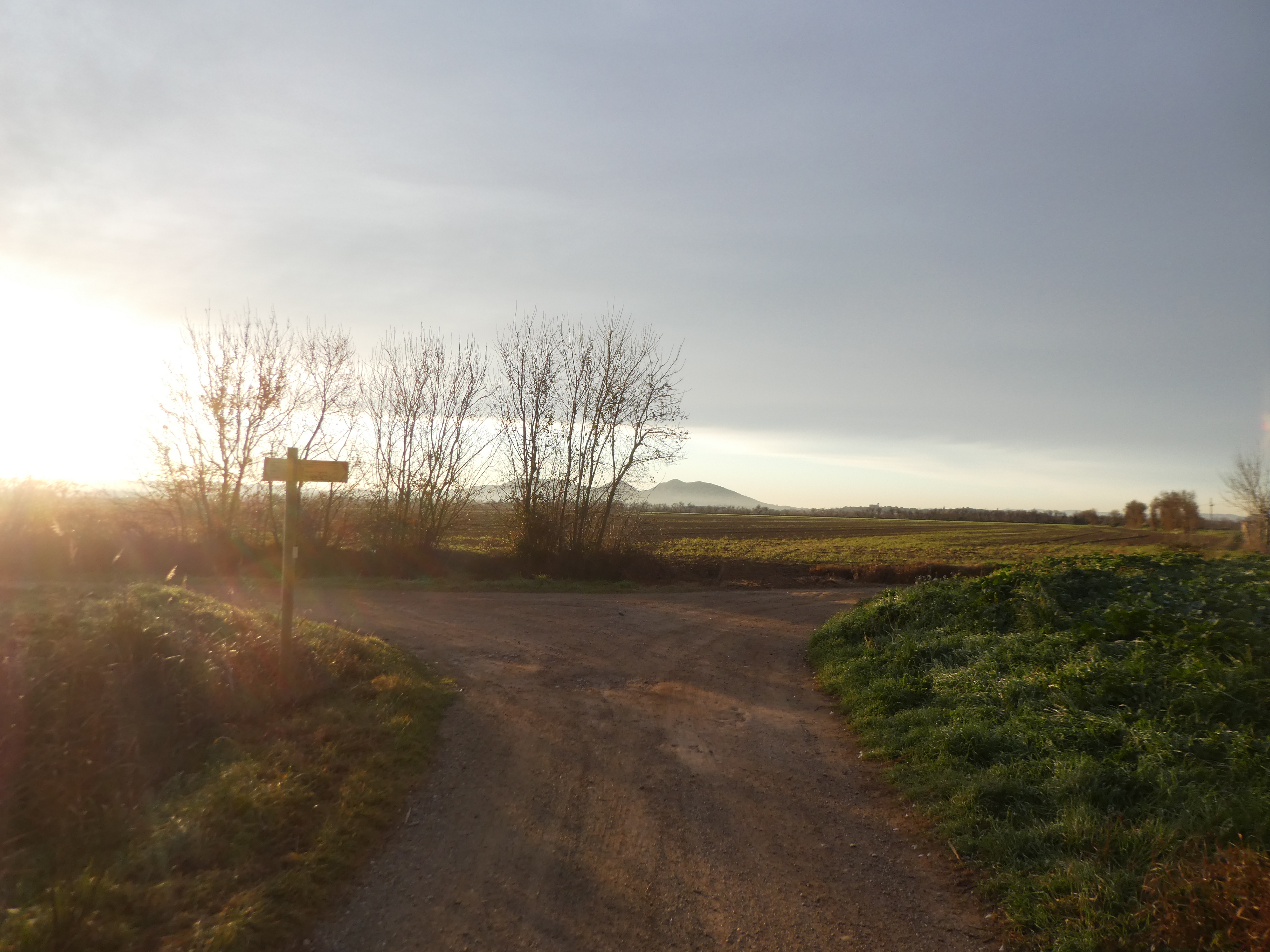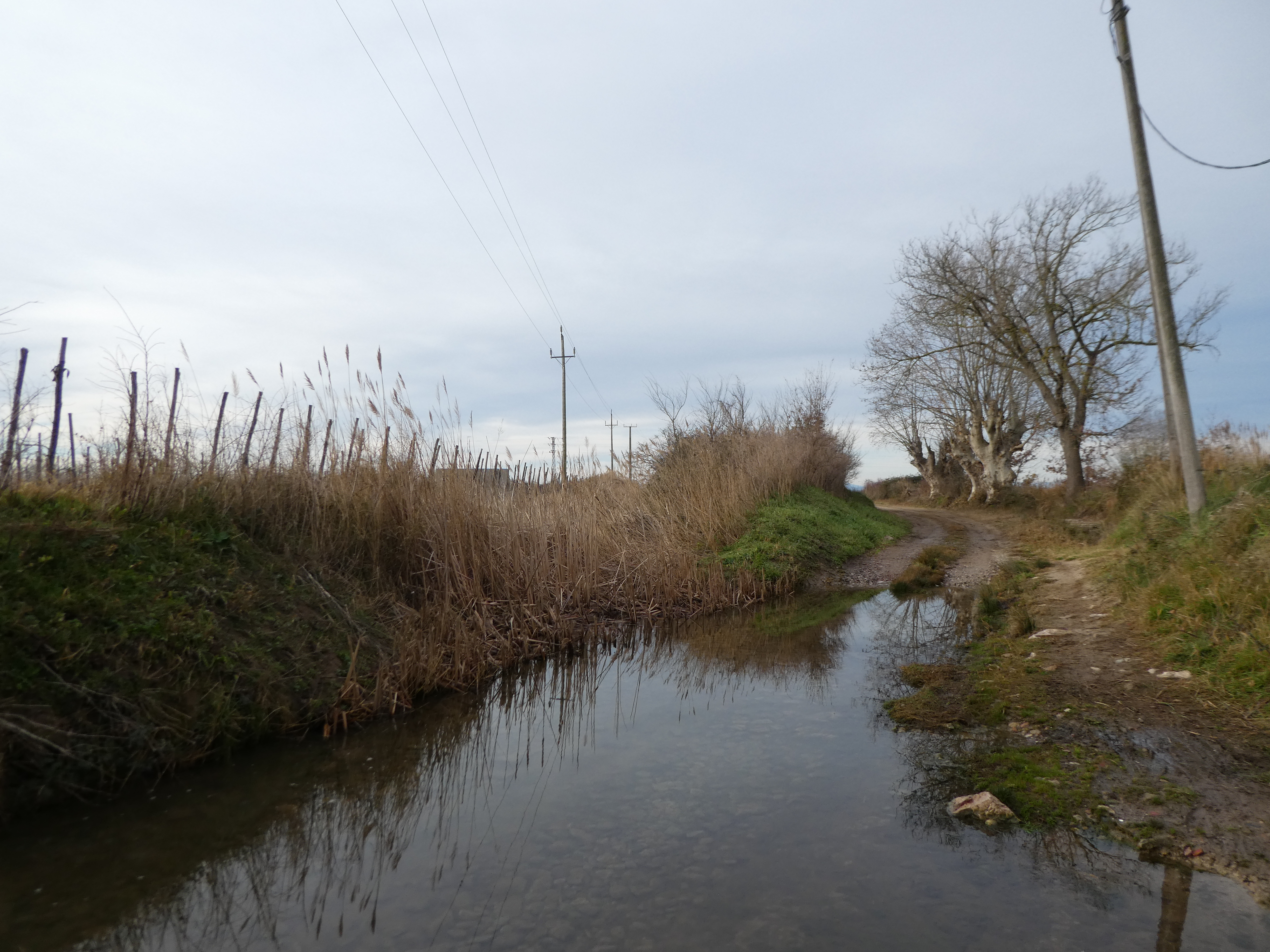 A ce croisement (150 mètres après le lieu-dit "Sant Martí d'Empúries"), traverser la route pour suivre le chemin partant sur la droite direction Cinc Claus, aucun balisage dorénavant (ce "détour" permet d'éviter de suivre la route et emprunte l'itinéraire cyclable du PirineXus)