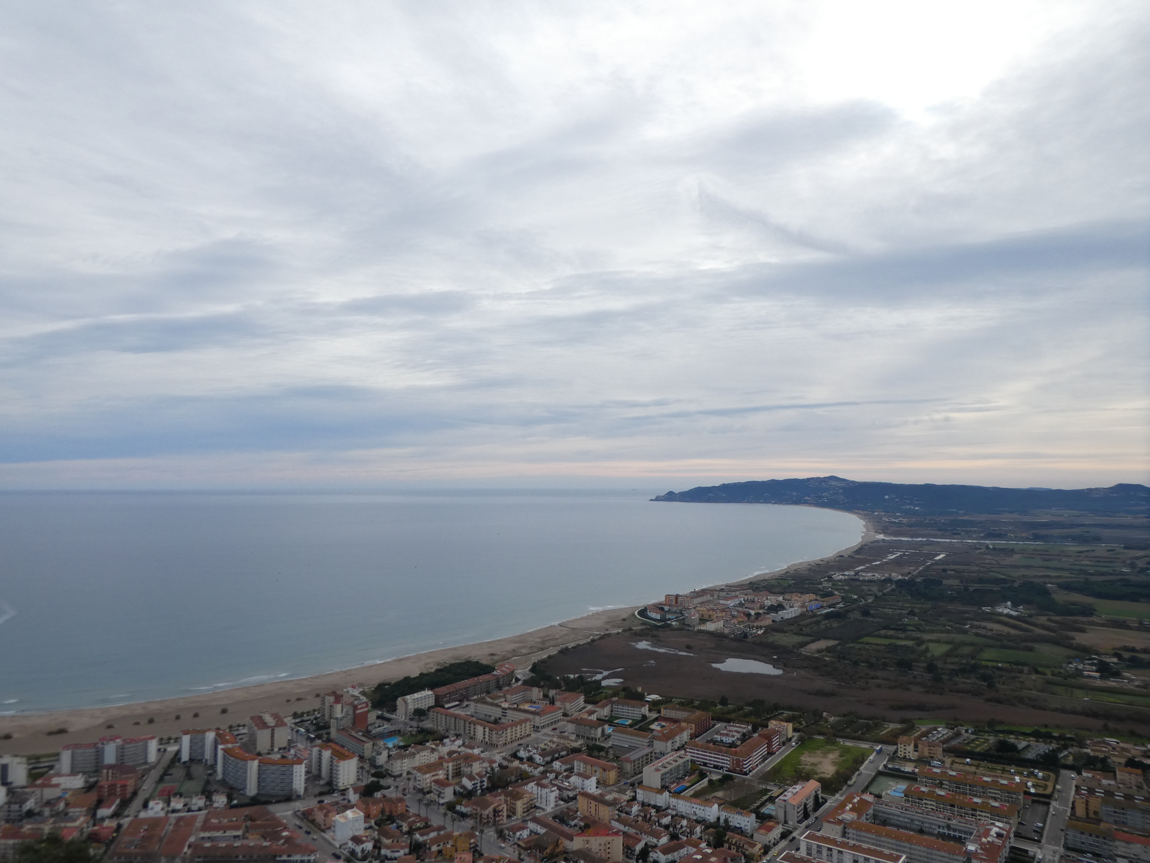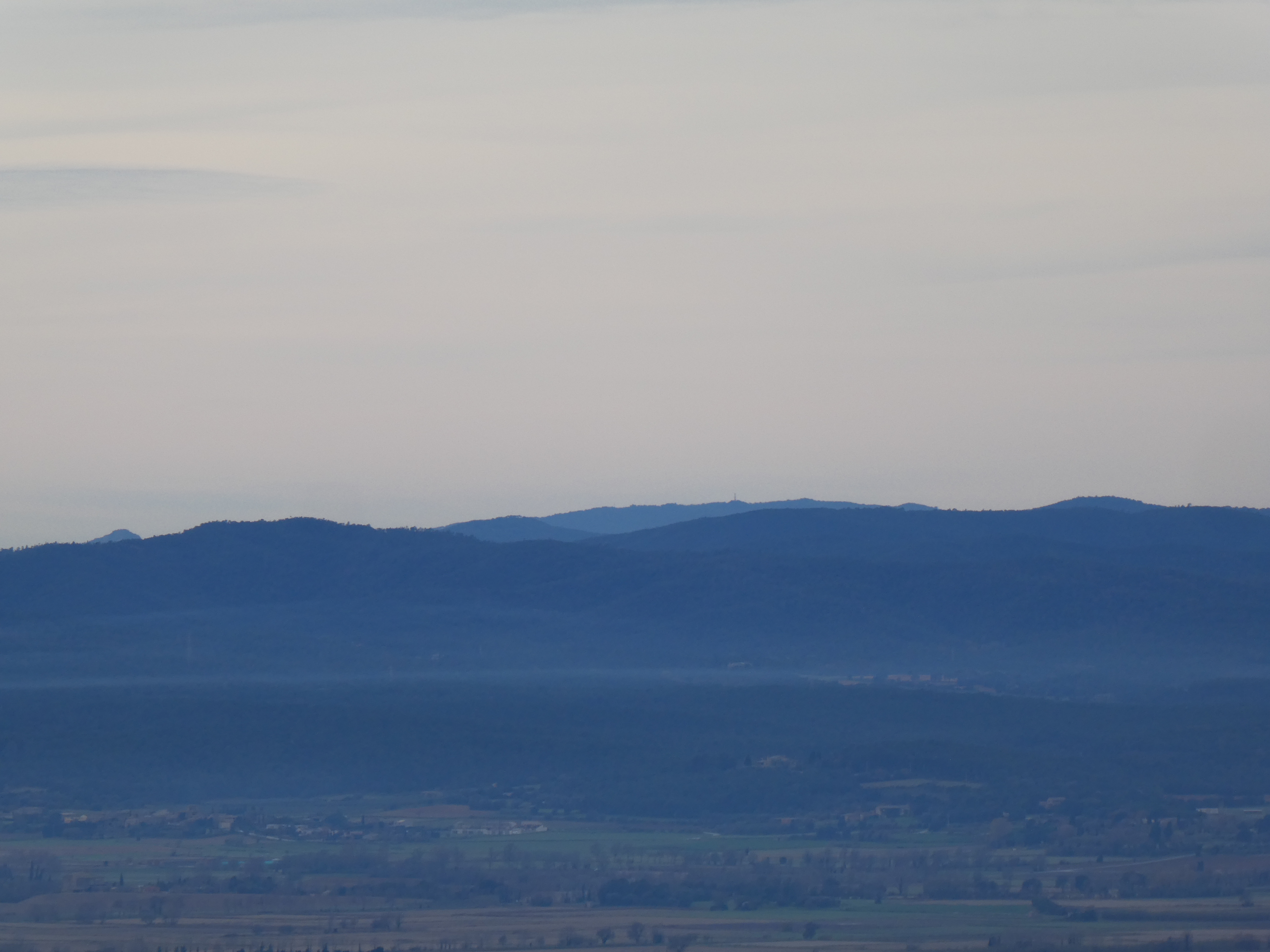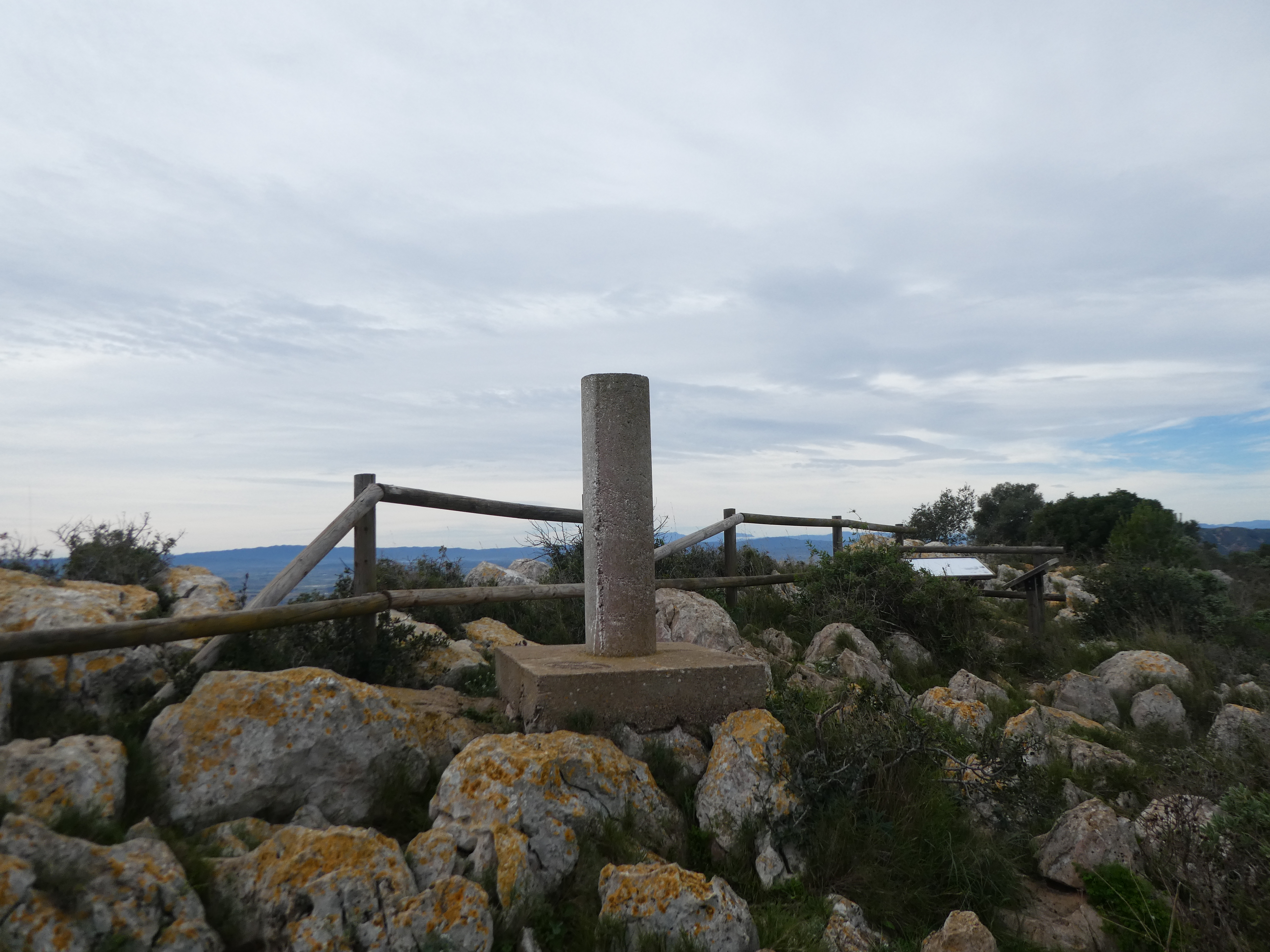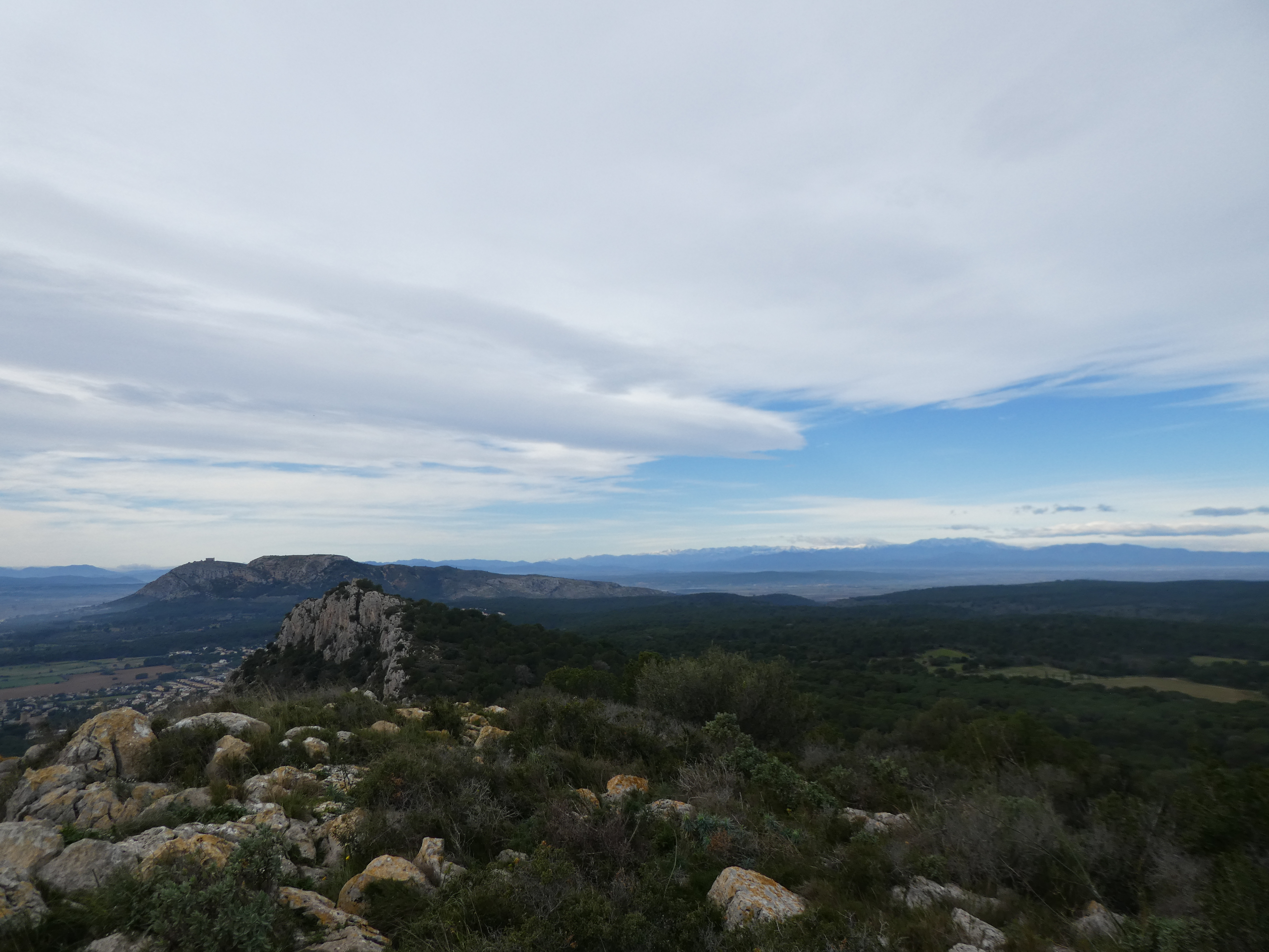 Arrivée au sommet de la Roca Maura (225 m) : beau panorama malgré le ciel couvert sur les sommets de l'Empordà, de la Selva, du Ripollès, de la Garrotxa, du Haut-Vallespir, des Albères ainsi que sur la plaine de l'Empordà et du Ter