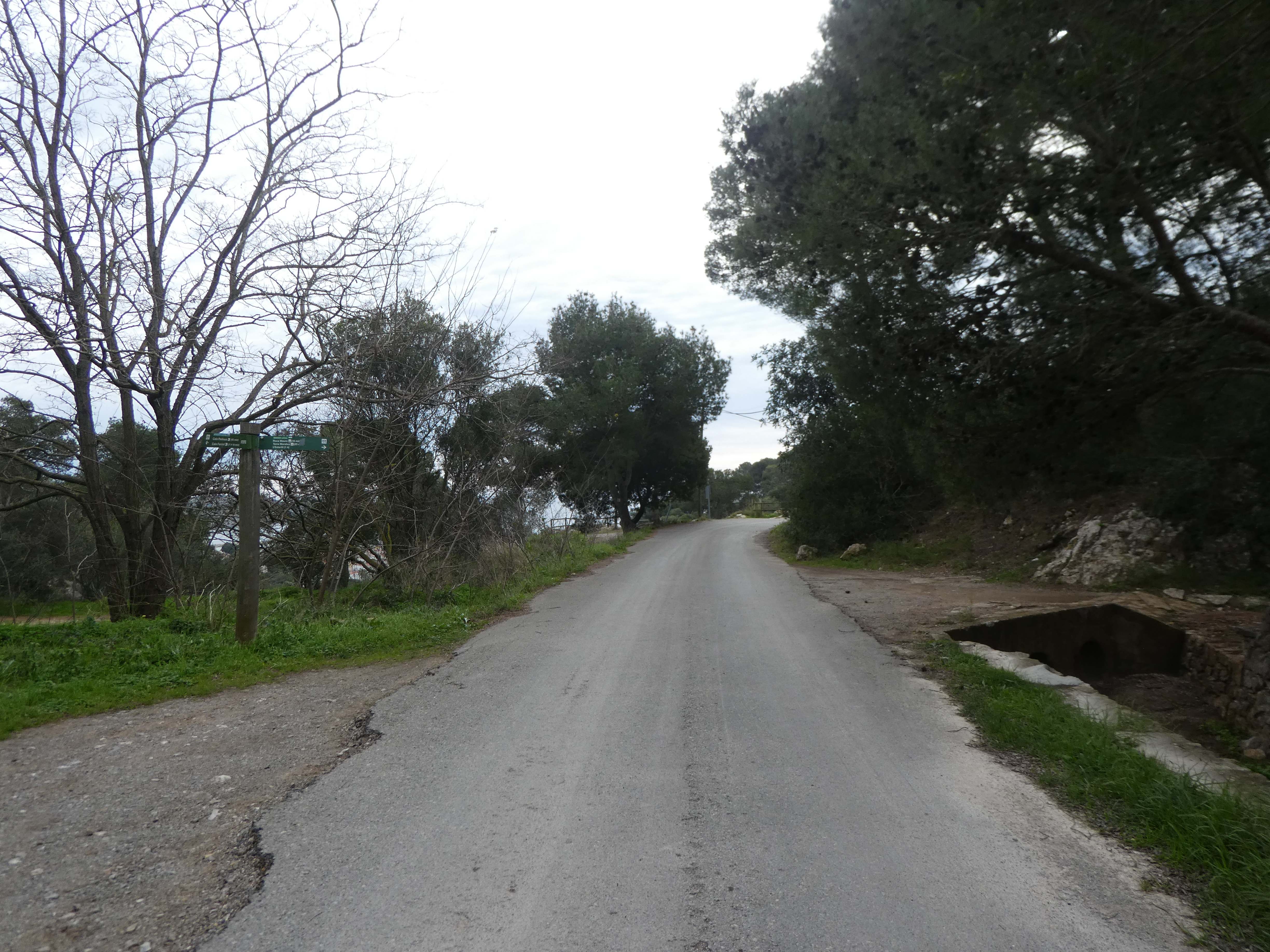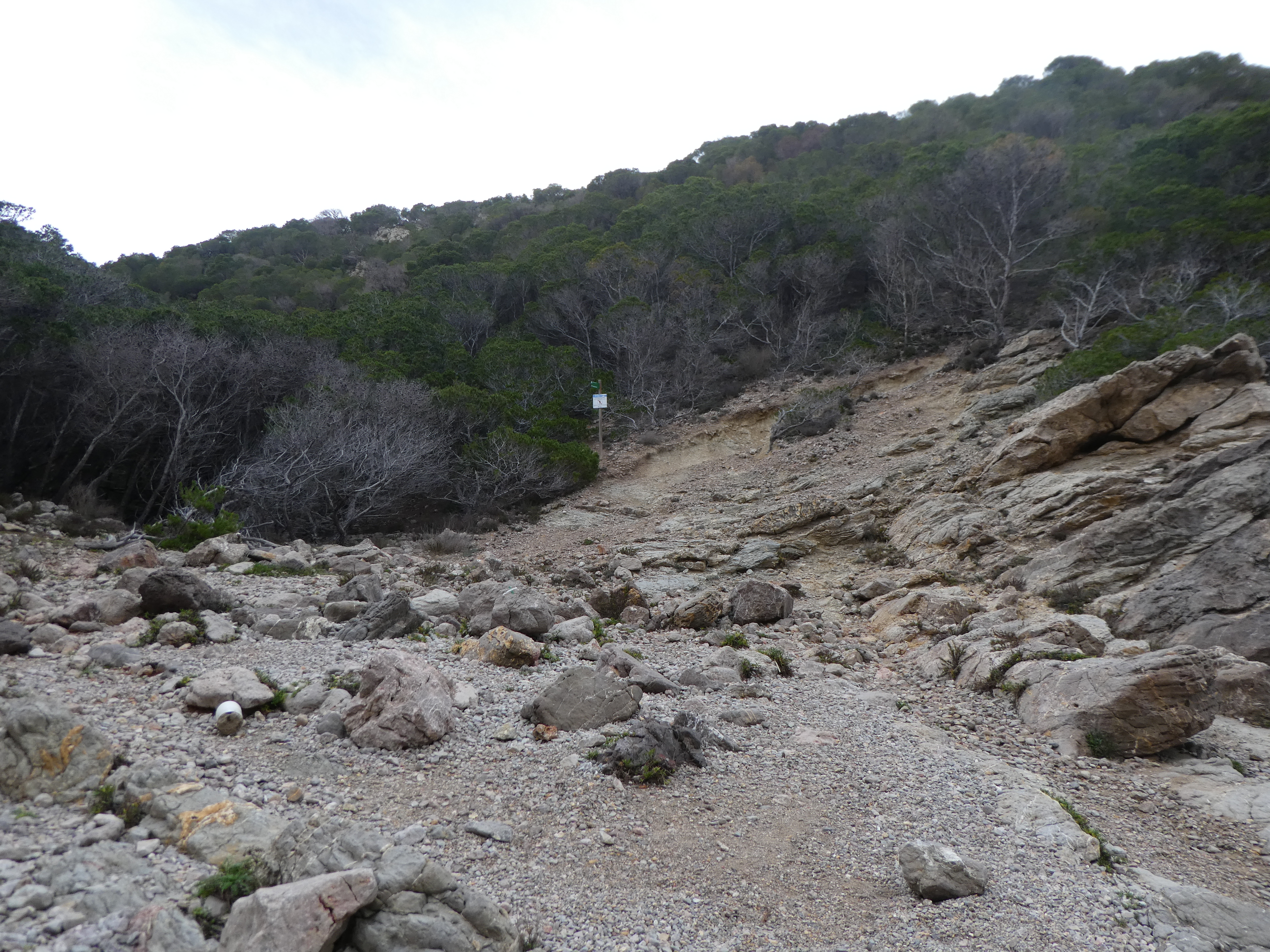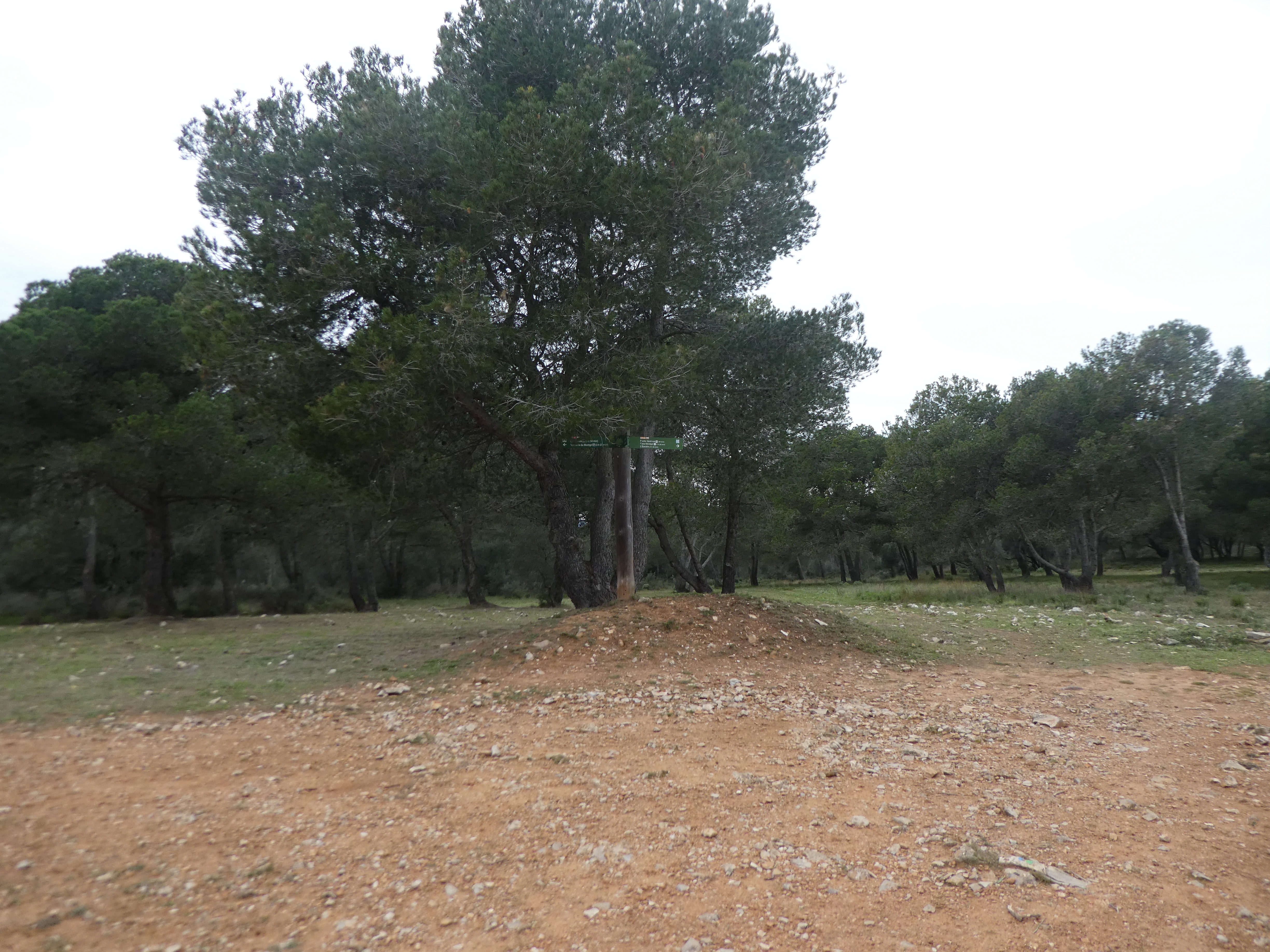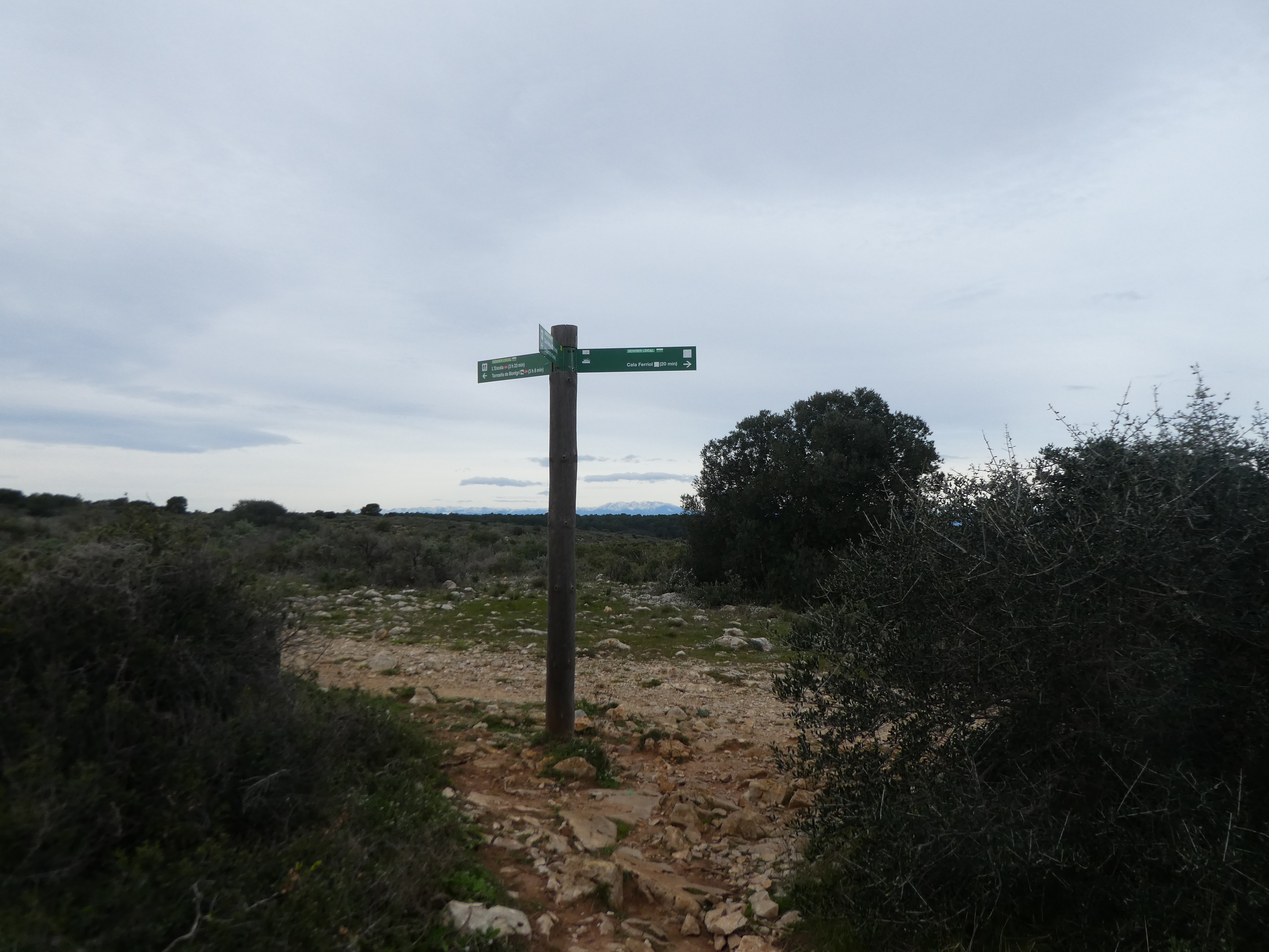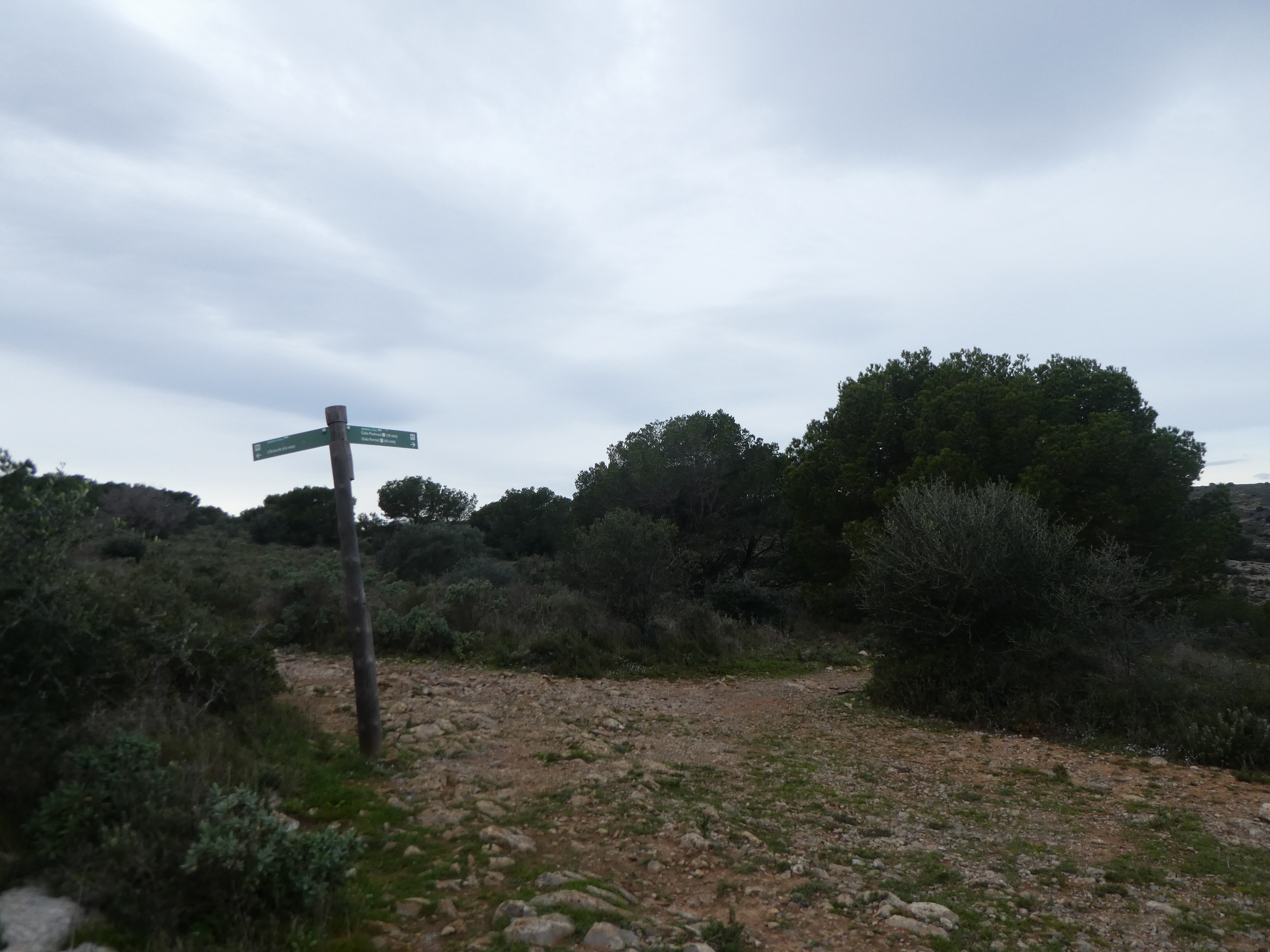 A ce croisement avec l'itinéaire balisé en vert et blanc venant de l'Estartit marqué par la présence d'un panneau directionnel (600 mètres après le précédent), suivre ce dernier partant sur la droite direction Cala Pedrosa, balisé en vert et blanc, et en points bleus et verts dorénavant (ceux qui auraient suivi l'itinéraire de montée vers la Cala Pedrosa depuis l'Estartit sans passer par la Cala Calella et le Port del Falaguer devraient se retrouver ici)