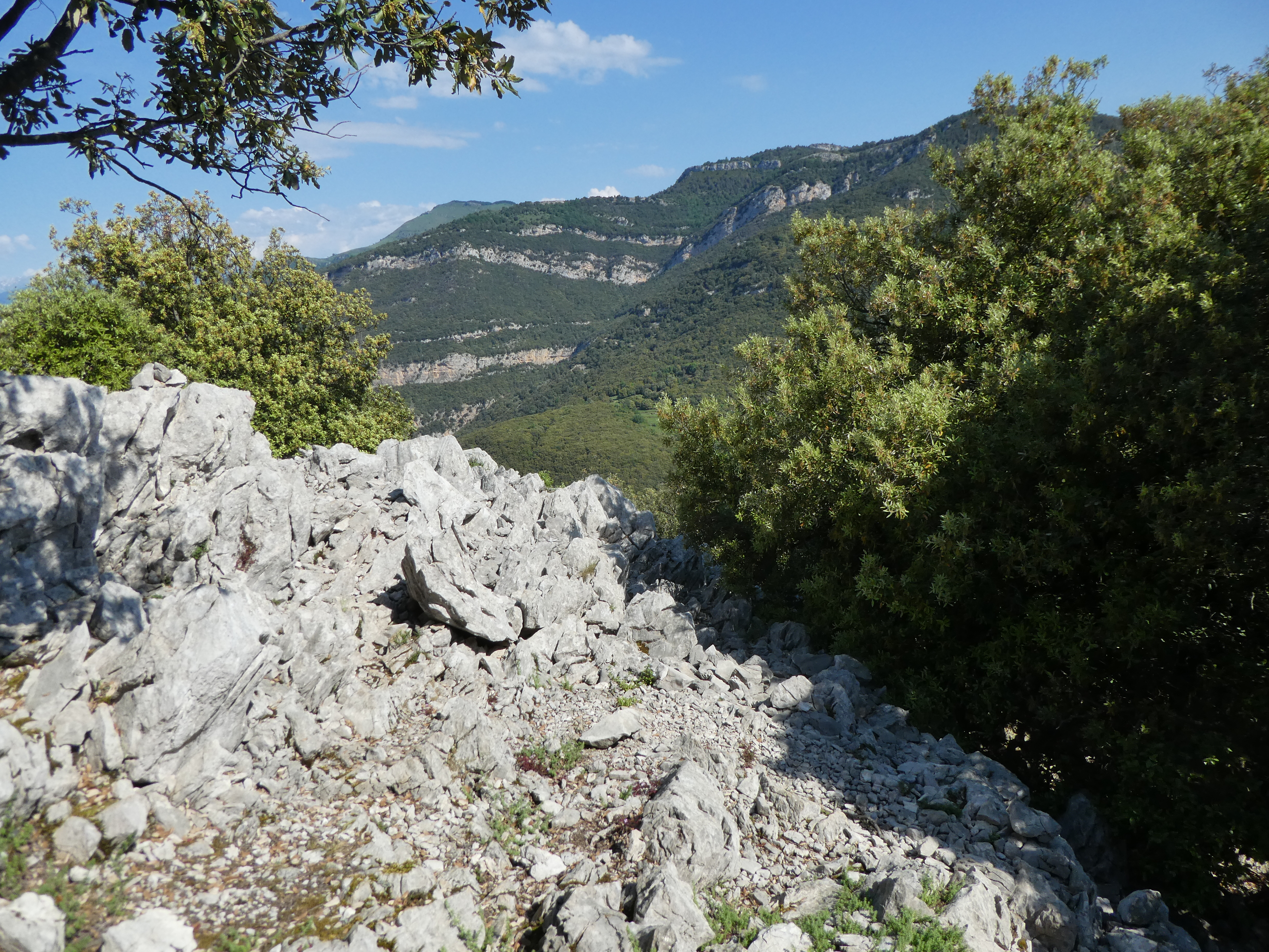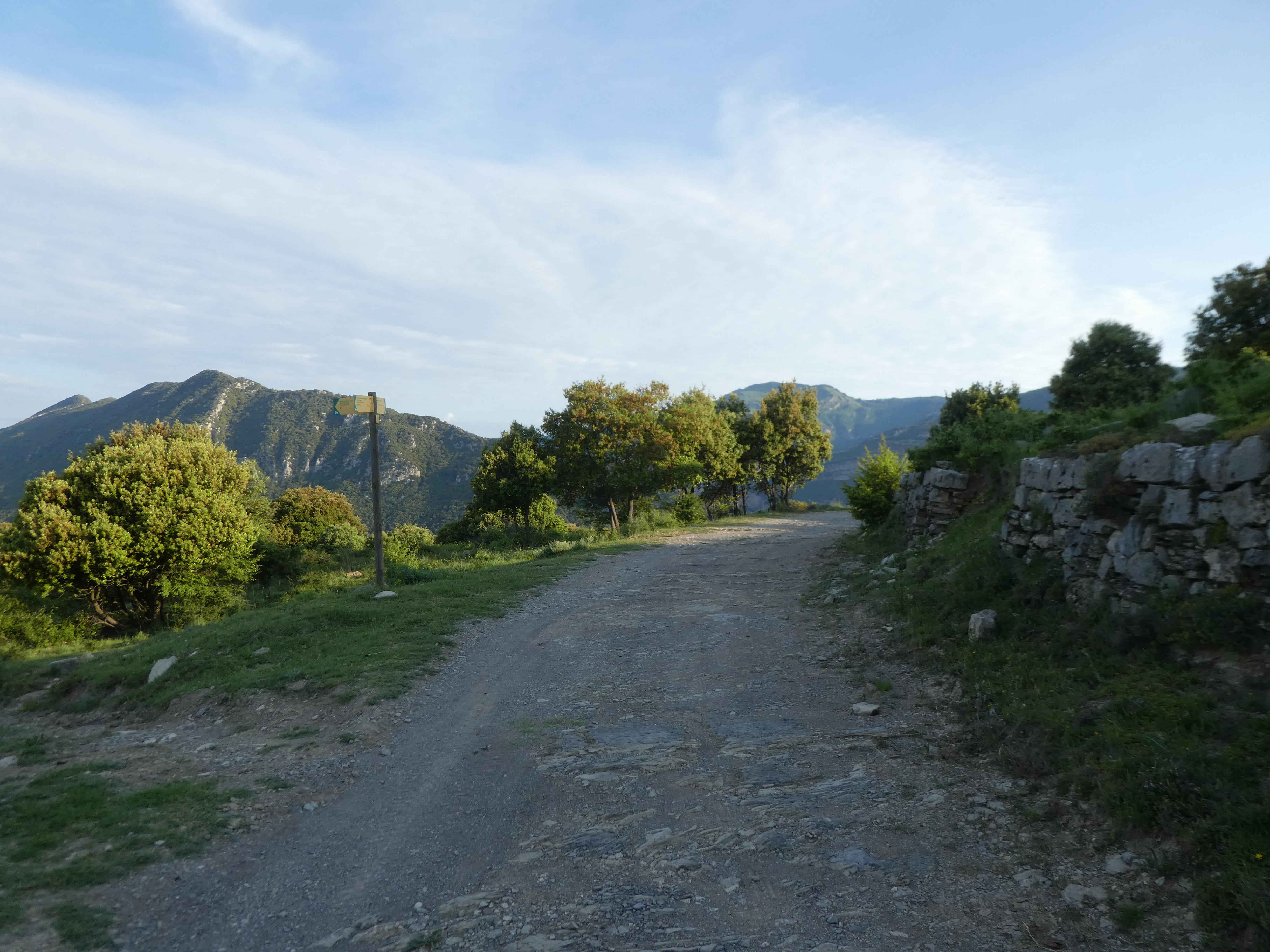 A ce croisement cairné marqué par la présence de directions peintes en bleu sur les rochers (200 mètres après le précédent), suivre le chemin montant raidement sur la gauche direction Coll de Terres (le chemin partant tout droit mène au Coll de la Bassa)