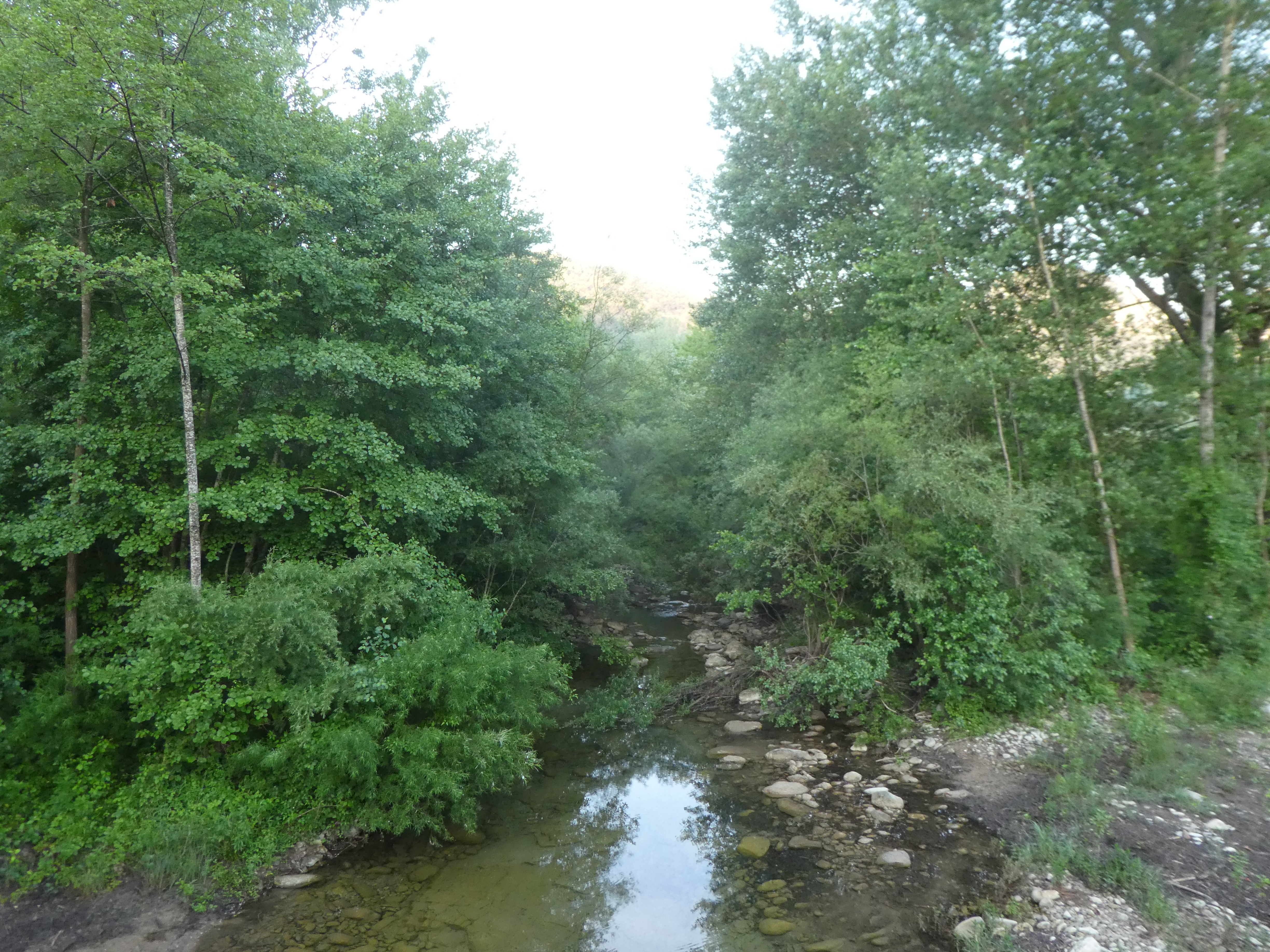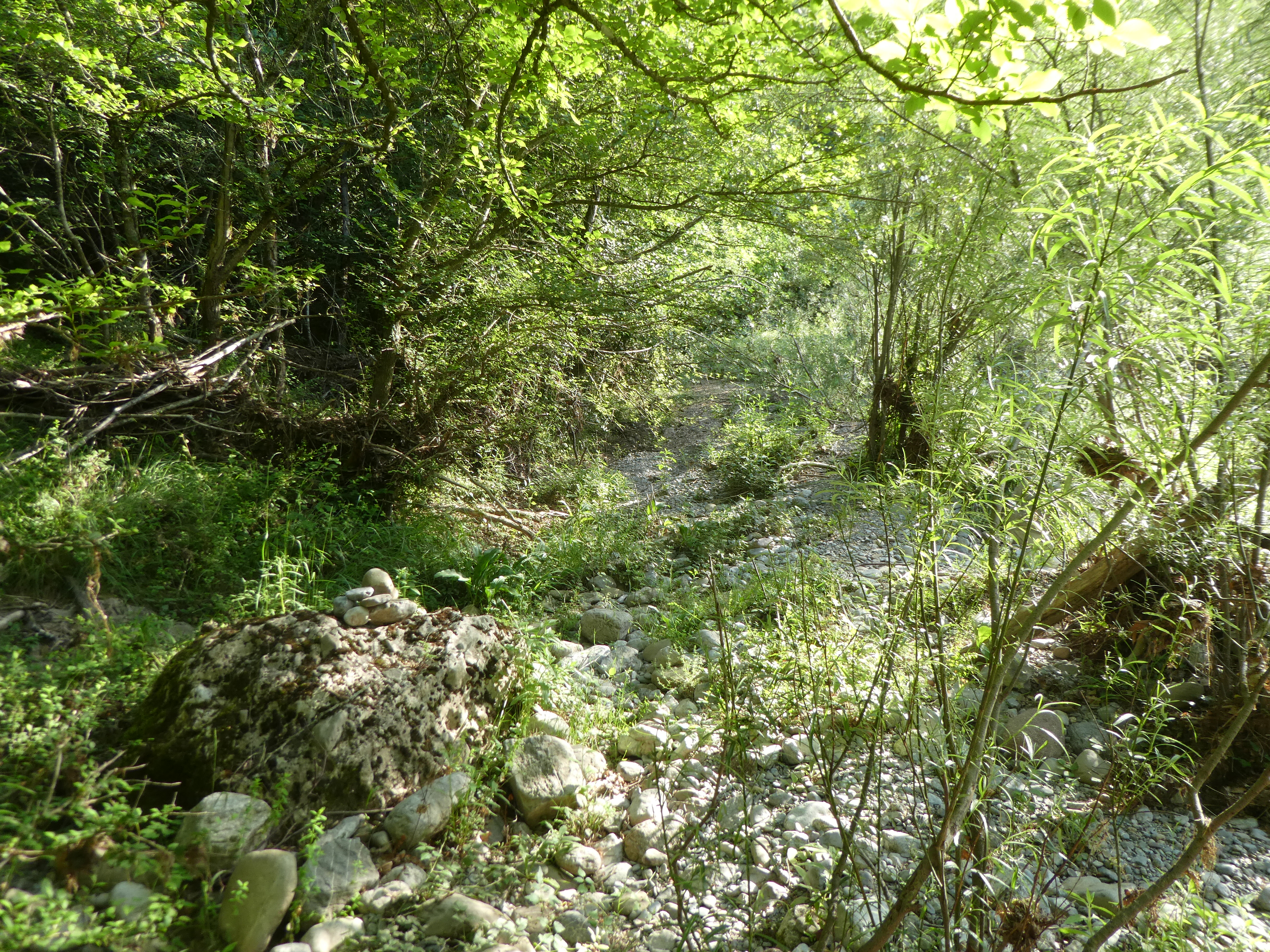 Au niveau de ce passage à gué de la Riera d'Escales (1800 mètres après le lieu-dit "la Sala"), traverser la rivière puis suivre le semblant de chemin partant sur la droite rive droite de la Riera d'Escales direction Ermita de la Mare de Déu d'Escales