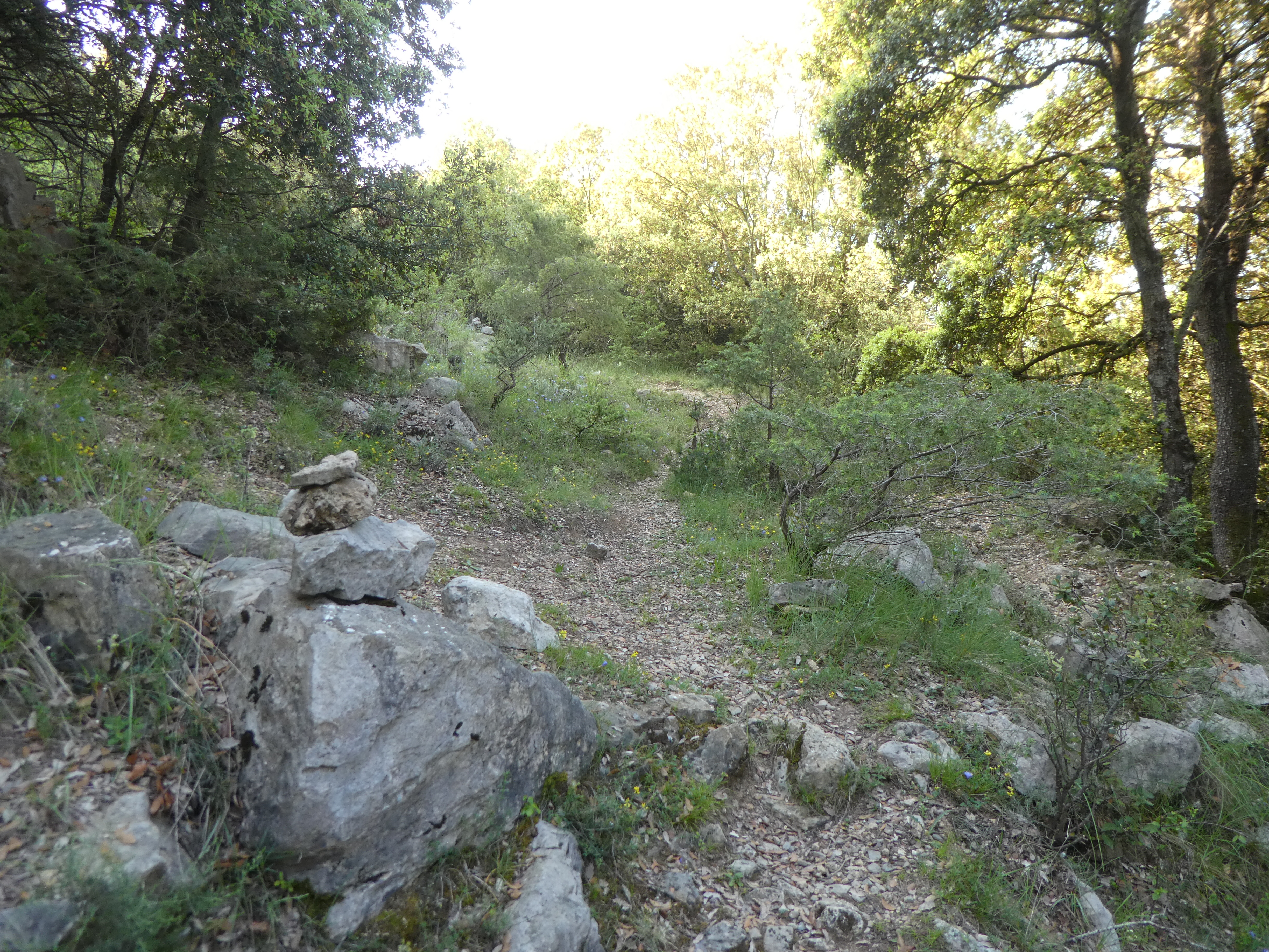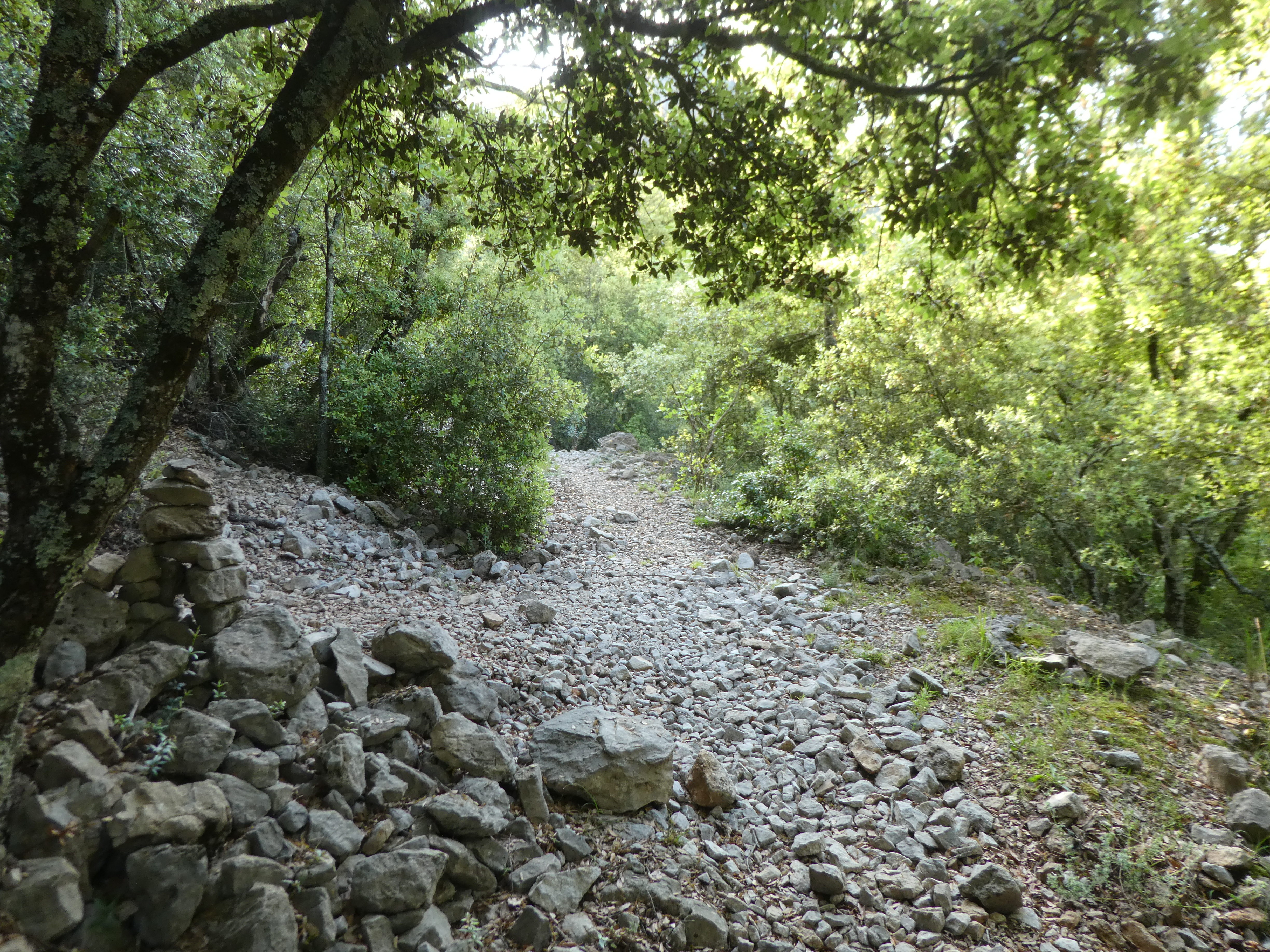 A ce croisement cairné avec le chemin montant à l'Ermita de la Mare de Déu d'Escales (50 mètres après le passage à gué), suivre ce dernier partant sur la gauche direction Ermita de la Mare de Déu d'Escales