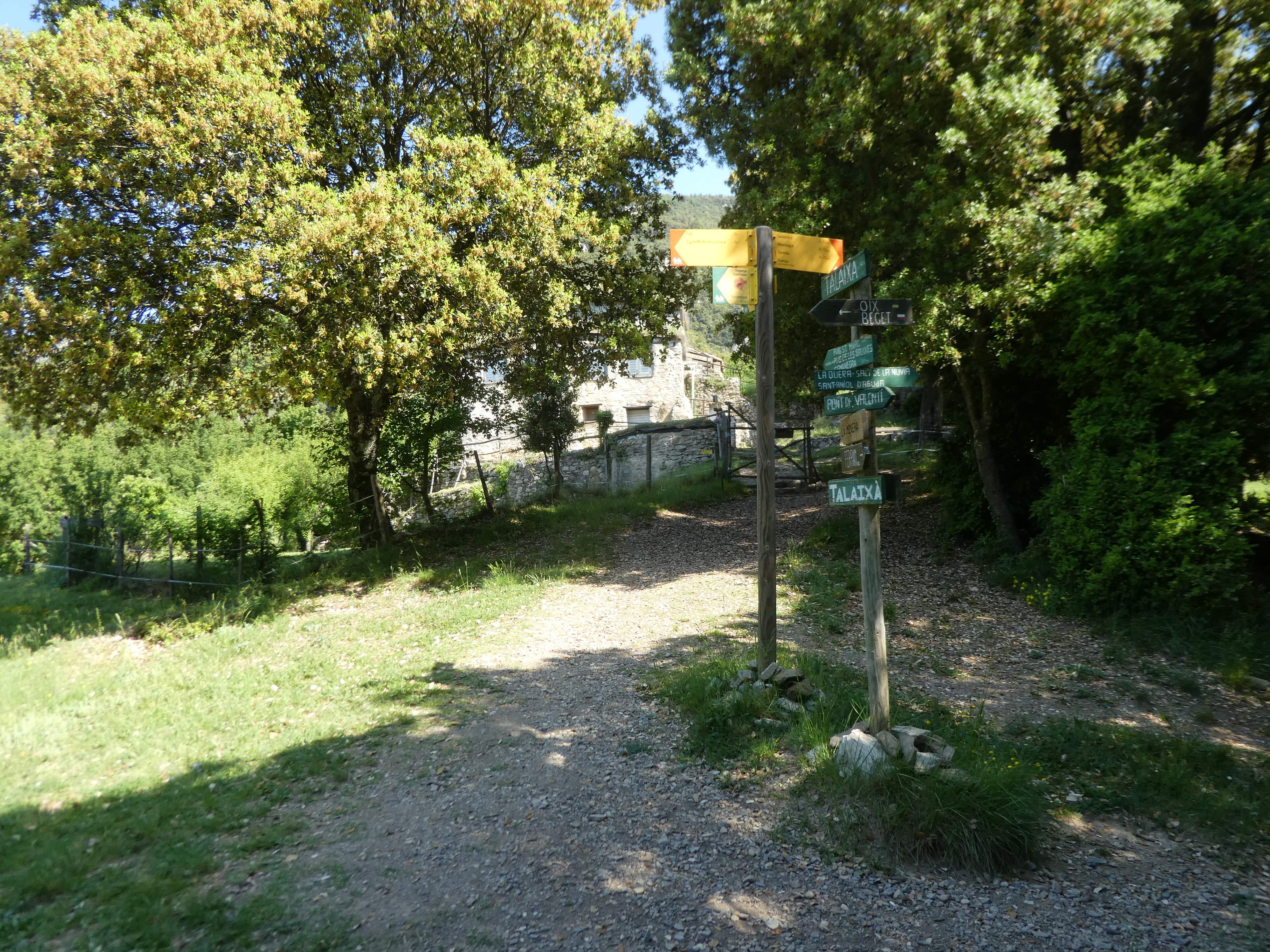 Talaixà (755 m) : suivre le GR11 partant sur la gauche direction Oix, balisé en rouge et blanc, et en jaune dorénavant