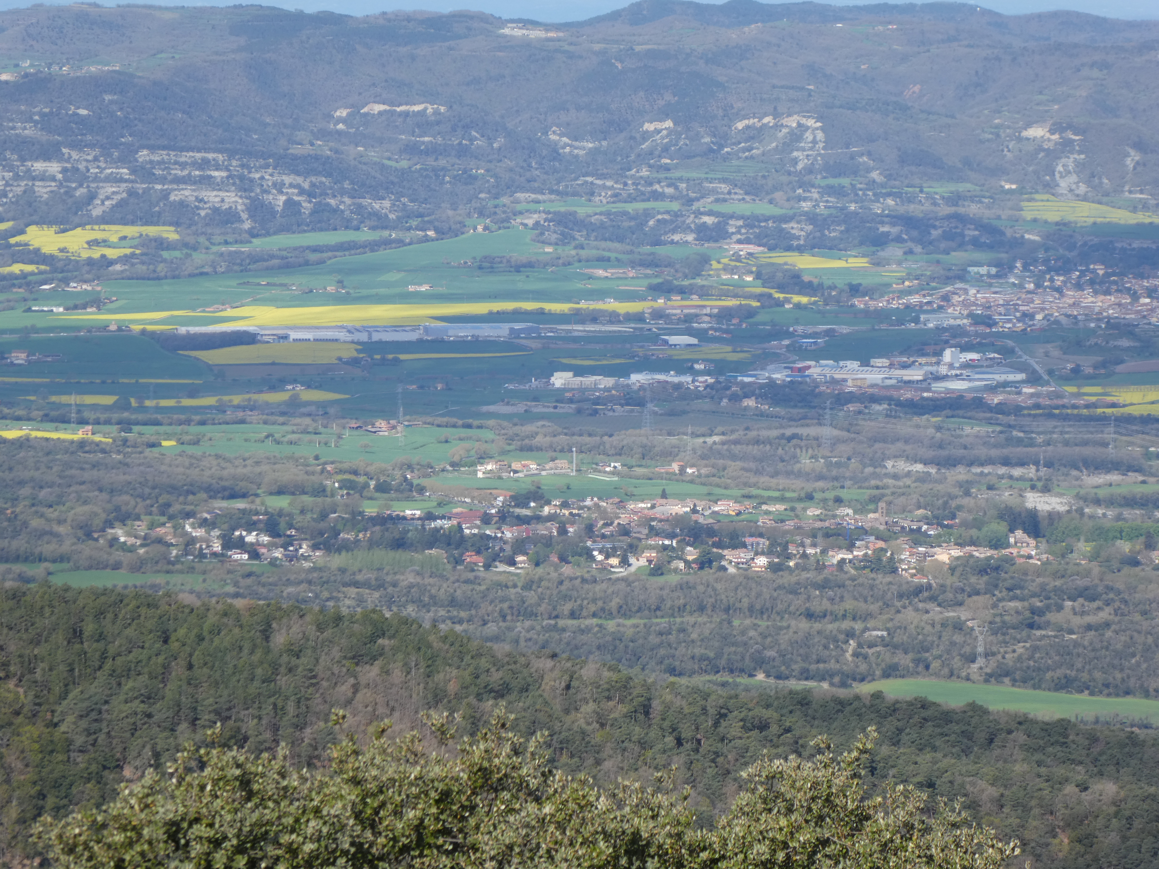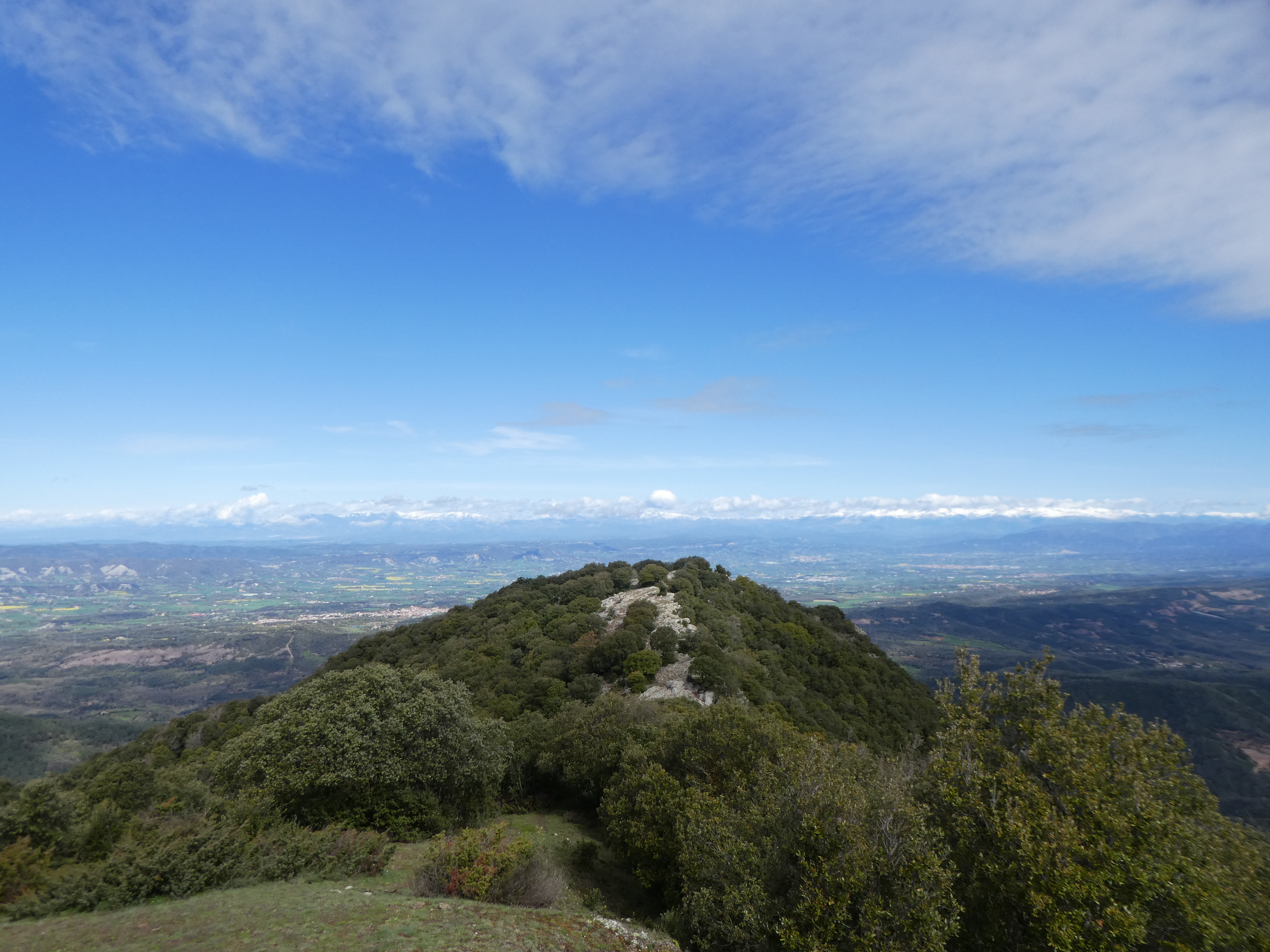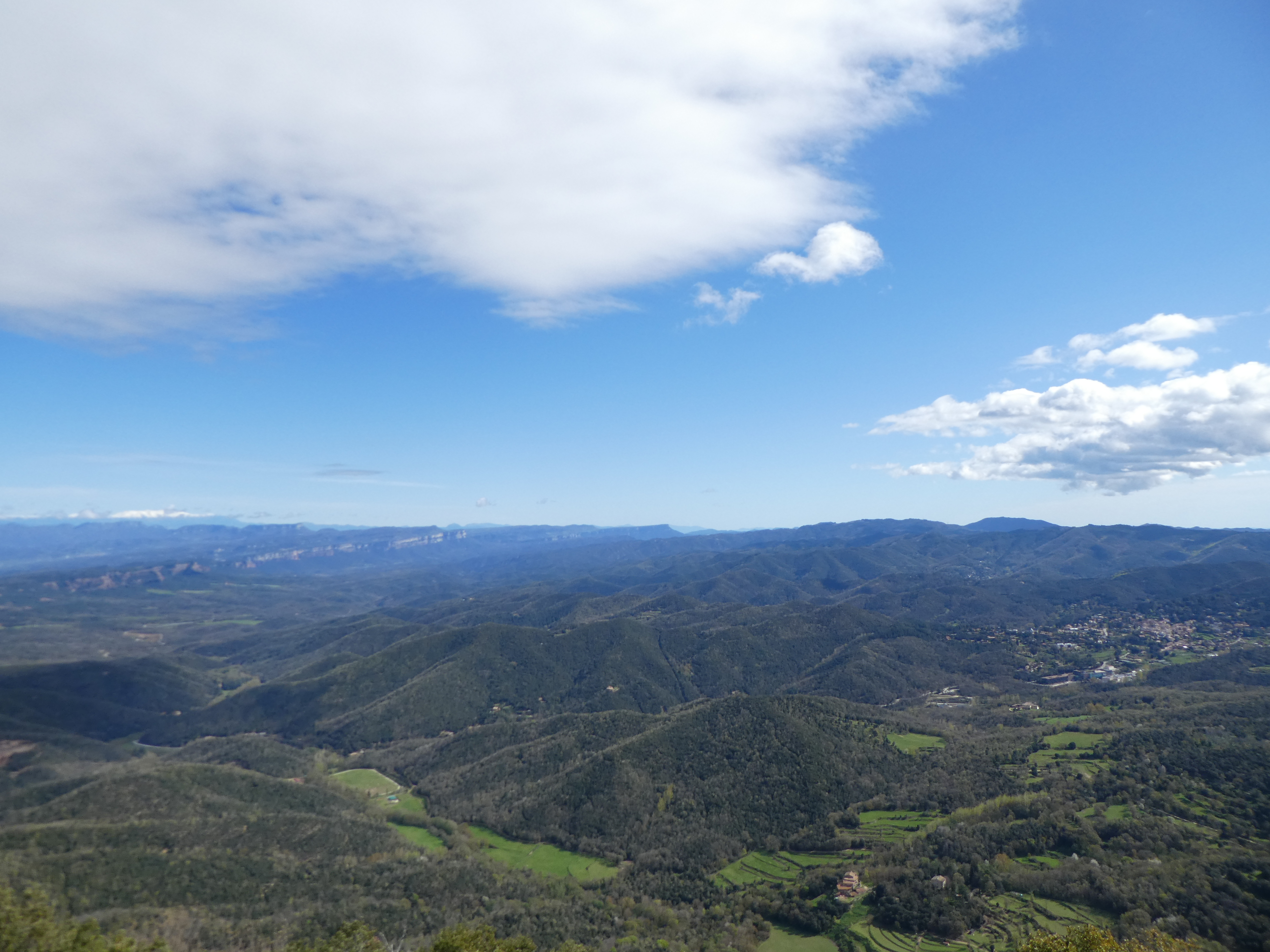 Arrivée au sommet du Turó de la Terma d'en Planes (1263 m) : beau panorama sur les sommets de l'Osona, du Vallès Oriental et Occidental et du Bages, de l'Empordà ainsi que sur la plaine de Vic