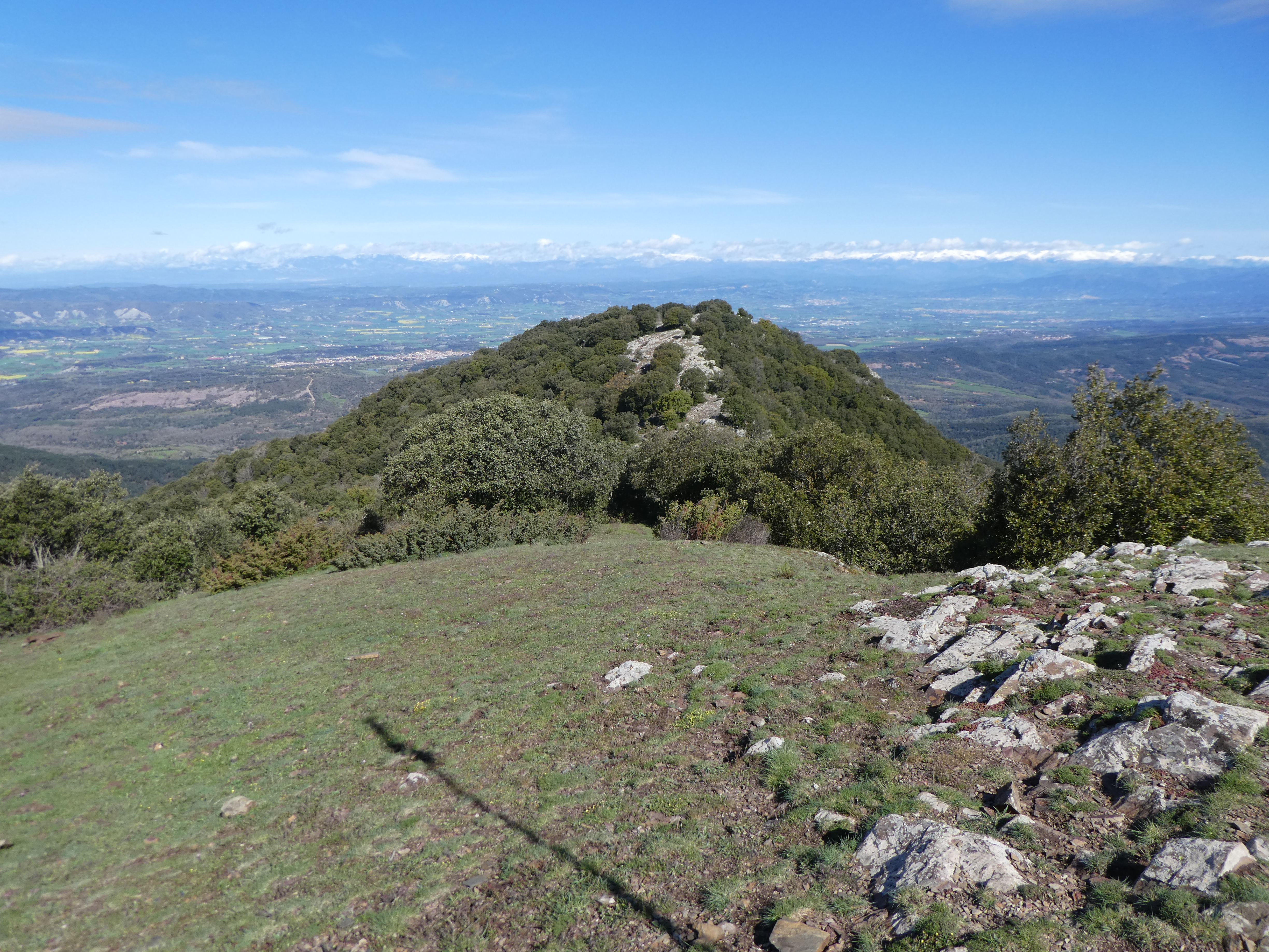 Arrivée au sommet du Serrat de l'Oriol (1191 m) : beau point de vue sur les sommets du Bages, du Moianès, du Berguedà, du Lluçanès, de la Cerdanya, de la Haute-Cerdagne, du Ripollès et du Haut-Vallespir