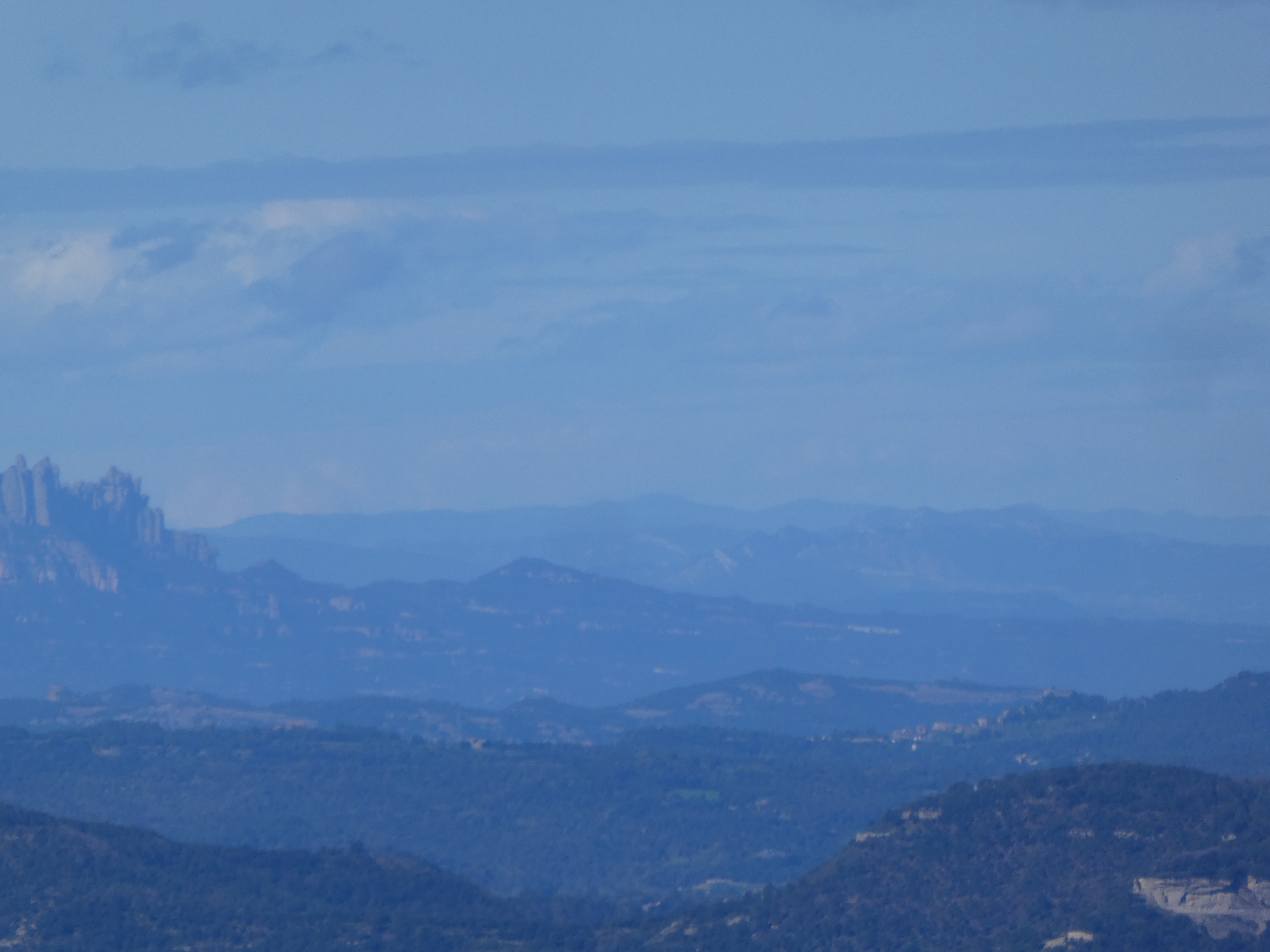 Zoom sur le massif du Montserrat avec la Gorria Frígia (1152 m) et la Roca de Sant Salvador (1156 m) à gauche, Sant Jeroni (1256 m) au centre et el Frare (1144 m) à droite
