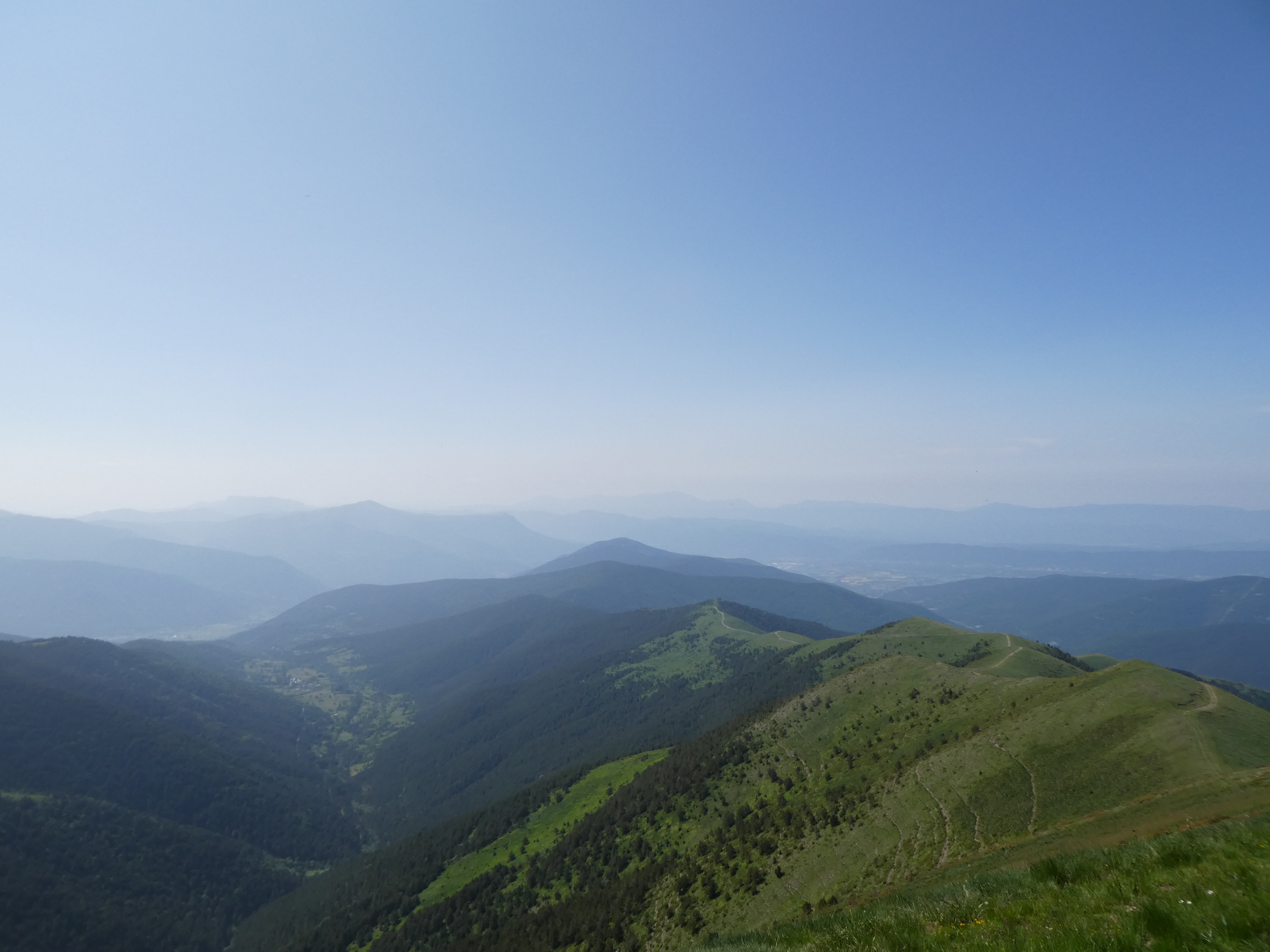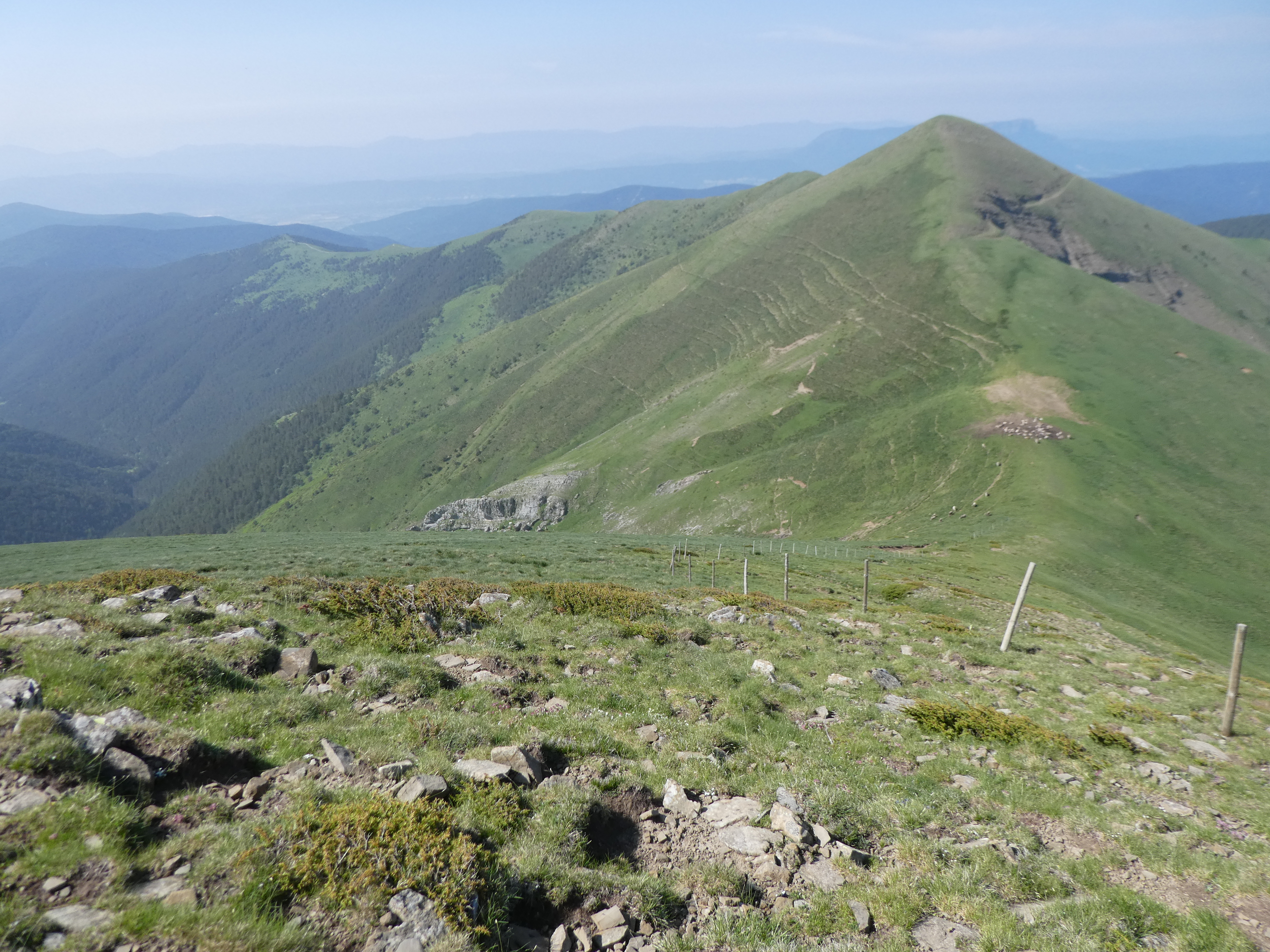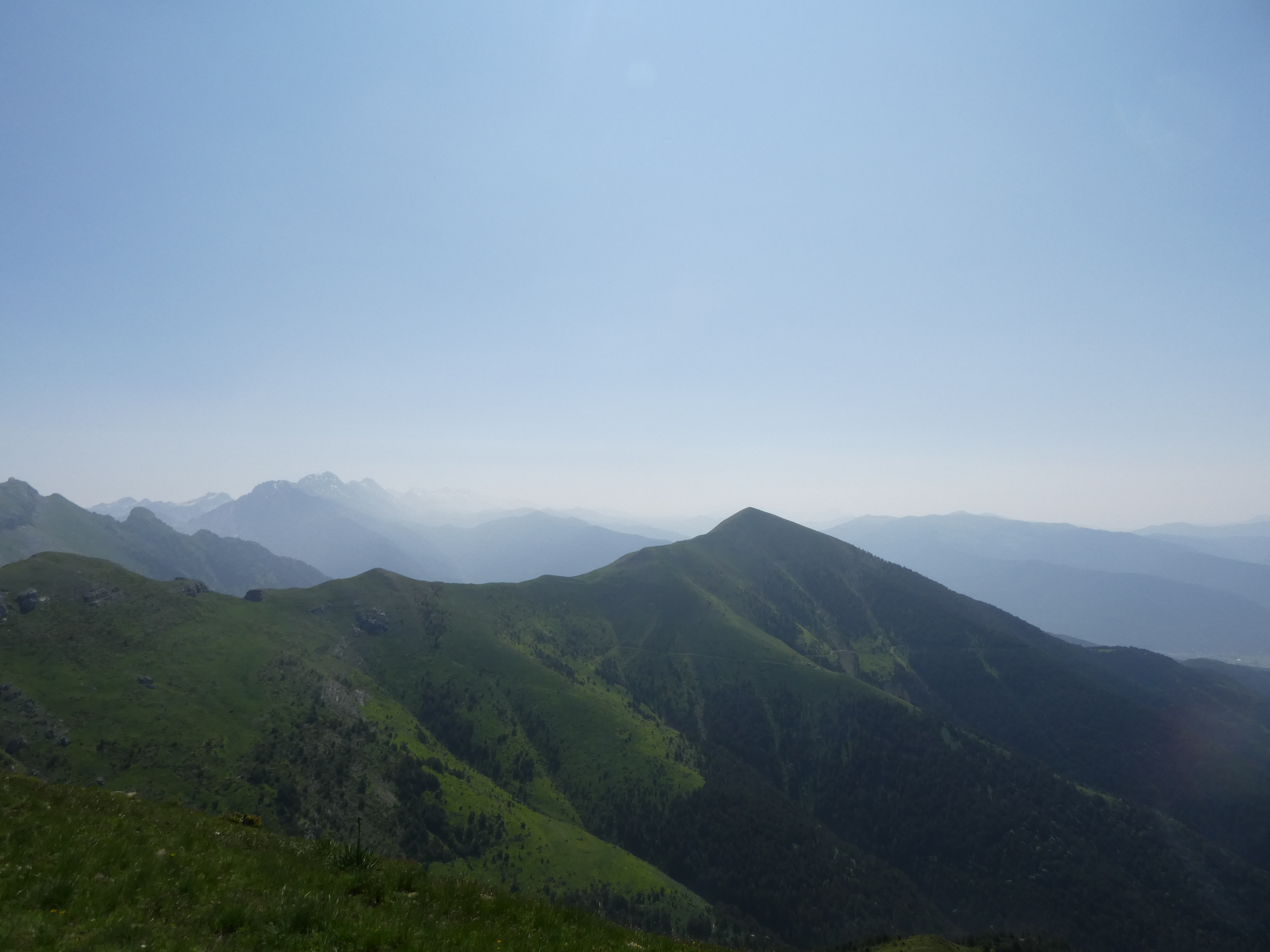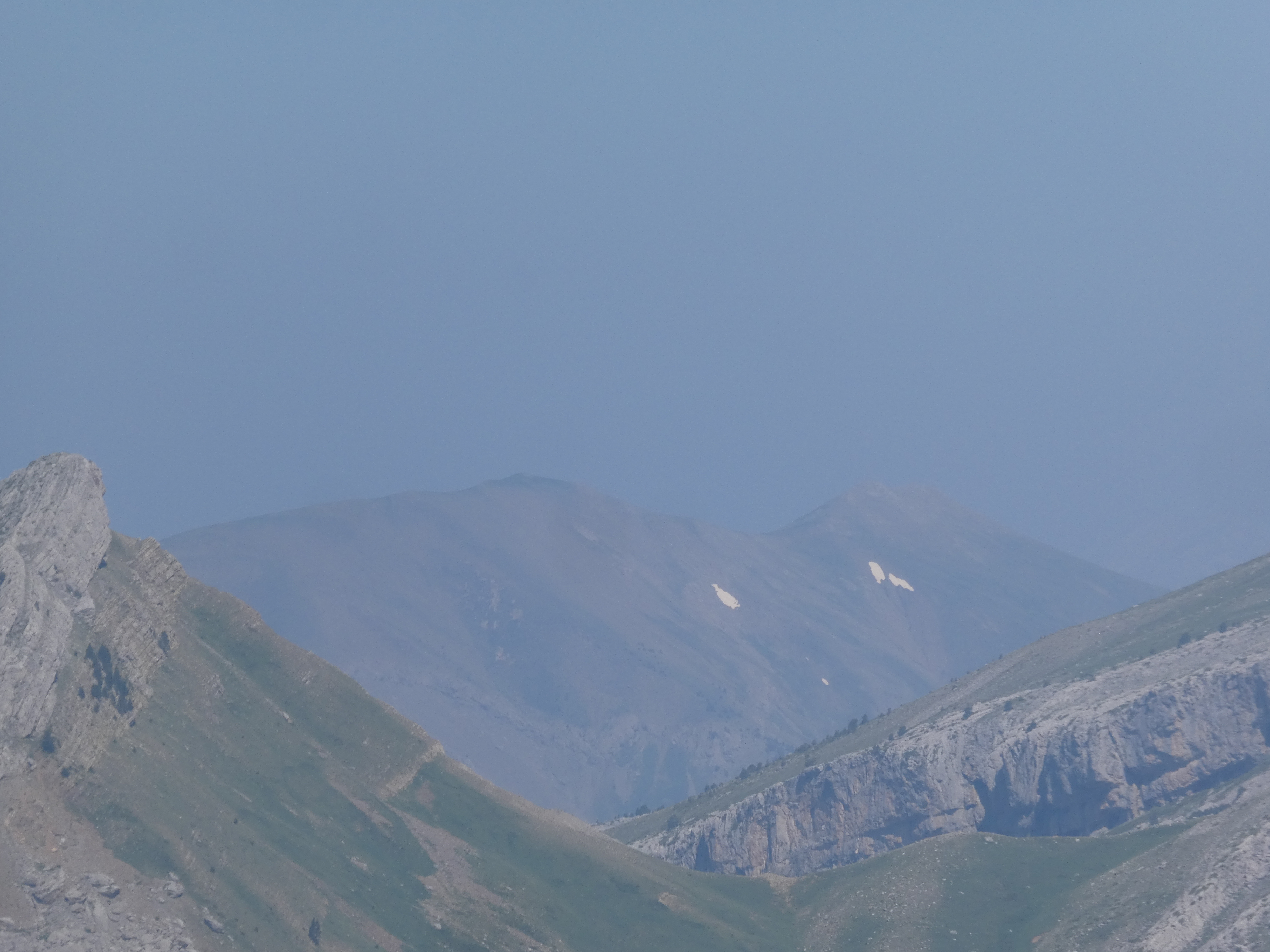 Arrivée au sommet de la Cerruza (2009 m) : beau panorama malgré la présence de brume de chaleur sur les sommets du massif de la Peña Telera, de l'Alto Gállego, du Sobrarbe, de la Jacetania ainsi que sur la Valle de Biescas