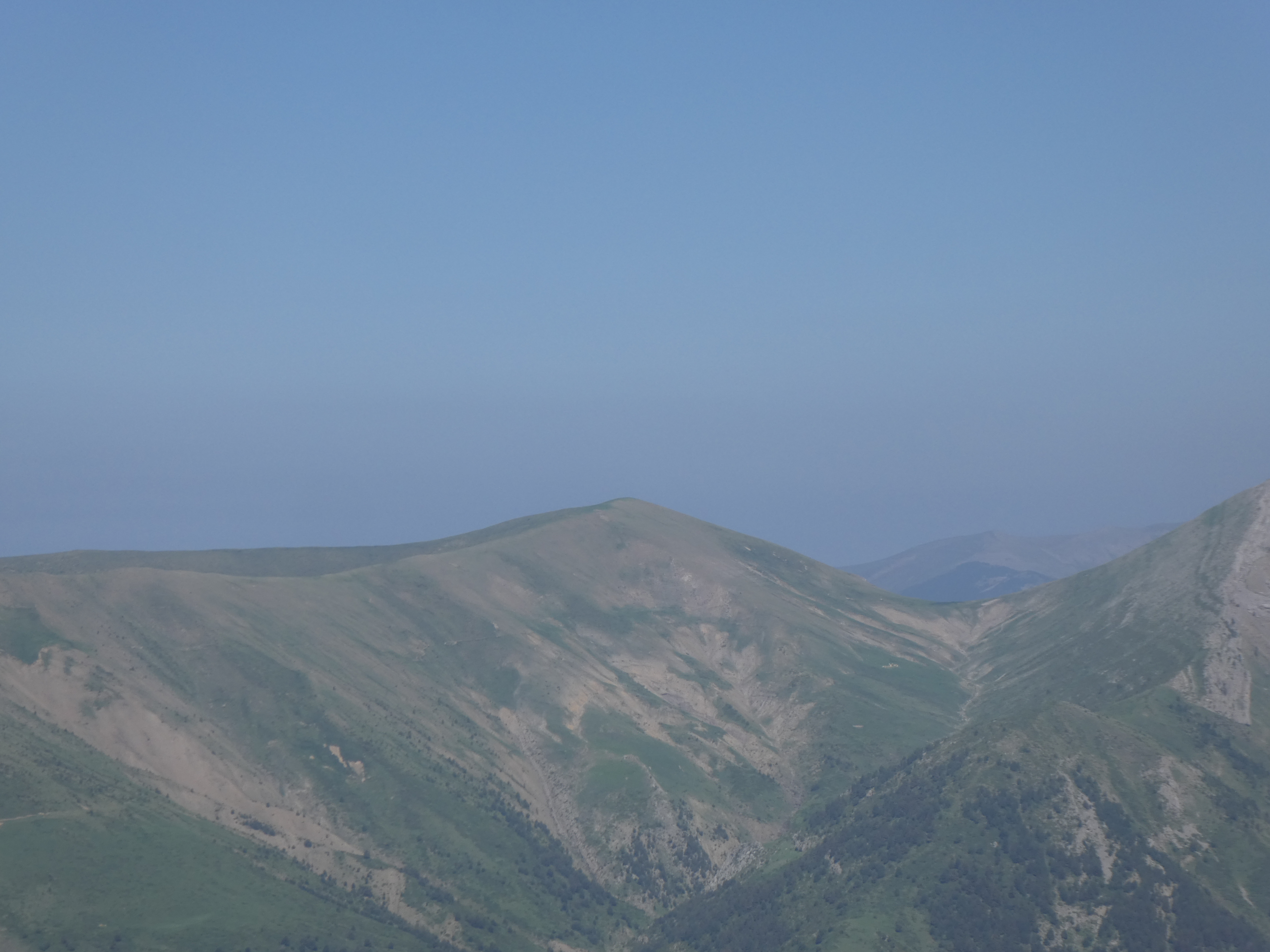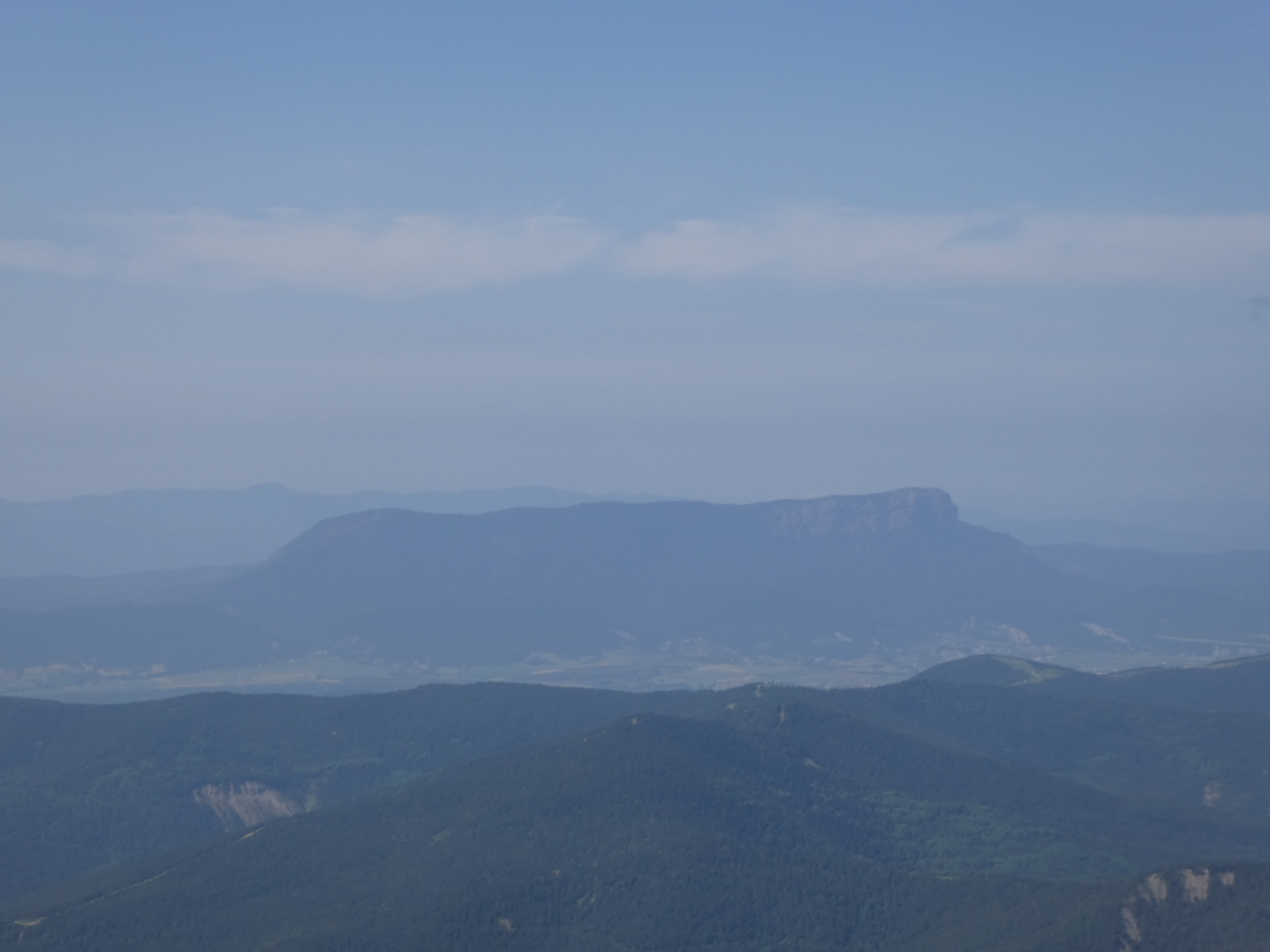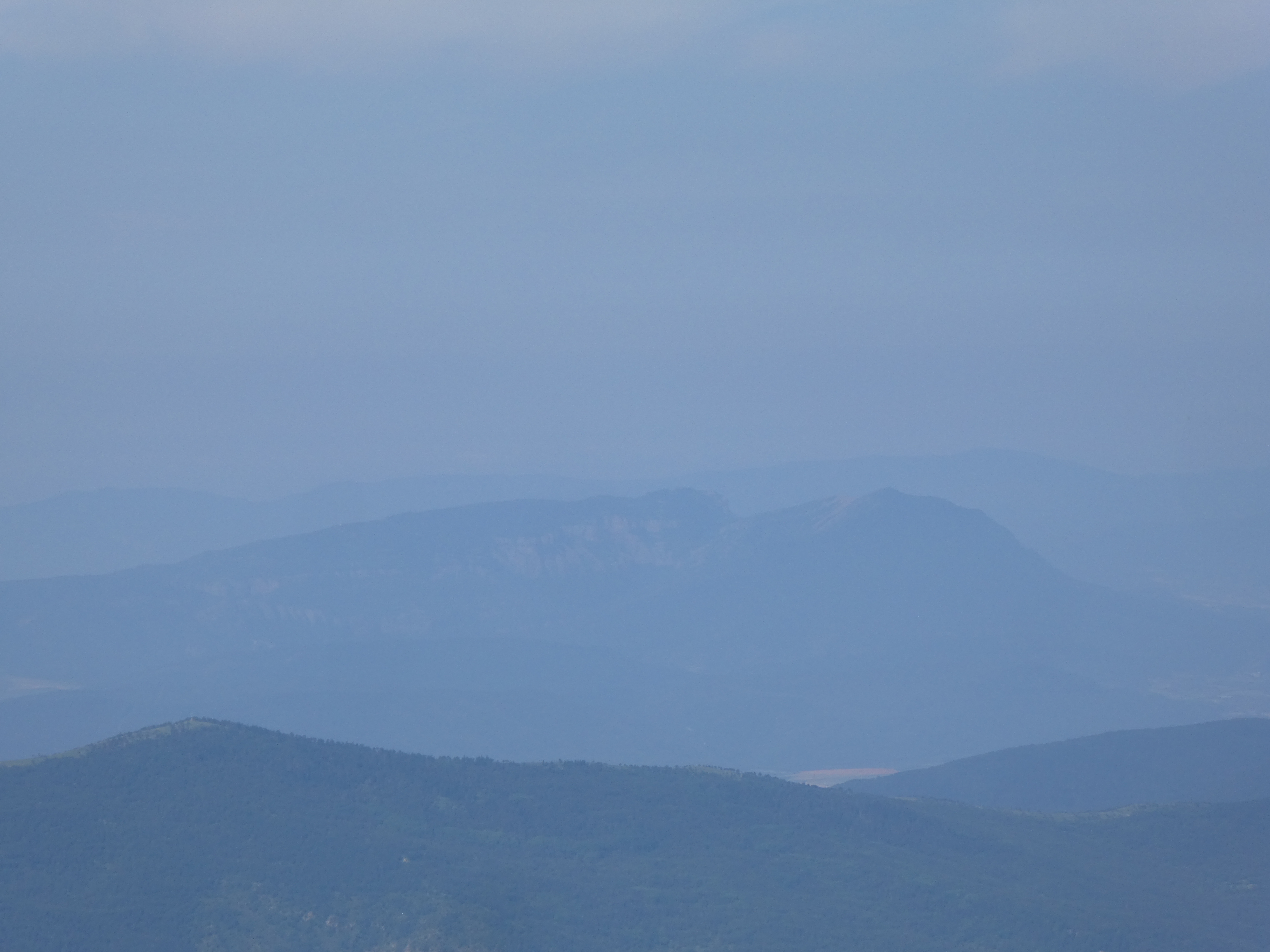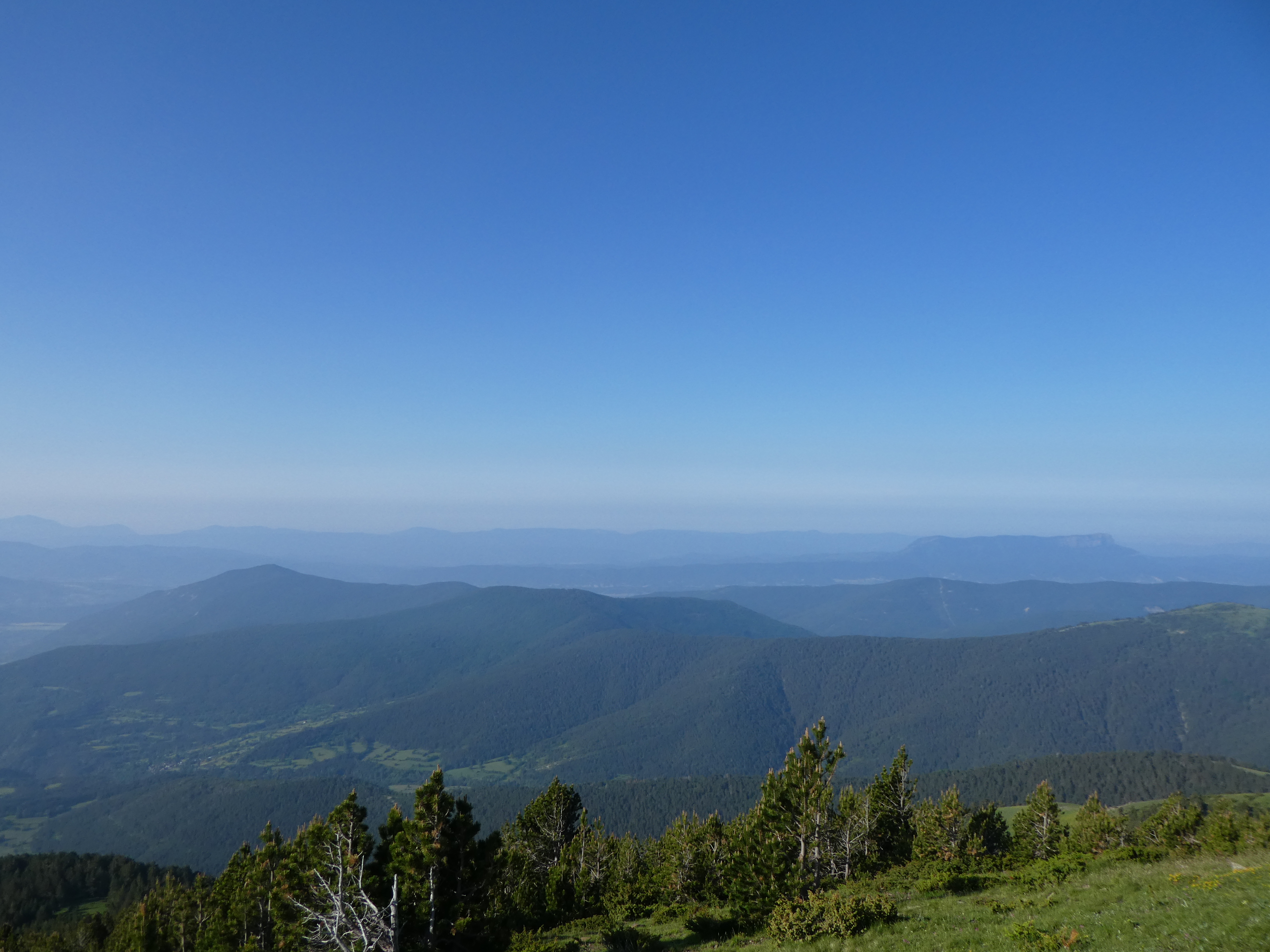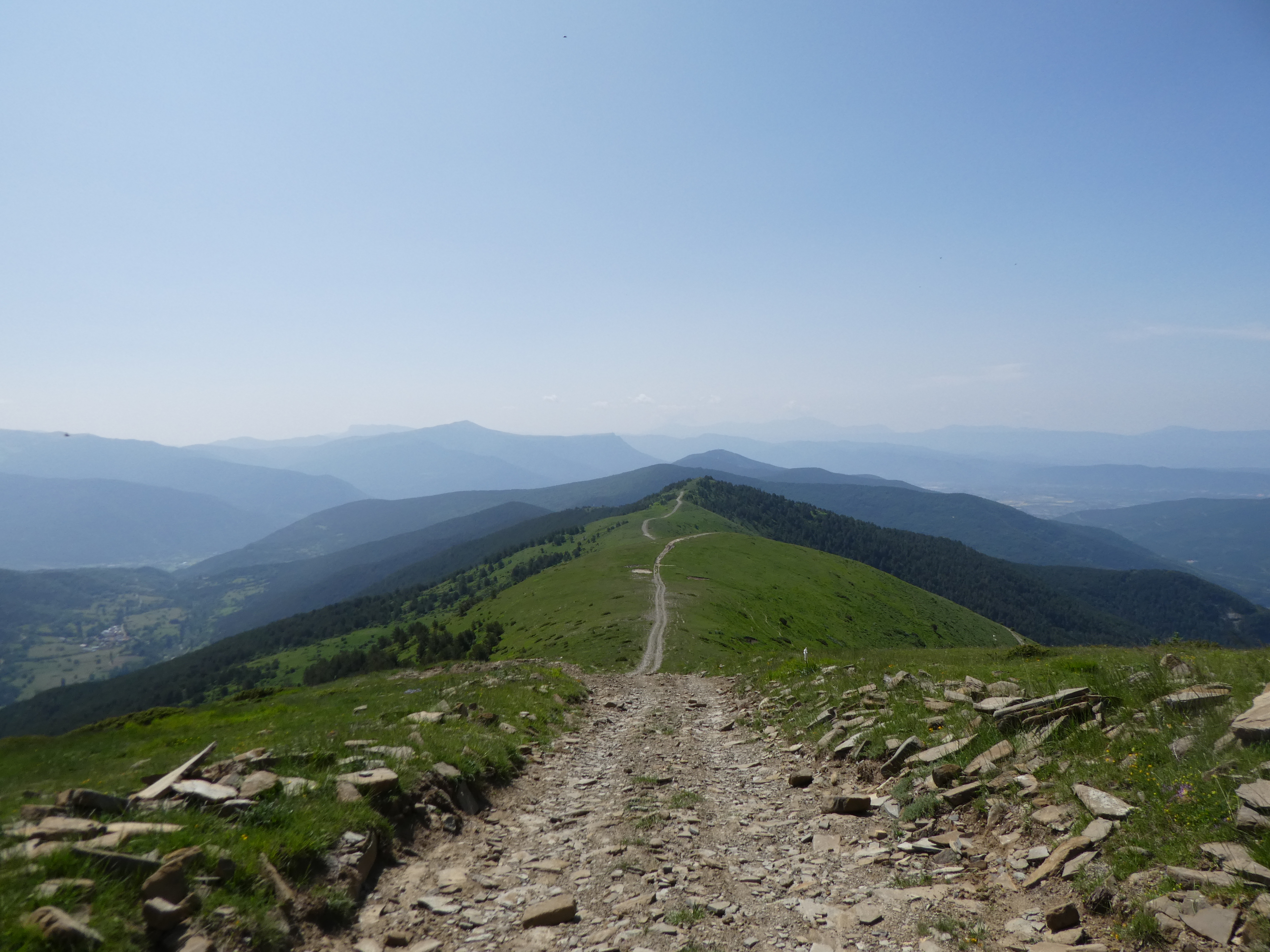 Arrivée au sommet de la Cerruza (2009 m) : beau panorama malgré la présence de brume de chaleur sur les sommets du massif de la Peña Telera, de l'Alto Gállego, du Sobrarbe, de la Jacetania ainsi que sur la Valle de Biescas