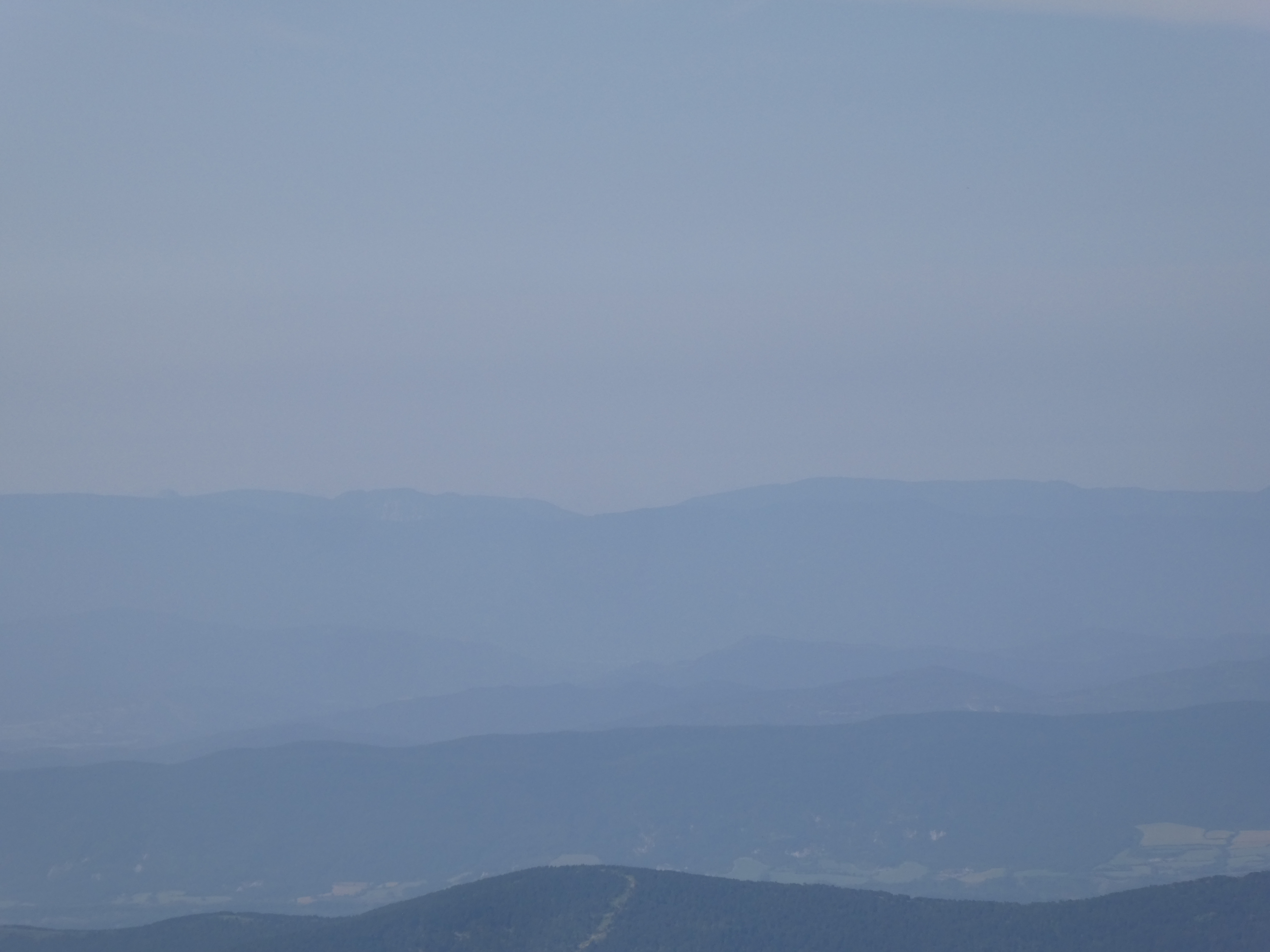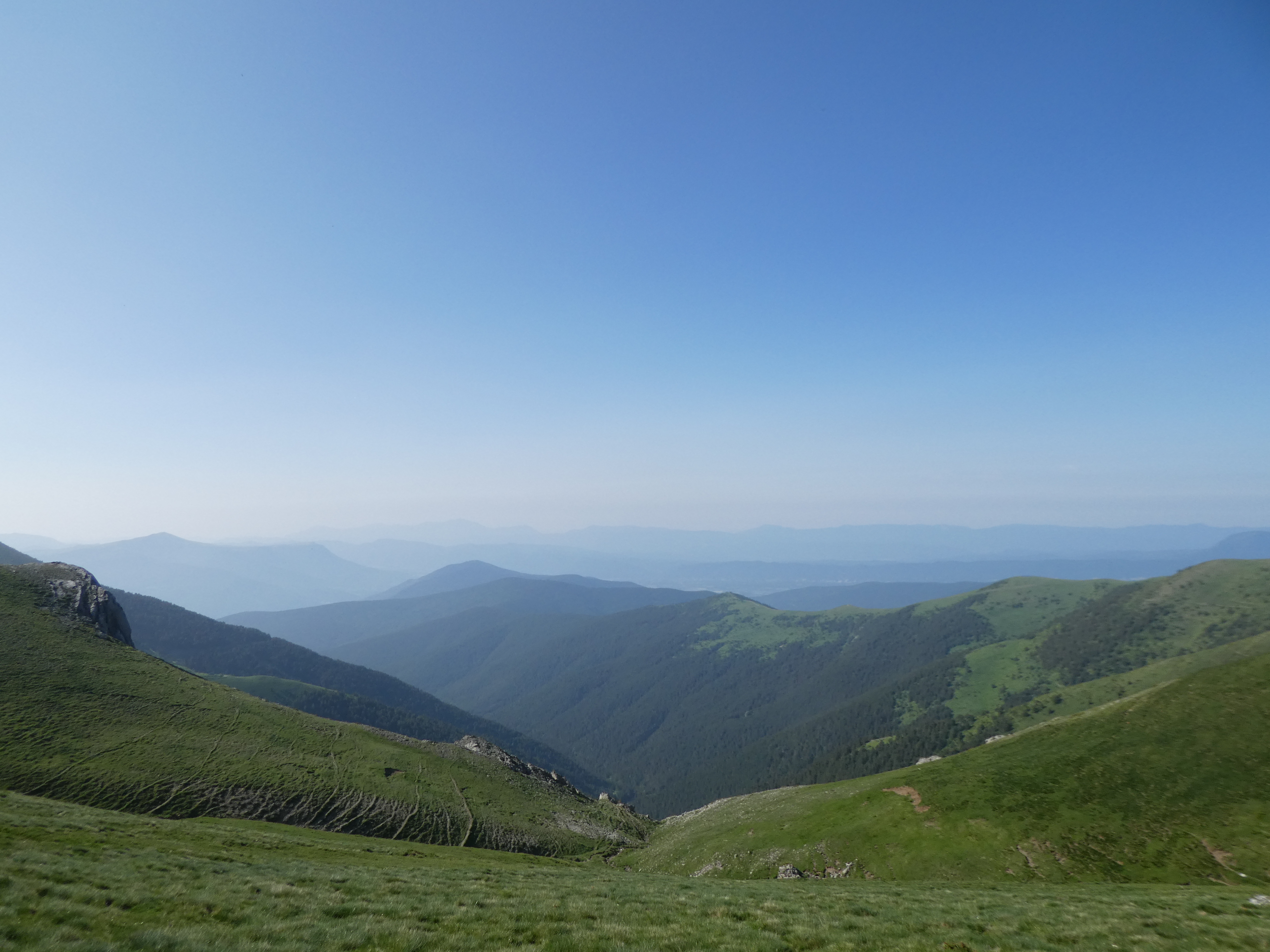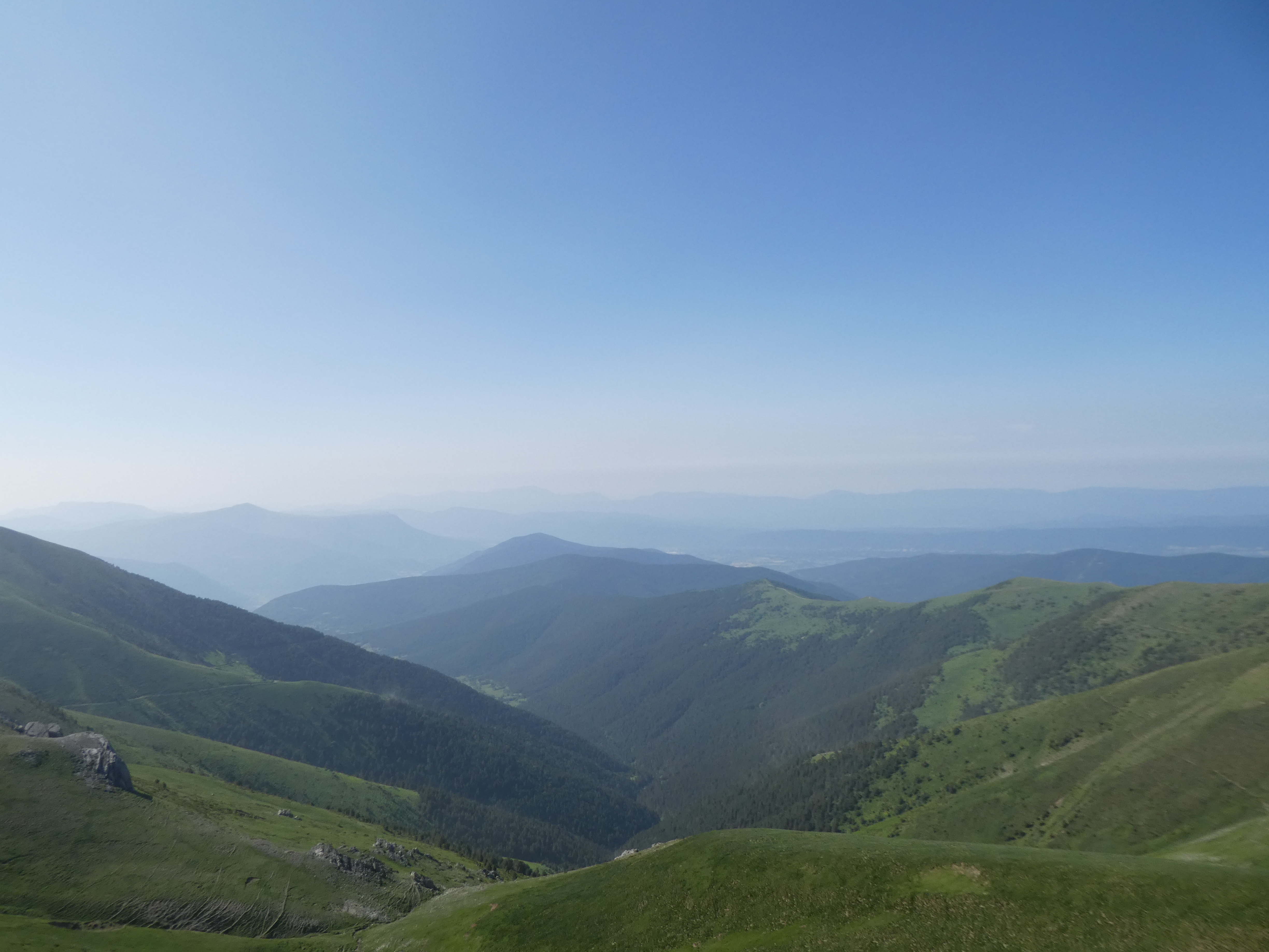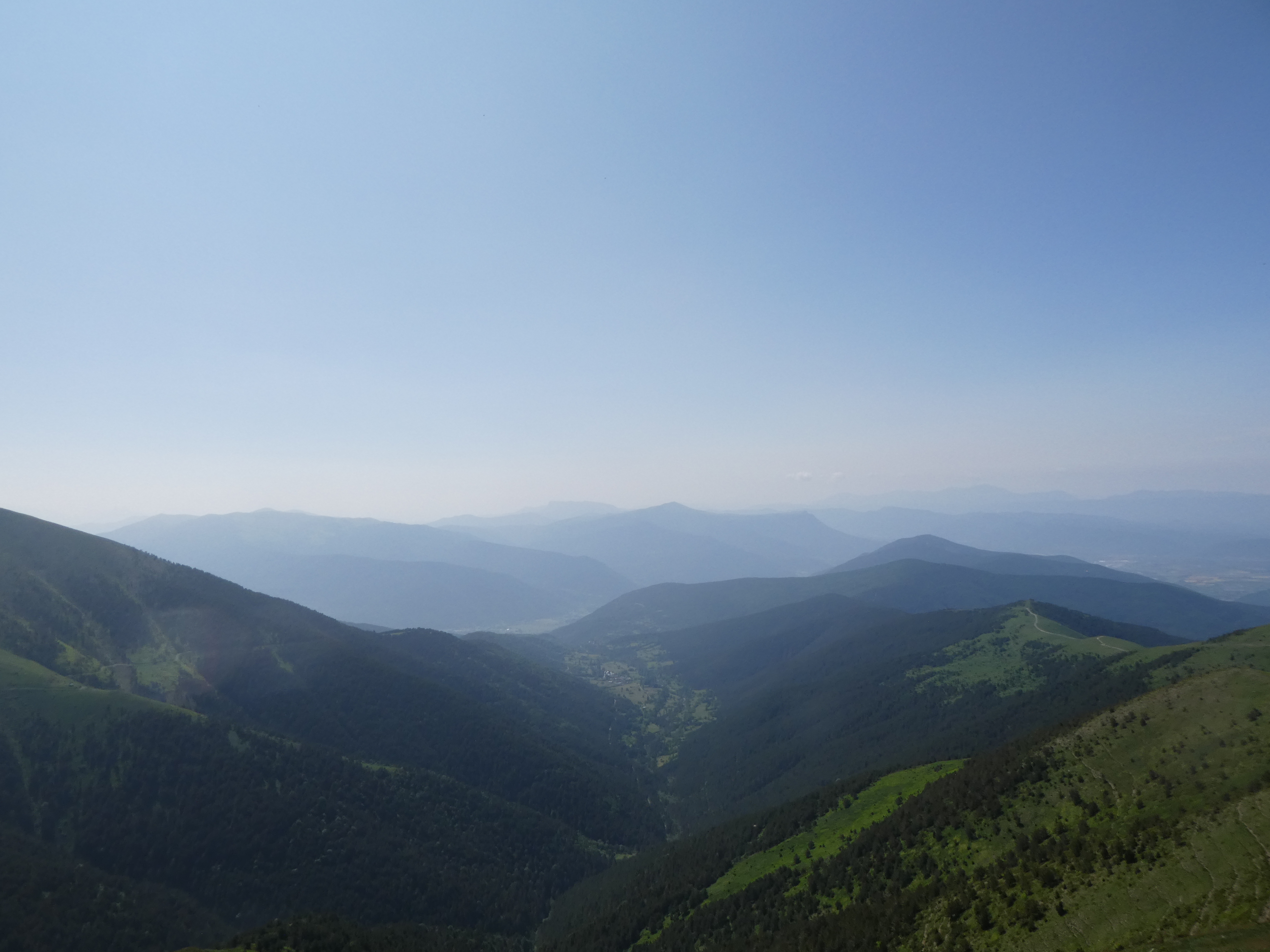 Arrivée au sommet de la Cerruza (2009 m) : beau panorama malgré la présence de brume de chaleur sur les sommets du massif de la Peña Telera, de l'Alto Gállego, du Sobrarbe, de la Jacetania ainsi que sur la Valle de Biescas