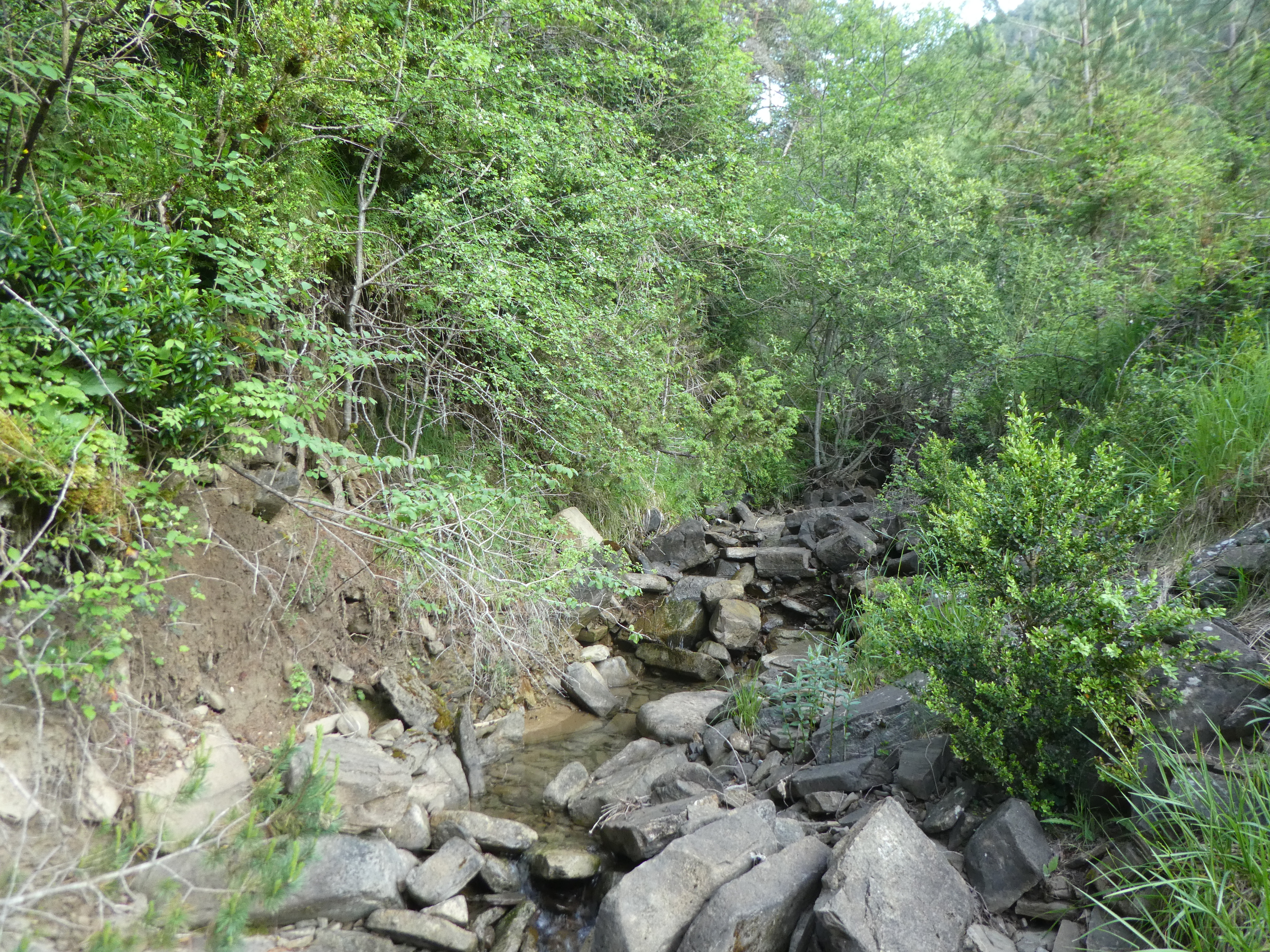 Au niveau de ce passage à gué du Barranco de Aso (100 mètres après le précédent croisement), suivre le chemin partant tout droit direction Aso de Sobremonte, balisé en rouge et blanc (bien suivre les balises rouges et blanches pour ne pas rater le croisement où il faut tourner à droite 1000 mètres plus loin)