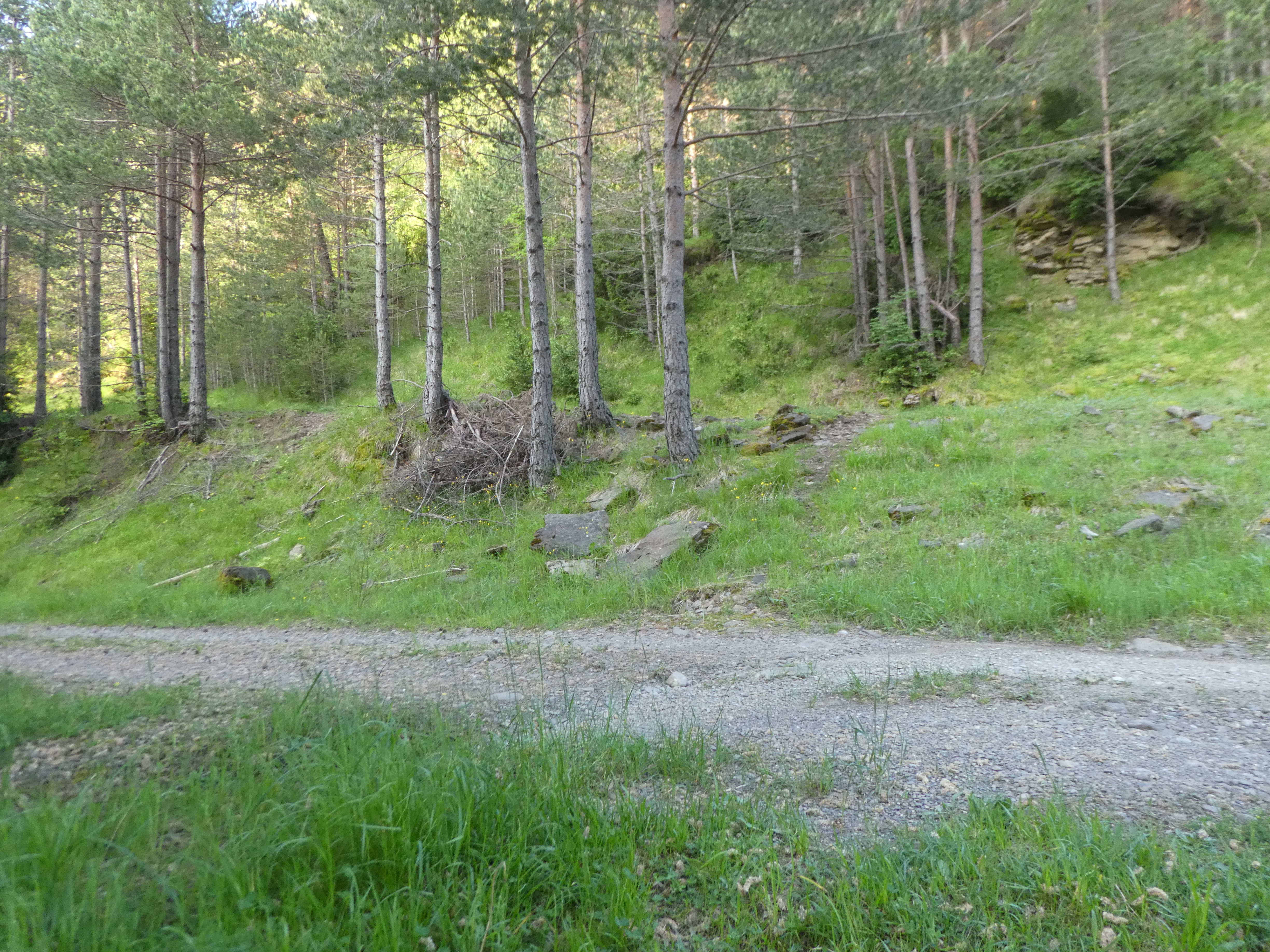 A ce croisement où l'itinéraire VTT n°32 se sépare du n°36 marqué par la présence d'un panneau directionnel (1800 mètres après le précédent mentionné), continuer à suivre la piste partant sur la gauche direction Cerruza, balisé sporadiquement en balises VTT n°36 (toujours suivre la piste la plus large et ignorer les croisements munis de panneaux directionnels revenant sur Biescas)