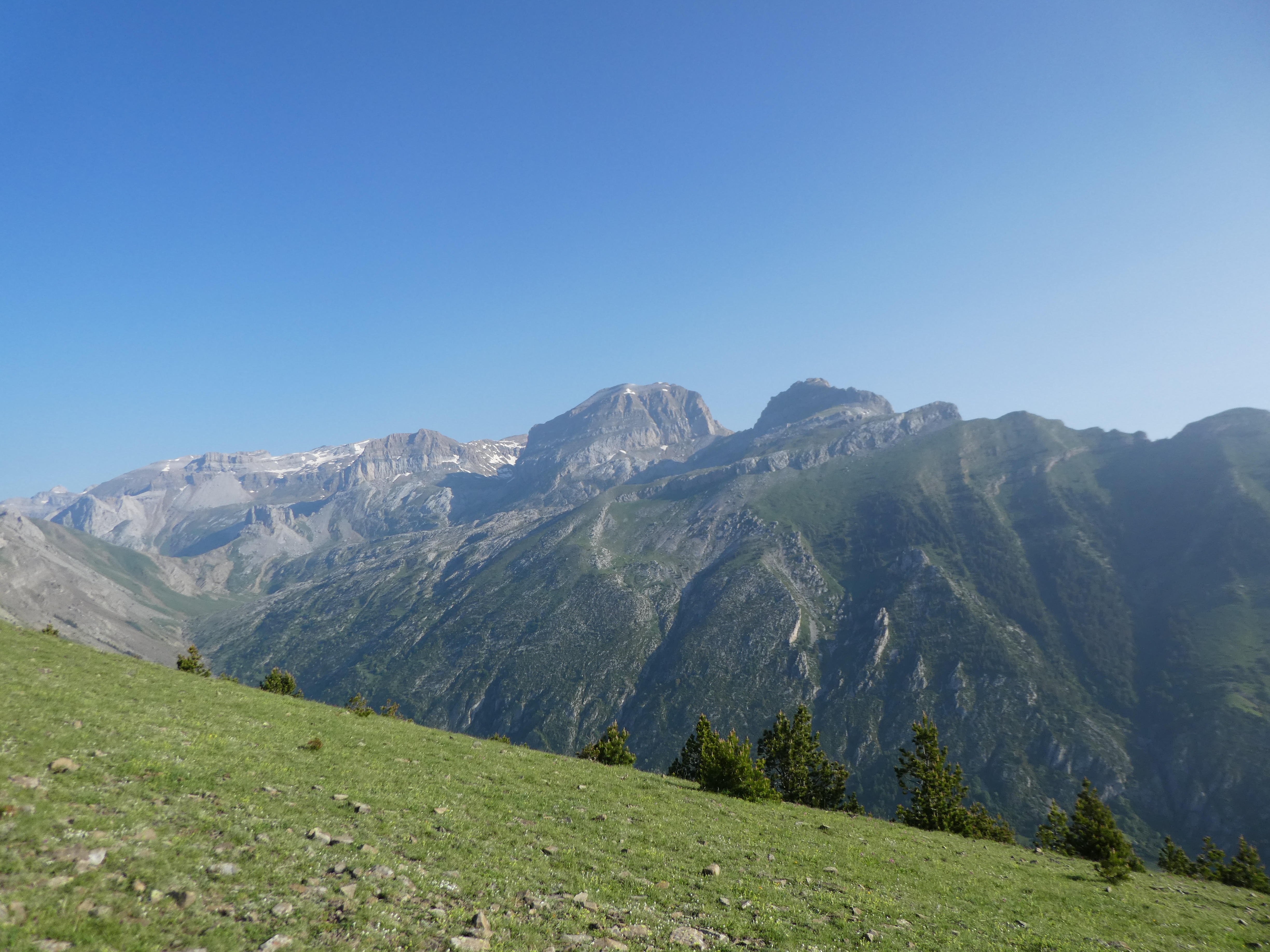 Zoom sur le Pico de Marboré (3252 m) à gauche, le Cilindro de Marboré (3325 m) au centre-gauche, le Monte Perdido (3355 m) au centre et le Pico de Añisclo (3259 m) au centre-droit
