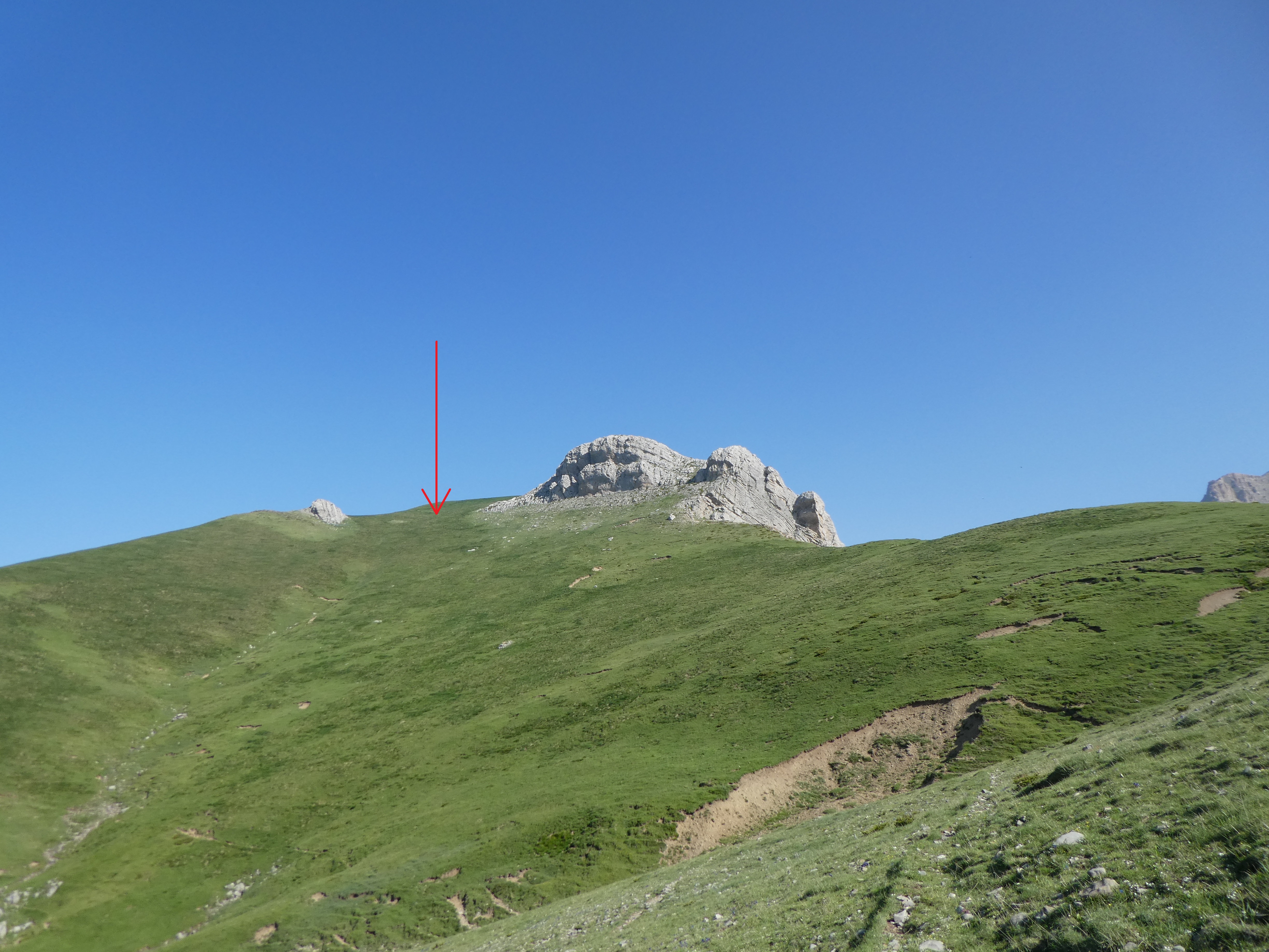 Vue sur la Peña Petruso et le faux-col à viser à gauche du sommet pour l'atteindre (progression hors sentier et à vue)