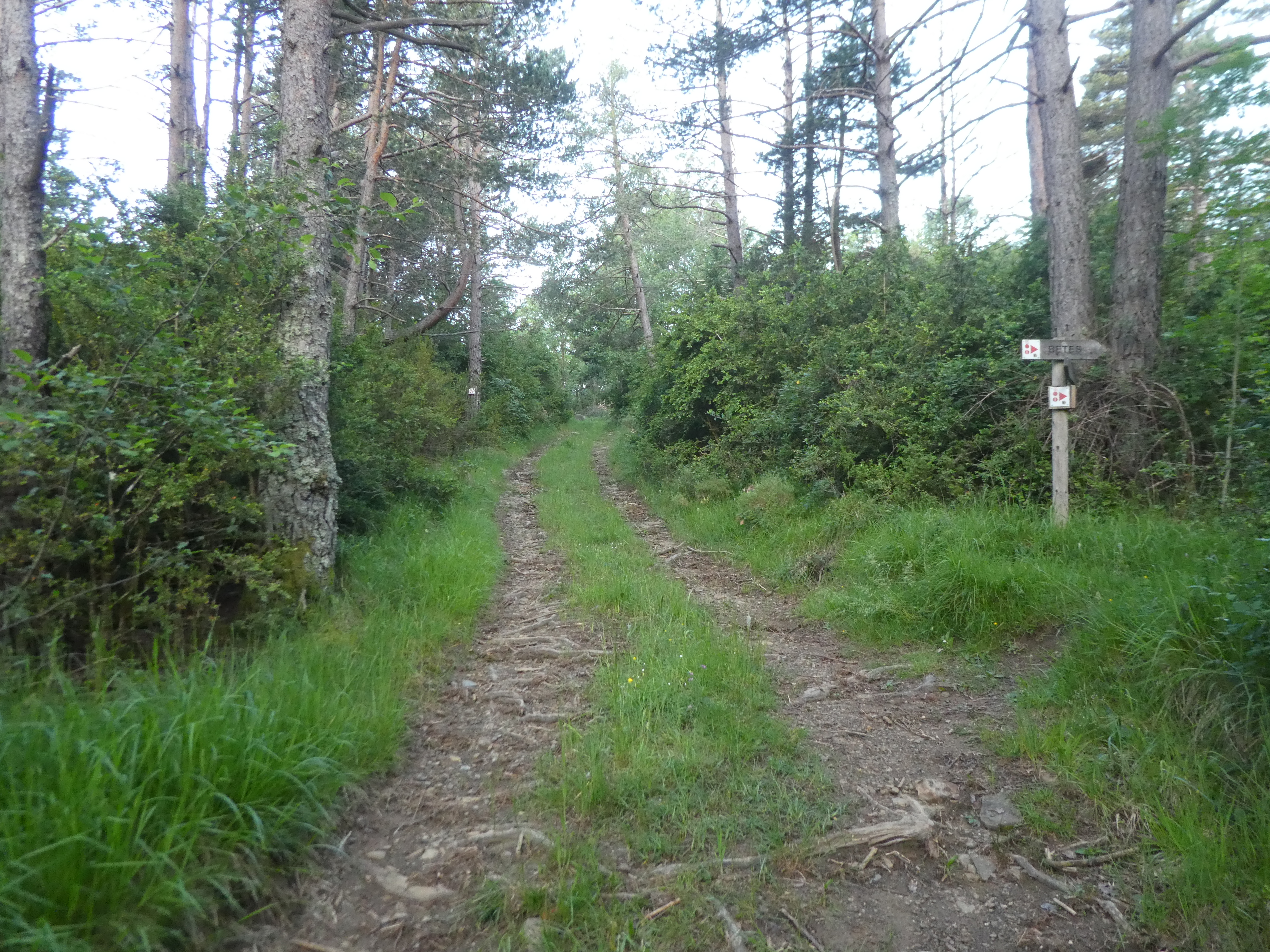 A ce croisement avec la piste menant à l'antenne de la Cerruza (25 mètres après le précédent), suivre cette dernière partant sur la droite direction Cerruza, balisé sporadiquement en balises VTT n°36 dorénavant (toujours suivre la large piste et ignorer tous les croisements munis de panneaux directionnels revenant sur Betés)
