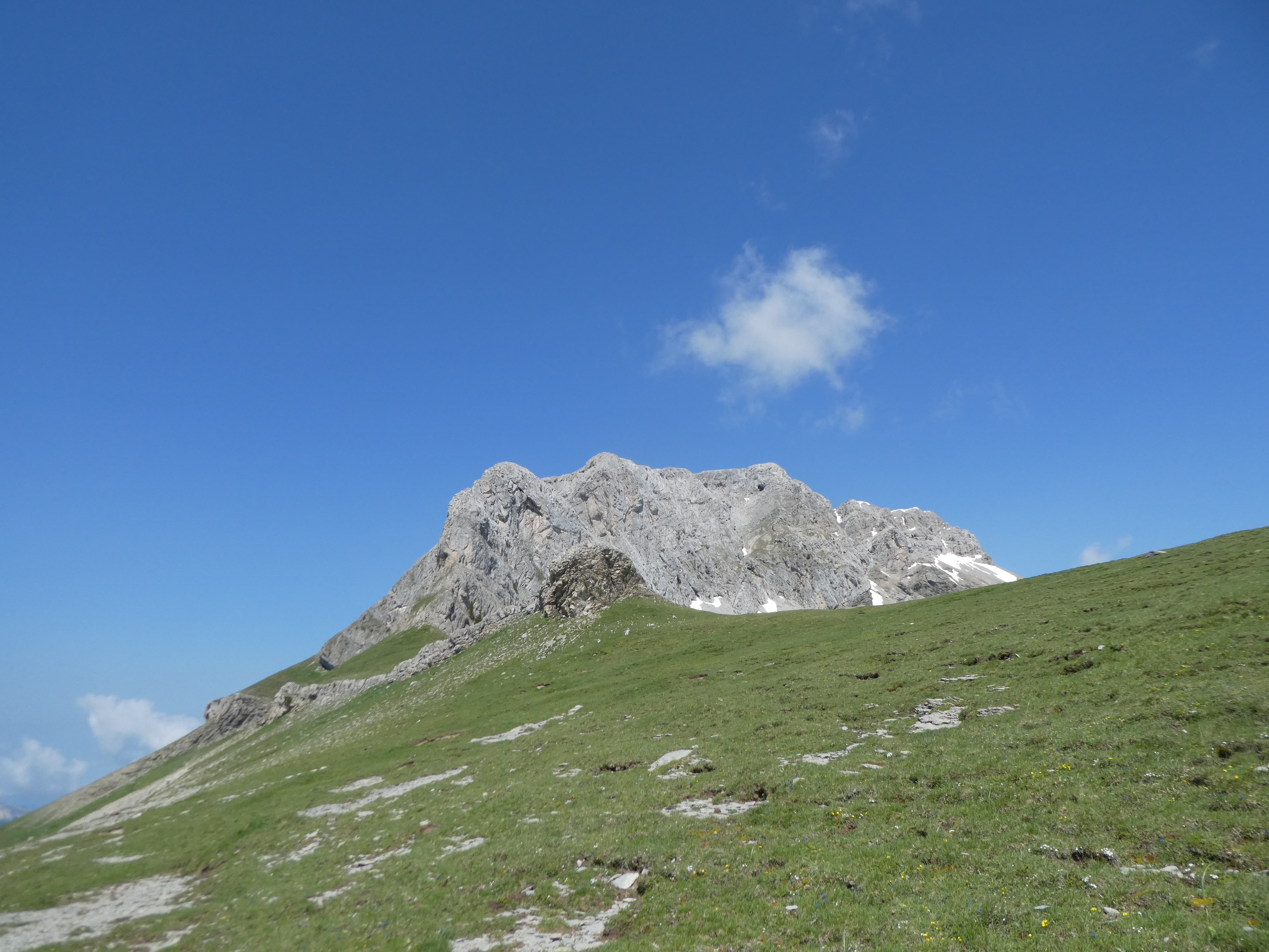 Dès que le bas du "couloir" est atteint (300 mètres après avoir avoir quitté le fil de crête), continuer à descendre à vue légèrement sur la gauche pour atteindre la pente herbeuse passant sous la crête direction Portiello de Tella