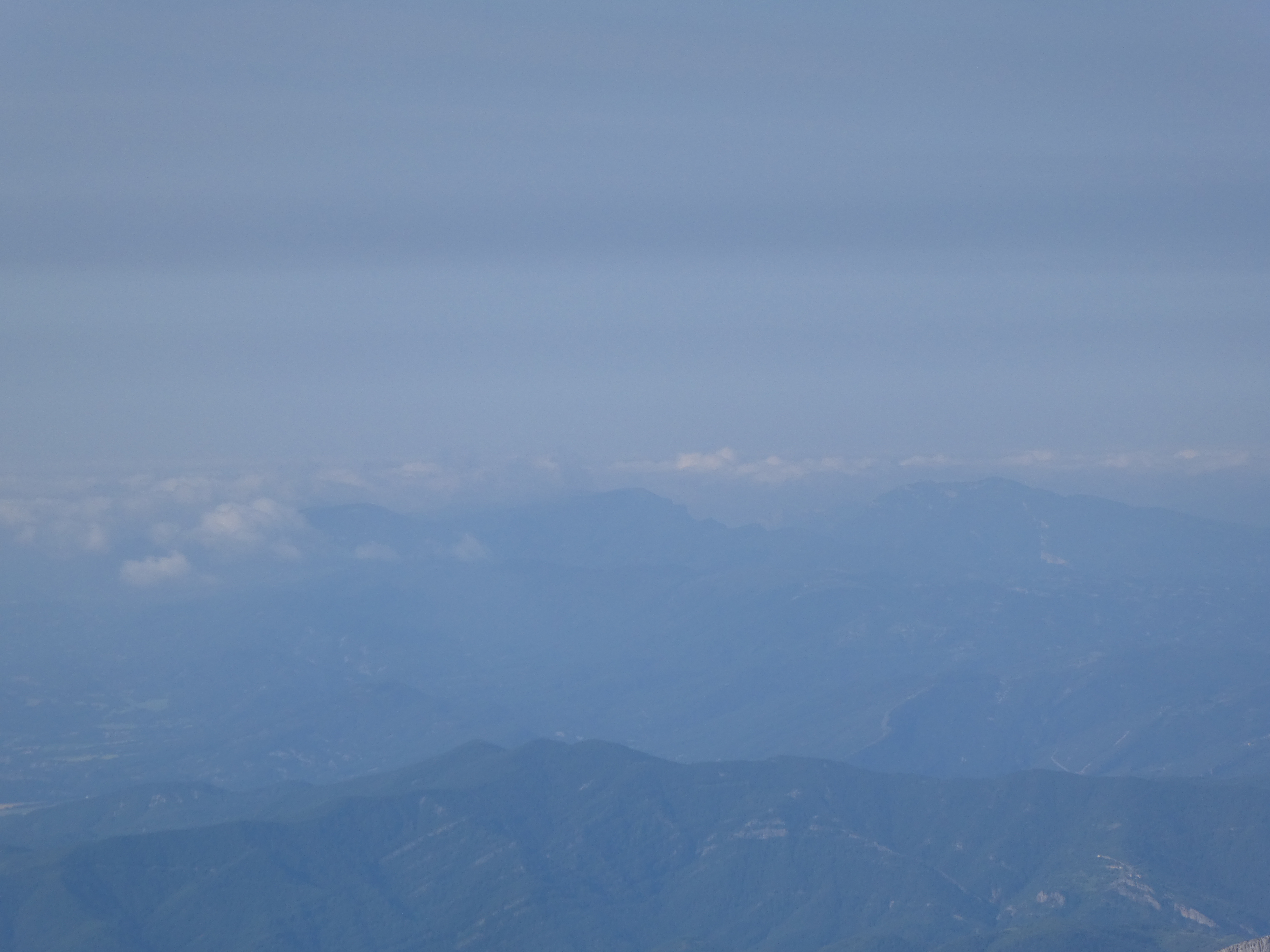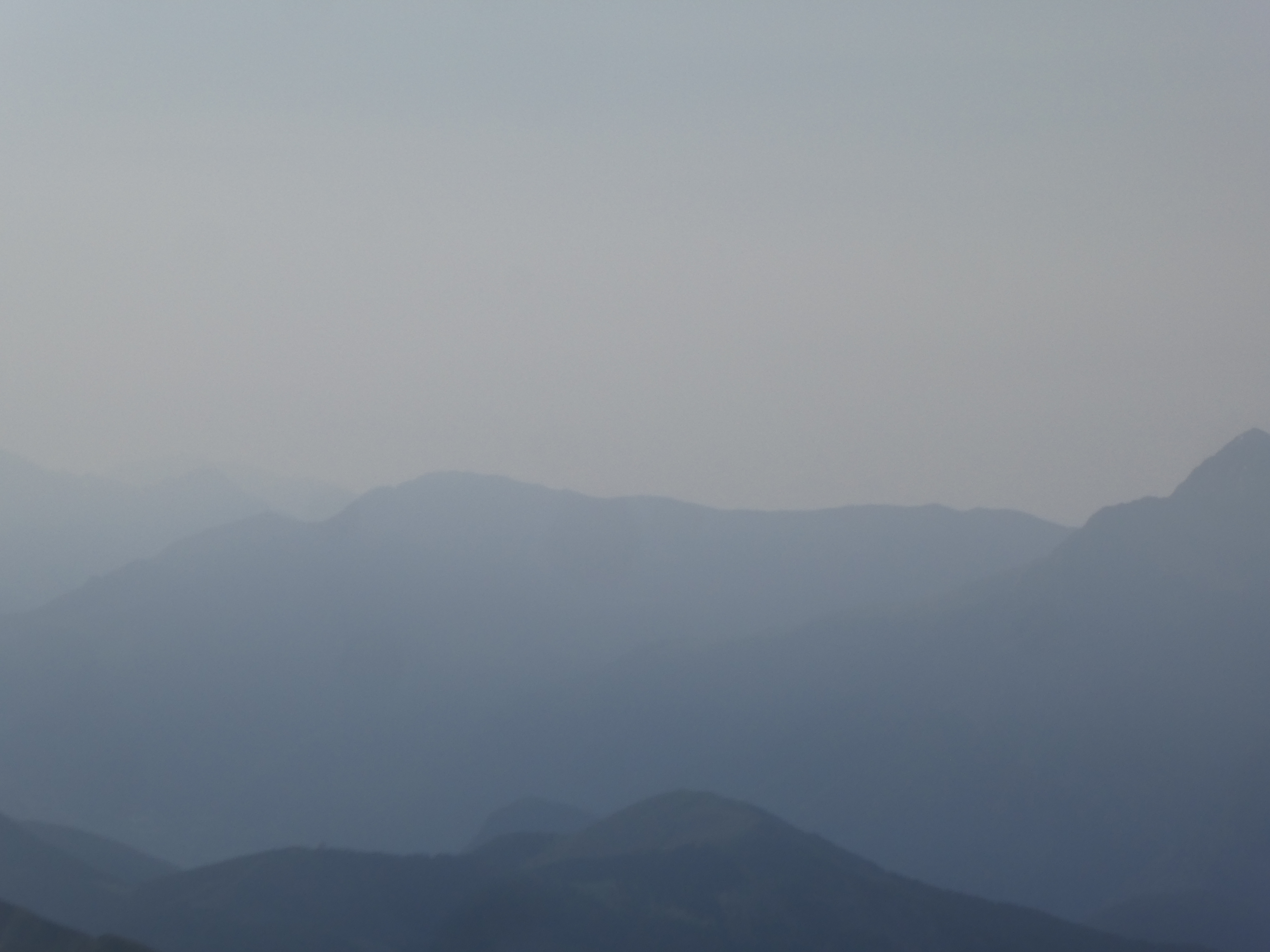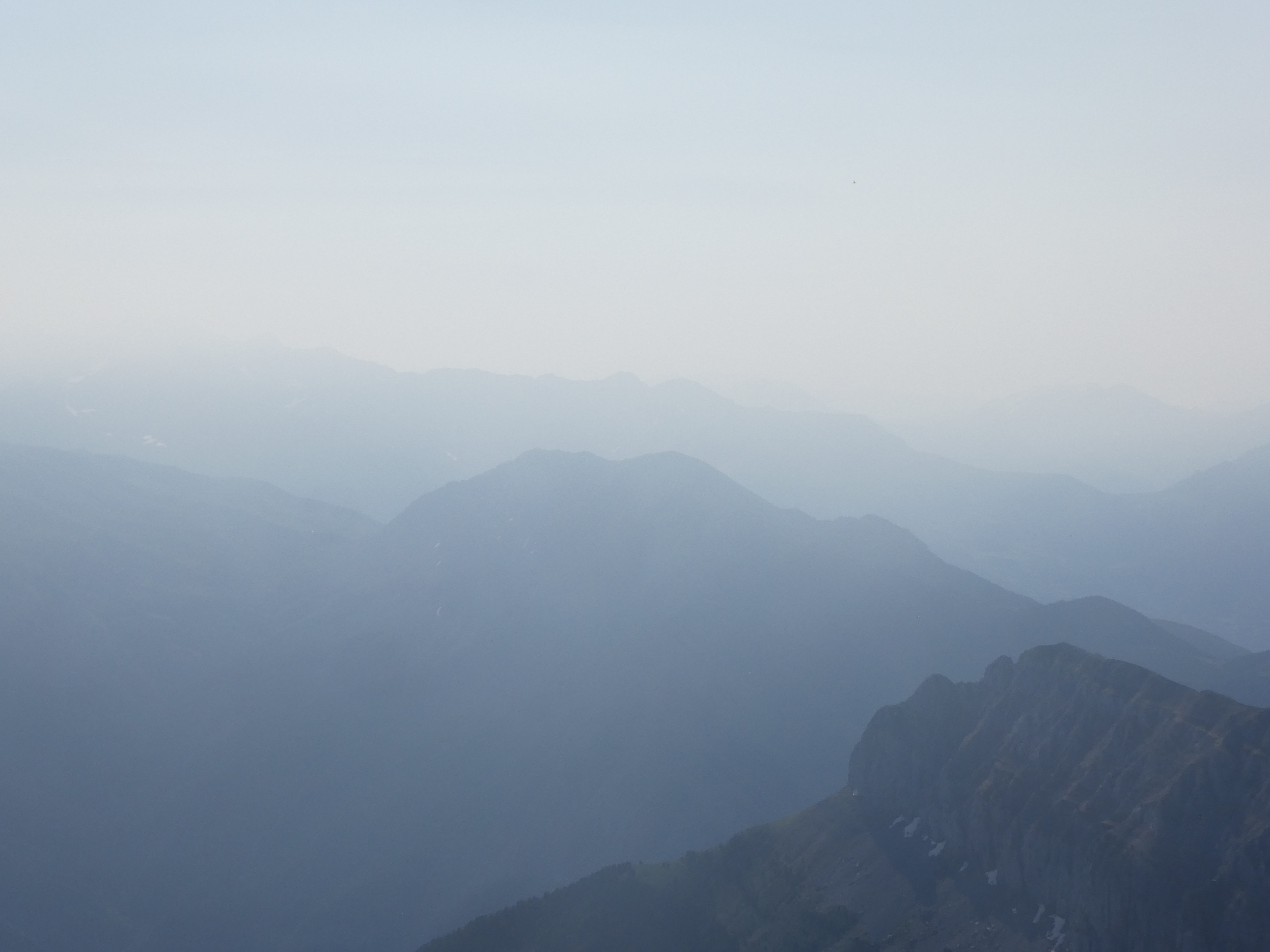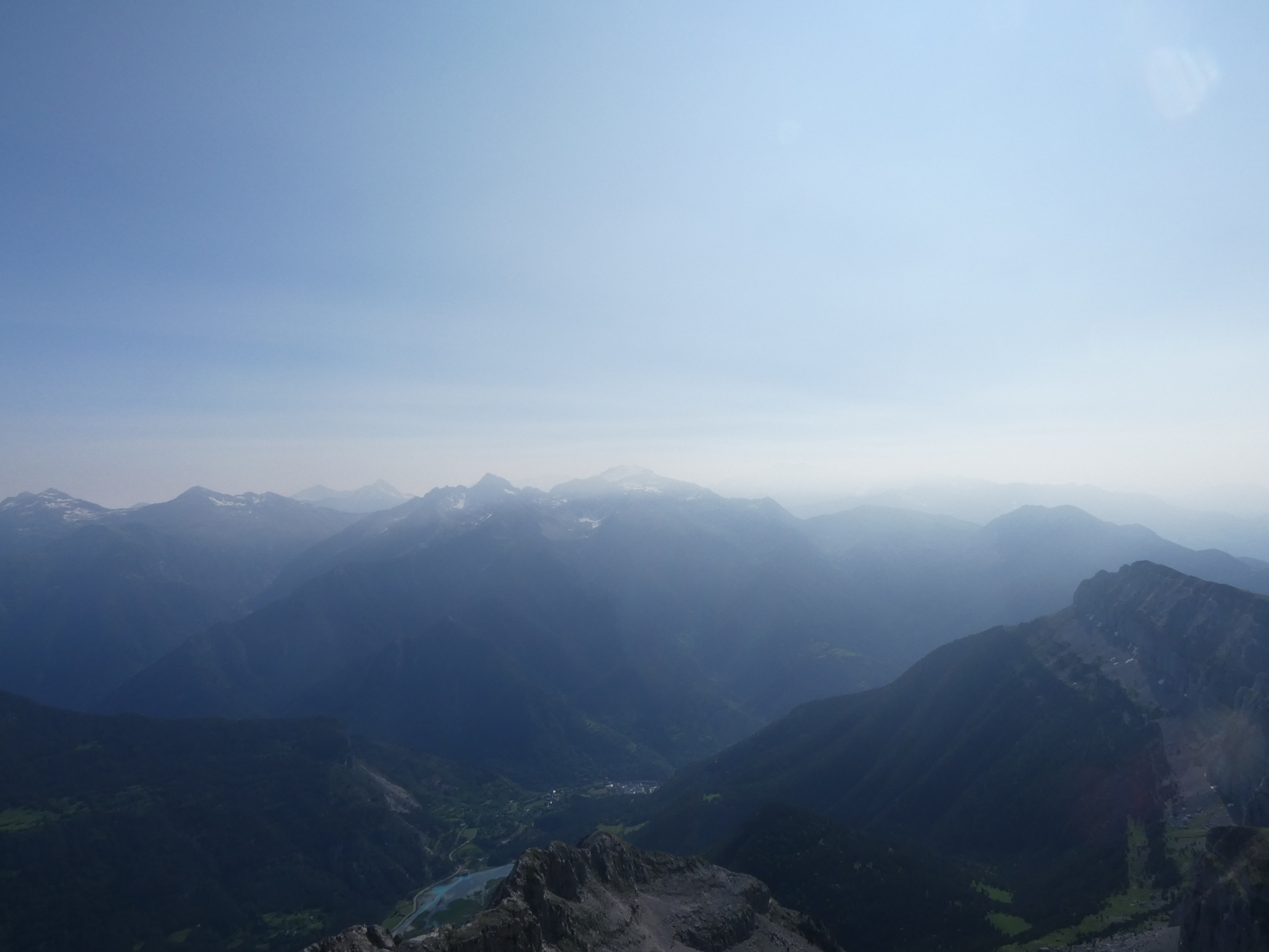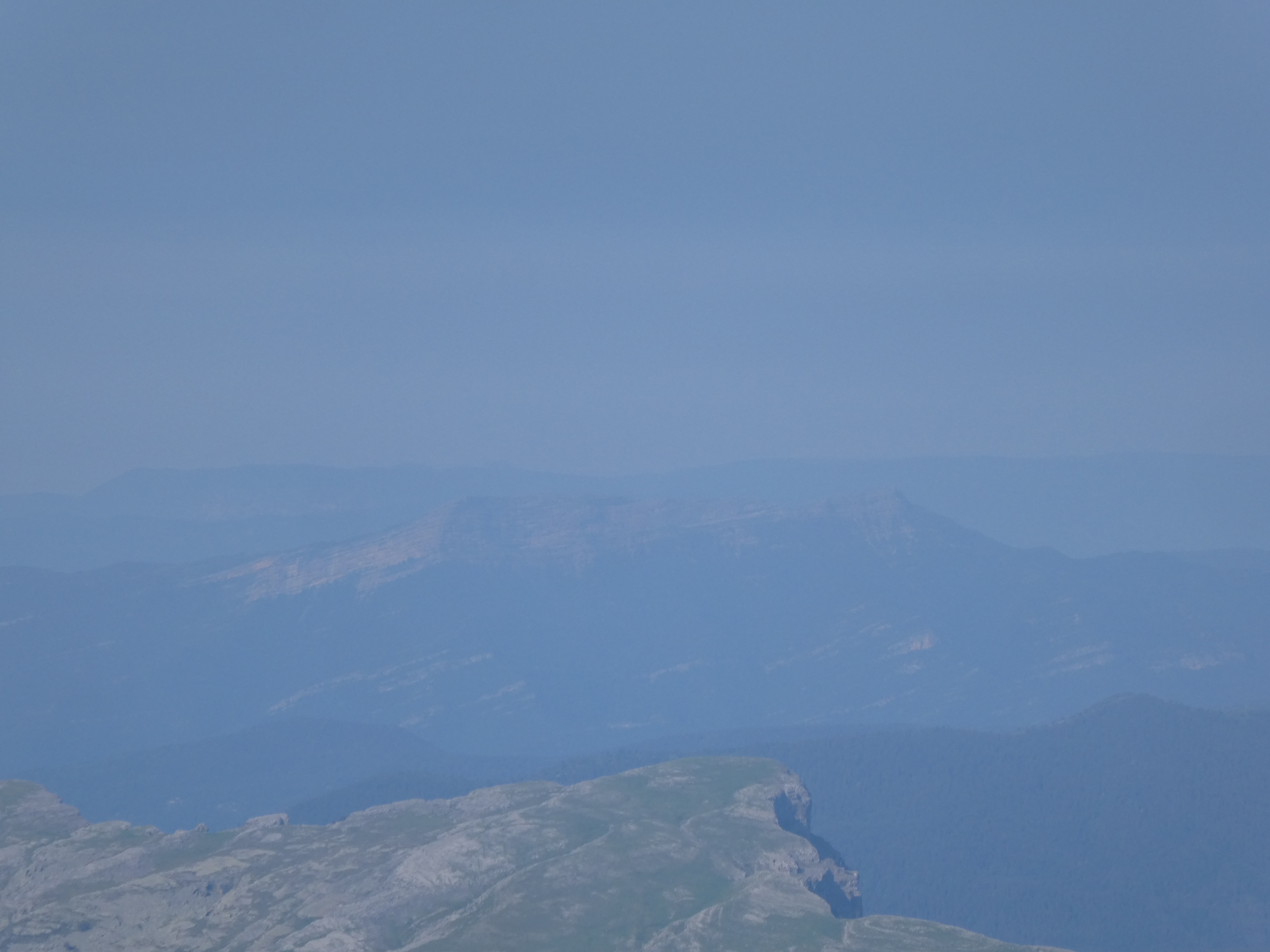 Arrivée au sommet de la Pala de Montinier (2593 m) : beau panorama malgré la présence de poussière dans l'atmosphère sur les sommets du Sobrarbe, de la Vallée de Gavarnie, de la Haute Vallée d'Aure, de la Ribagorza, du Somontano de Barbastro, de la Hoya de Huesca, de l'Alto Gállego ainsi que la Valle de la Cinca