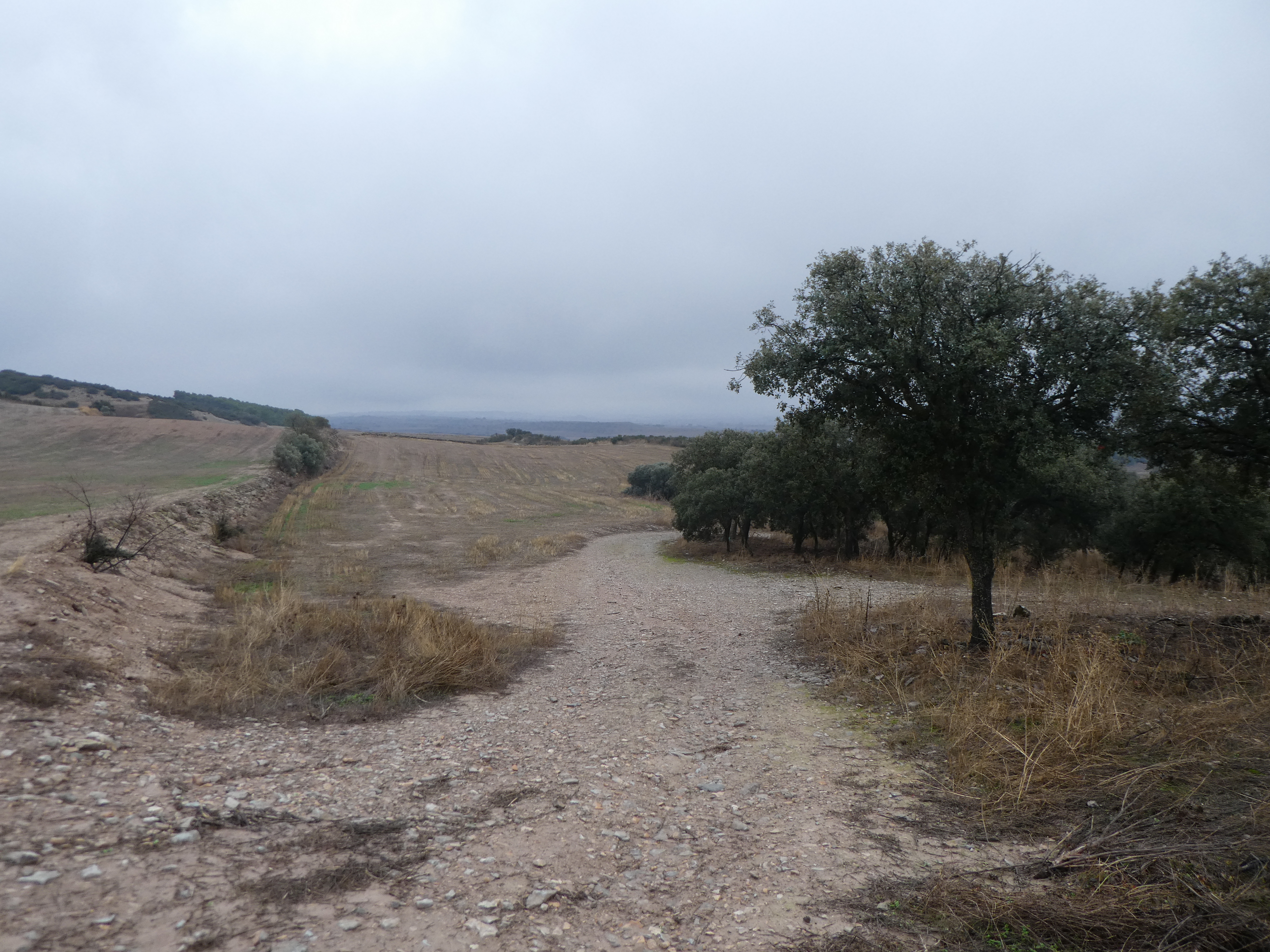 A ce croisement où le chemin s'interrompt (300 mètres après le précédent), suivre le semblant de chemin partant tout droit et passant à la lisière des champs direction lo Pilar d'Almenara (le but est de rejoindre la piste plus haut contournant lo Pilar d'Almenara)
