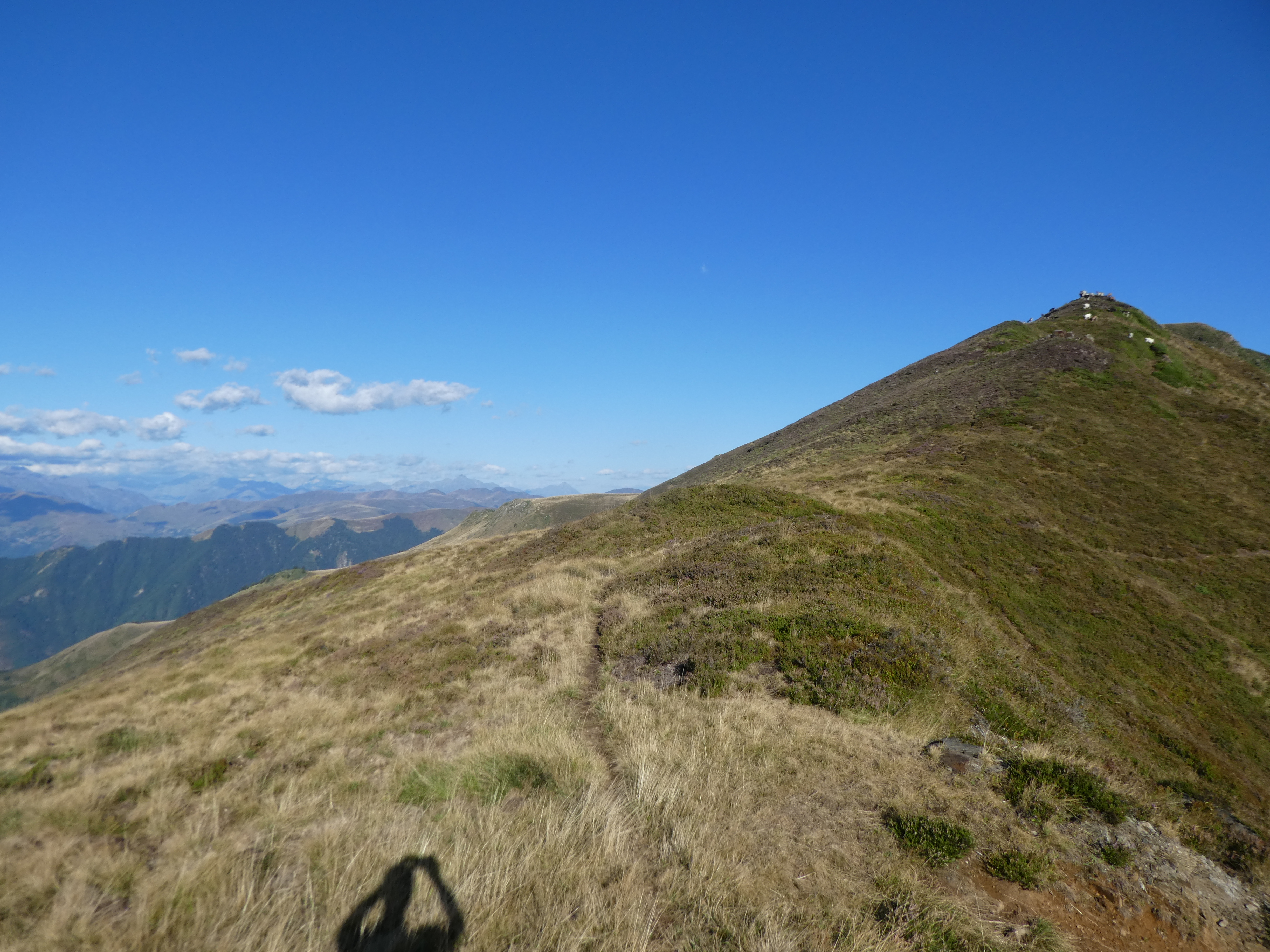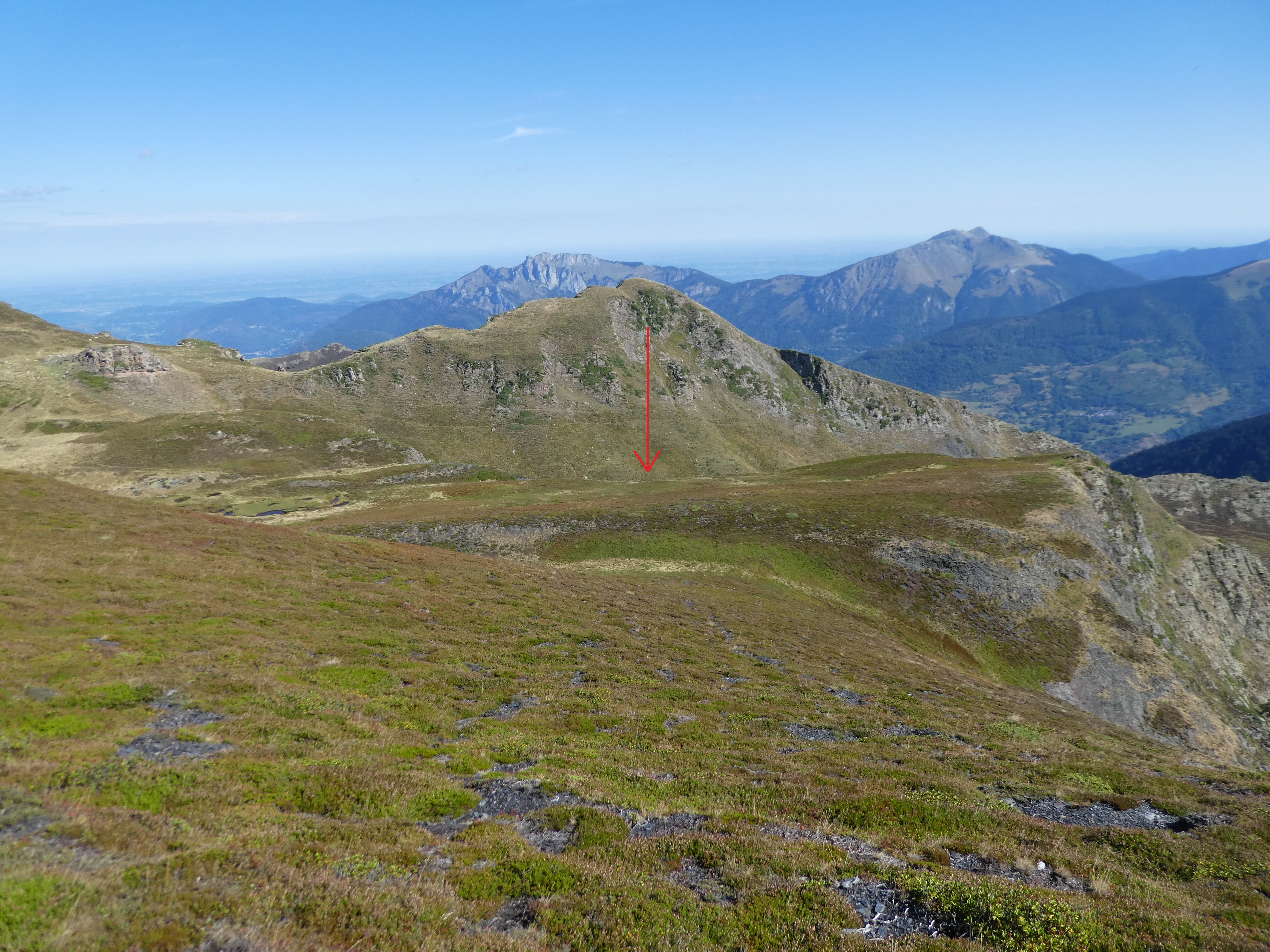 Redescendre du sommet dans le même sens que celui de l'aller en suivant la ligne de crête direction Tuc deth Plan der Òme, aucun balisage dorénavant