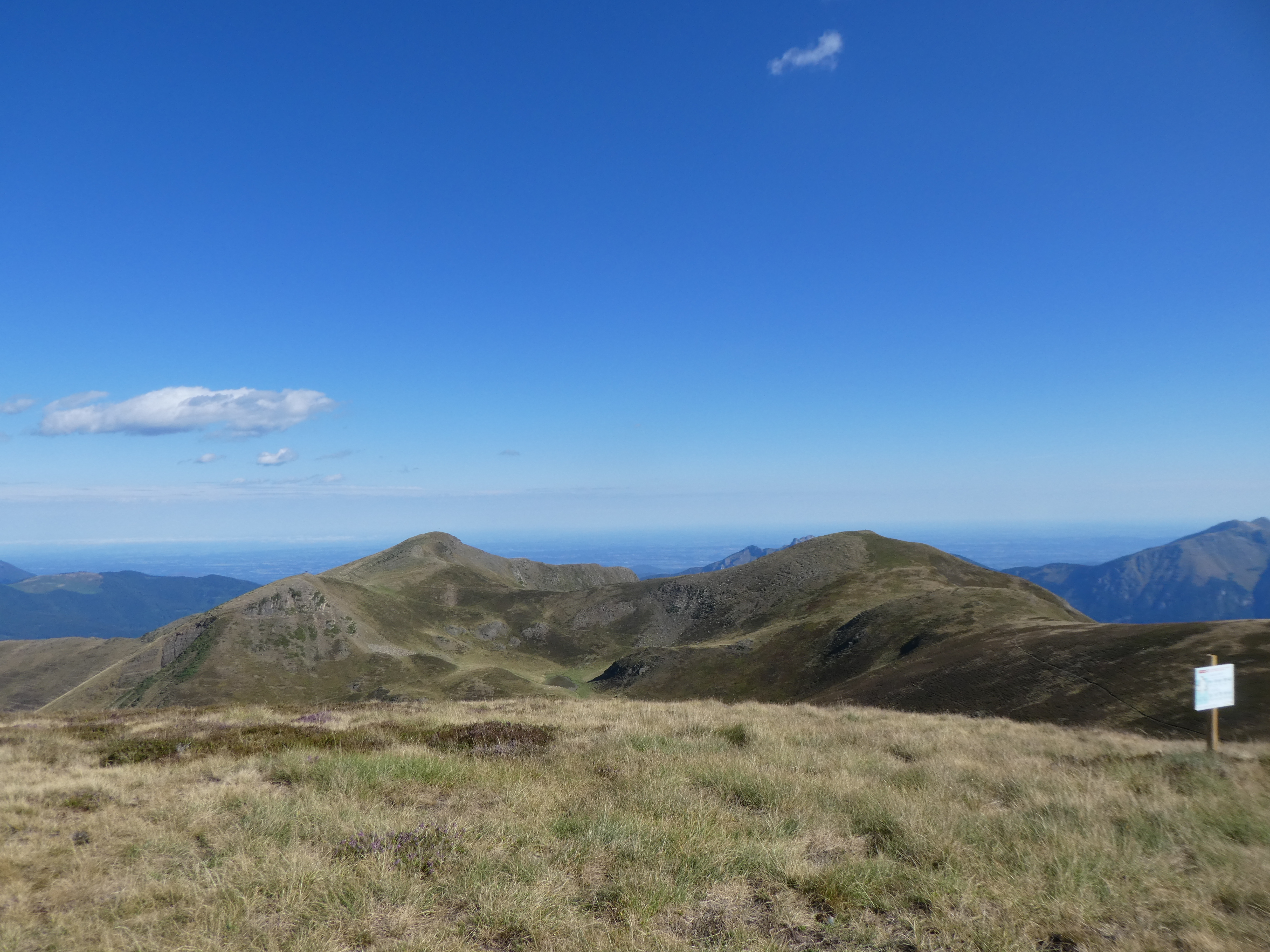 Arrivée au sommet du Cap d'Estanhs ou Cap deth Còth d'Estanhs ou Plan de Montmajou (2082 m) : panorama semblable à celui du Malh des Bessons avec vue plus étendue sur les sommets de la Vallée d'Aure et du Louron