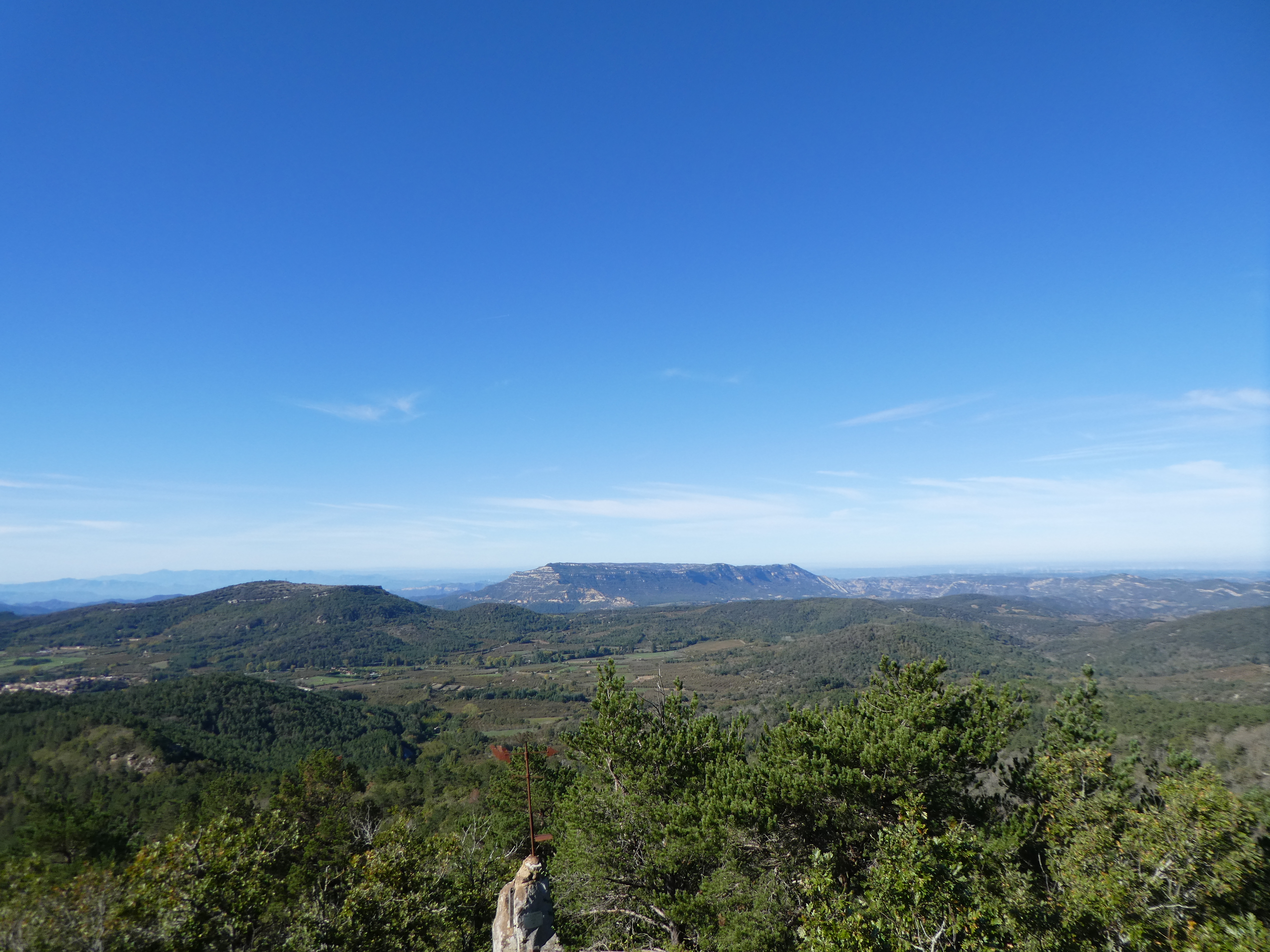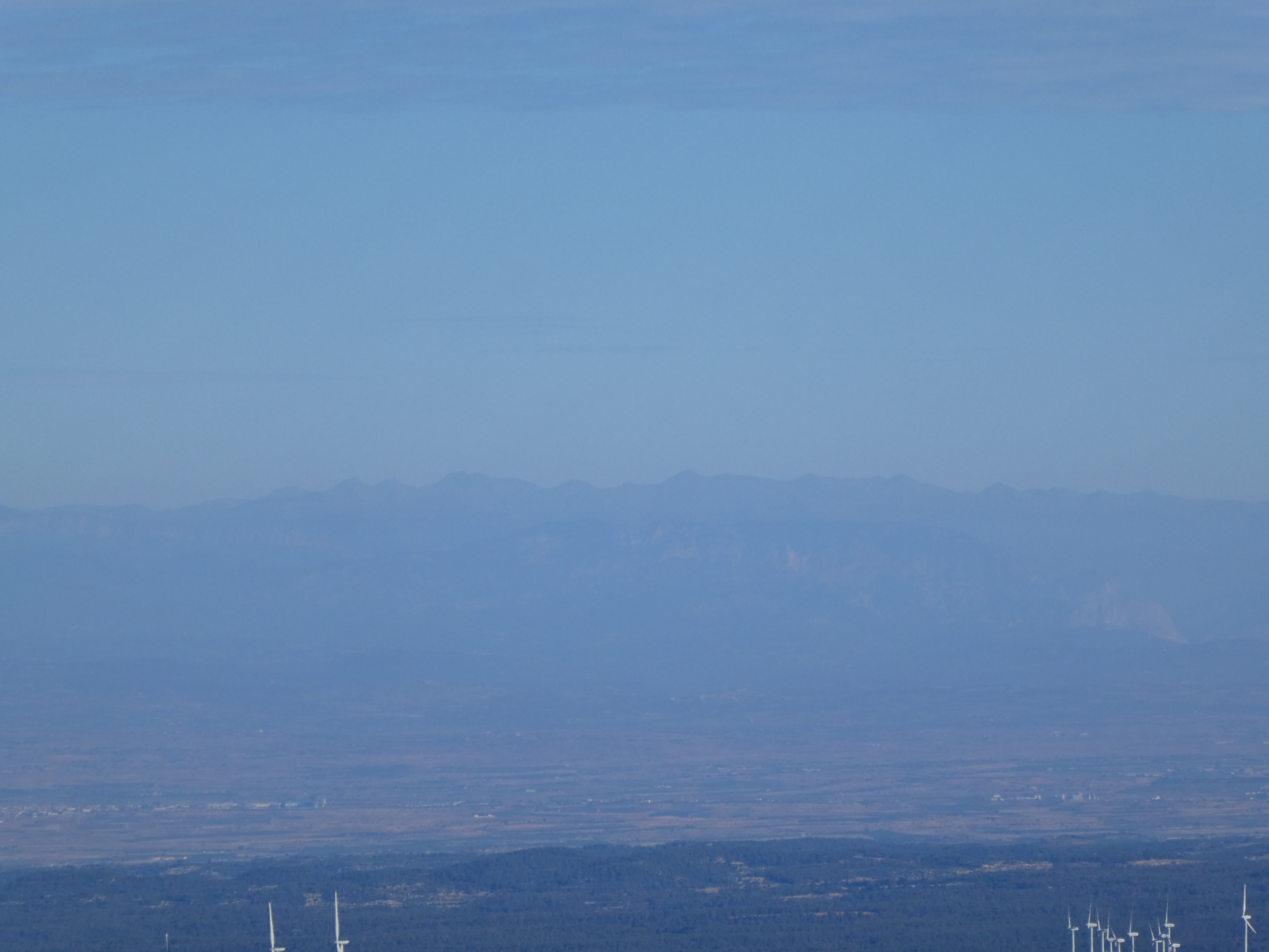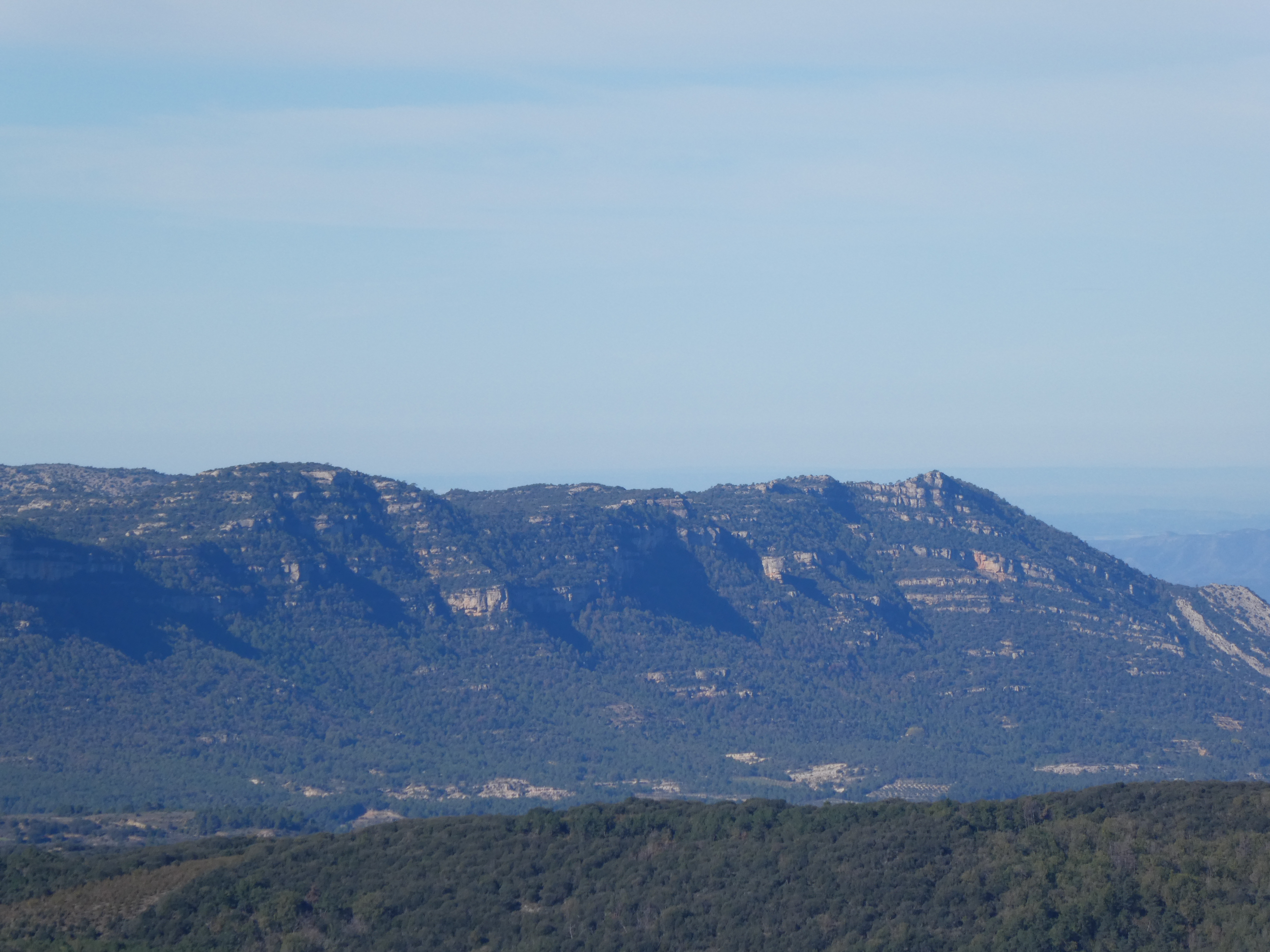 Arrivée au sommet du Tossal de la Baltasana (1201 m) : beau panorama sur les sommets du Baix Camp, de la Vall de l'Ebre, de la Terra Alta, du Priorat, de les Garrigues, du Pallars Jussà, de l'Alt Urgell, du Solsonès, du Berguedà ainsi que sur la plaine de Lérida