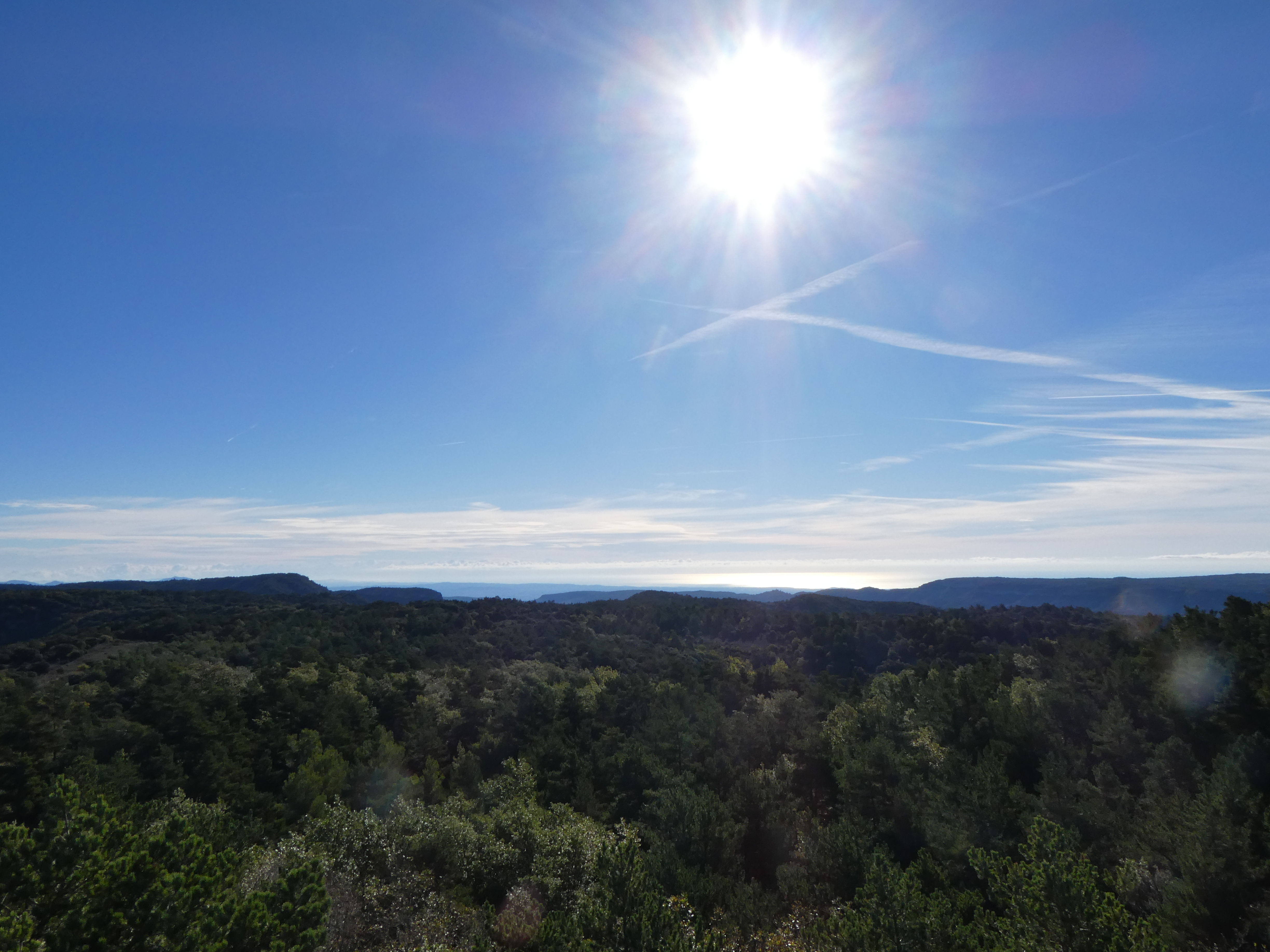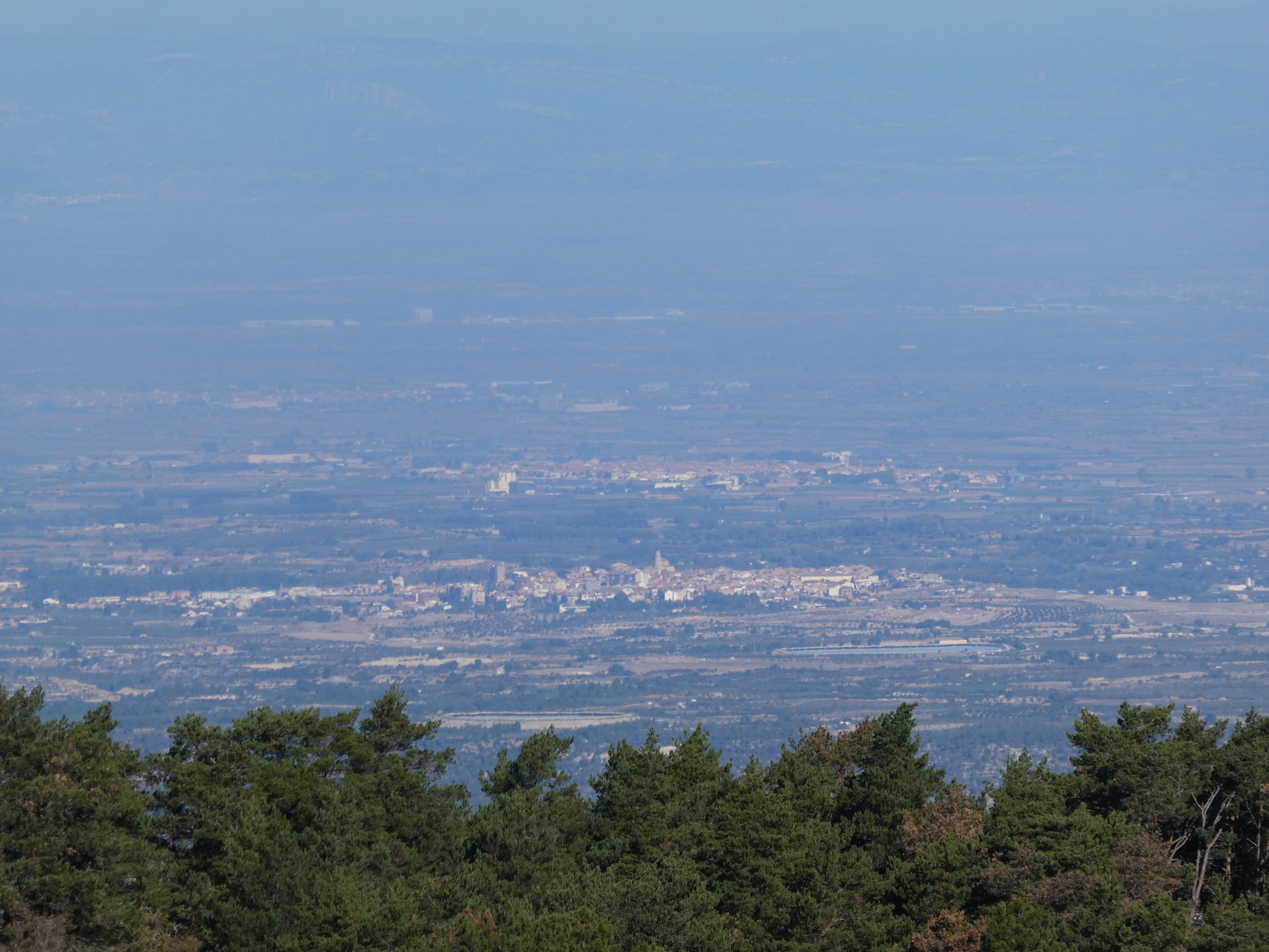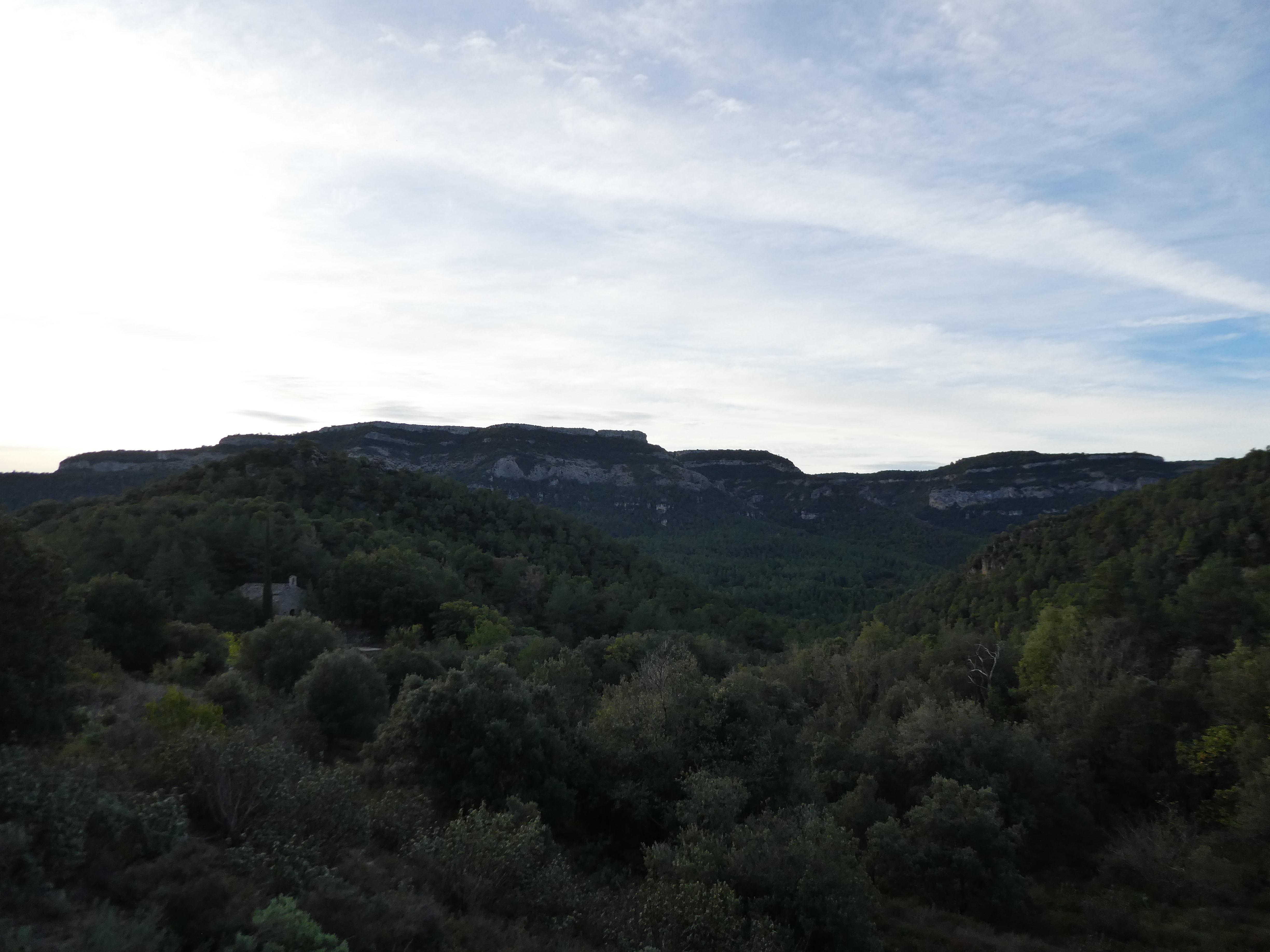 Arrivée au sommet du Tossal de la Baltasana (1201 m) : beau panorama sur les sommets du Baix Camp, de la Vall de l'Ebre, de la Terra Alta, du Priorat, de les Garrigues, du Pallars Jussà, de l'Alt Urgell, du Solsonès, du Berguedà ainsi que sur la plaine de Lérida