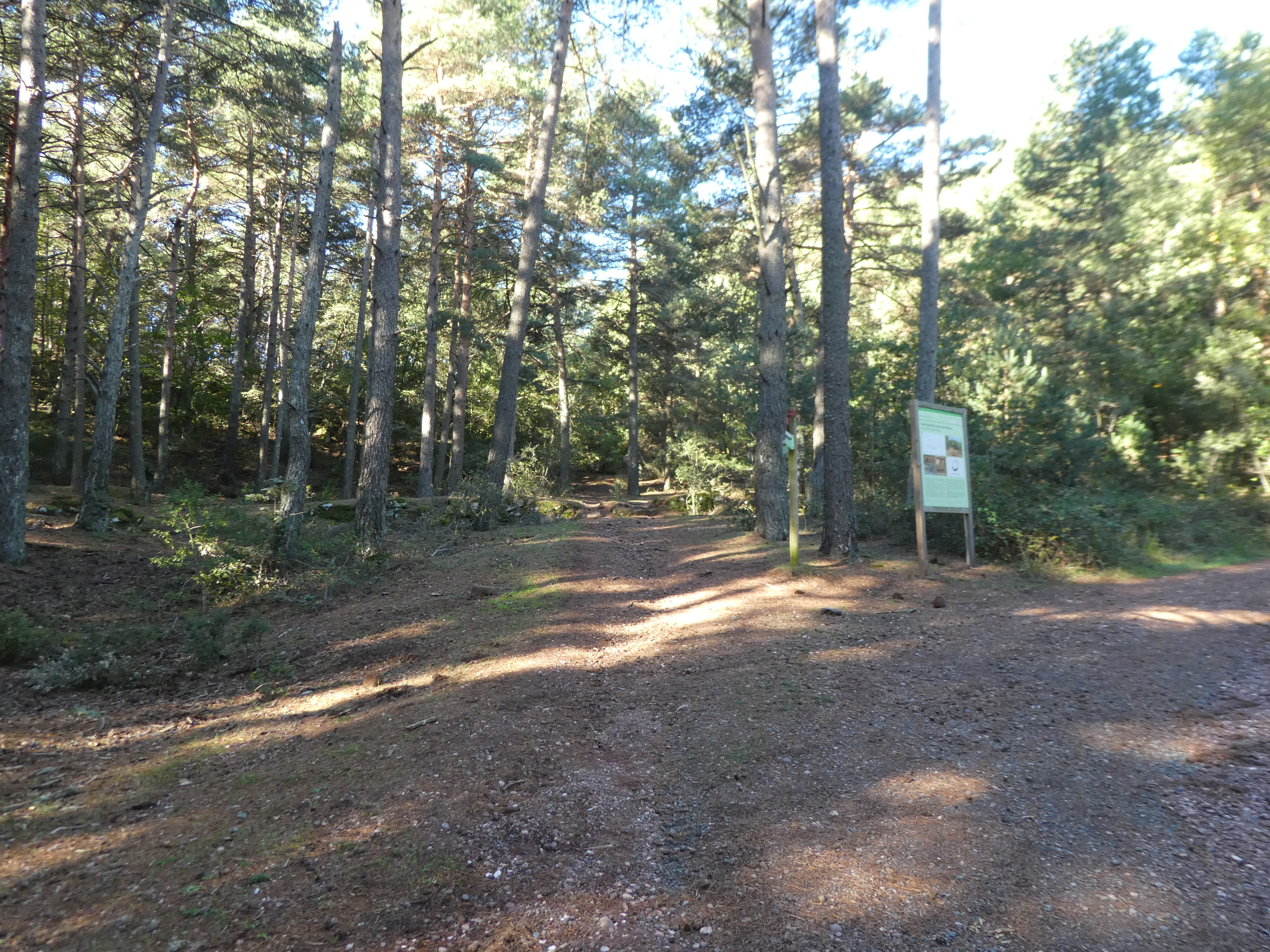 A ce croisement situé à proximité du Coll de la Font del Dineral marqué par la présence d'un panneau directionnel (600 mètres après le précédent), suivre le GR171 partant sur la droite pour faire un court aller-retour vers le Pou de Gel del Dineral direction Mola d'Estat, balisé en rouge et blanc dorénavant
