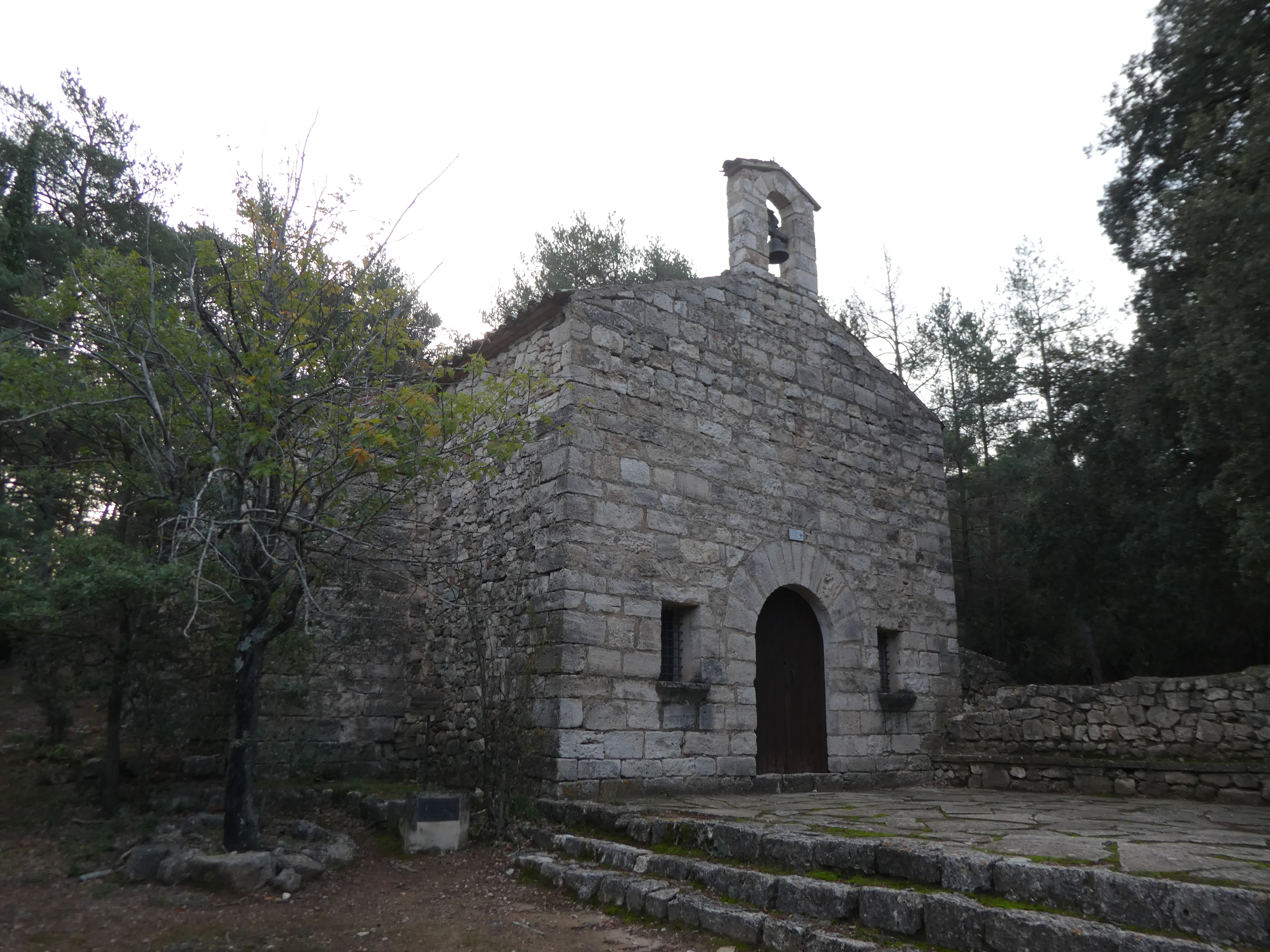 Vue sur l'Ermita de l'Abellera (non accessible librement) ; repartir du site par le même chemin que celui de l'aller direction Capafonts