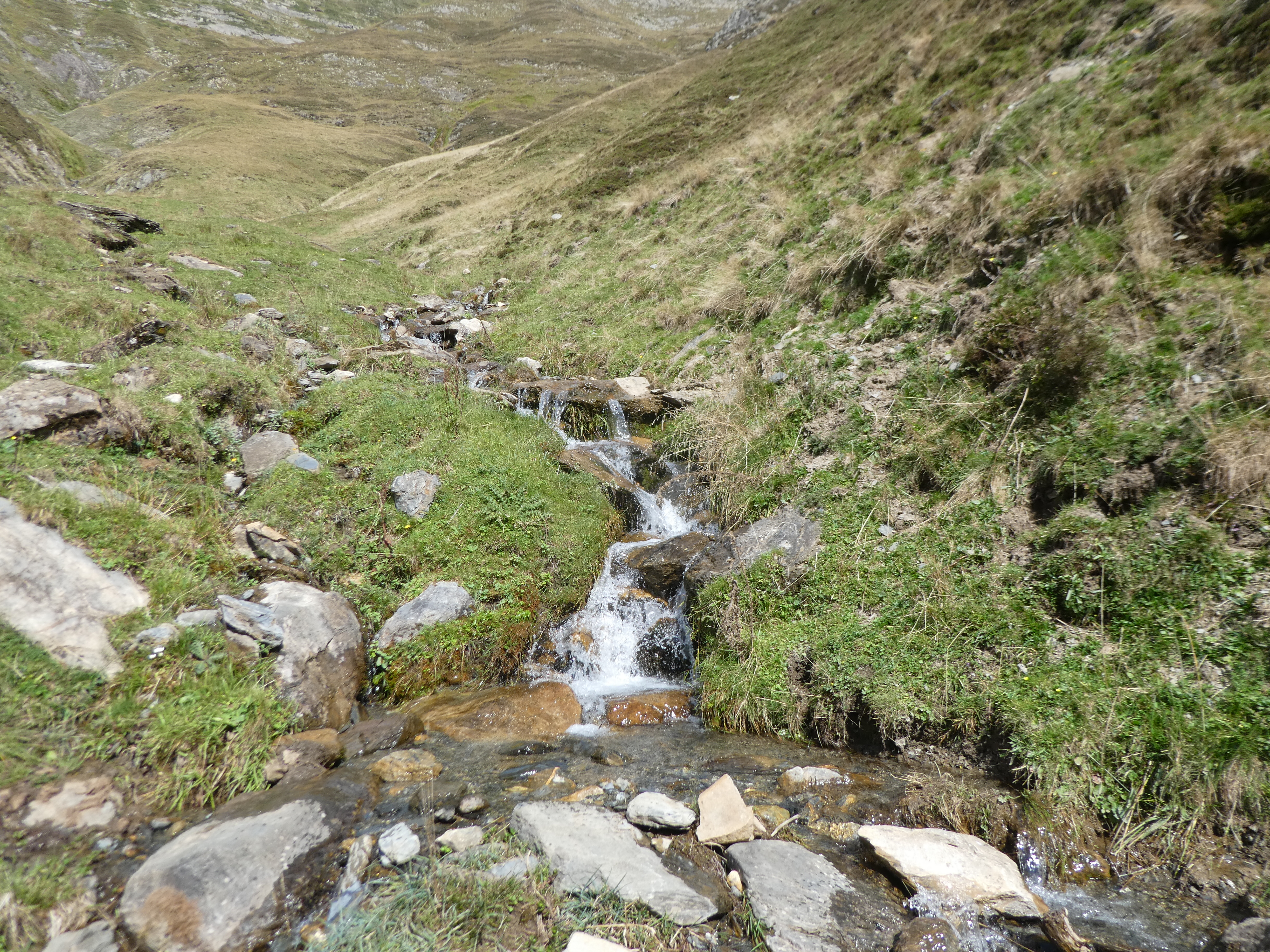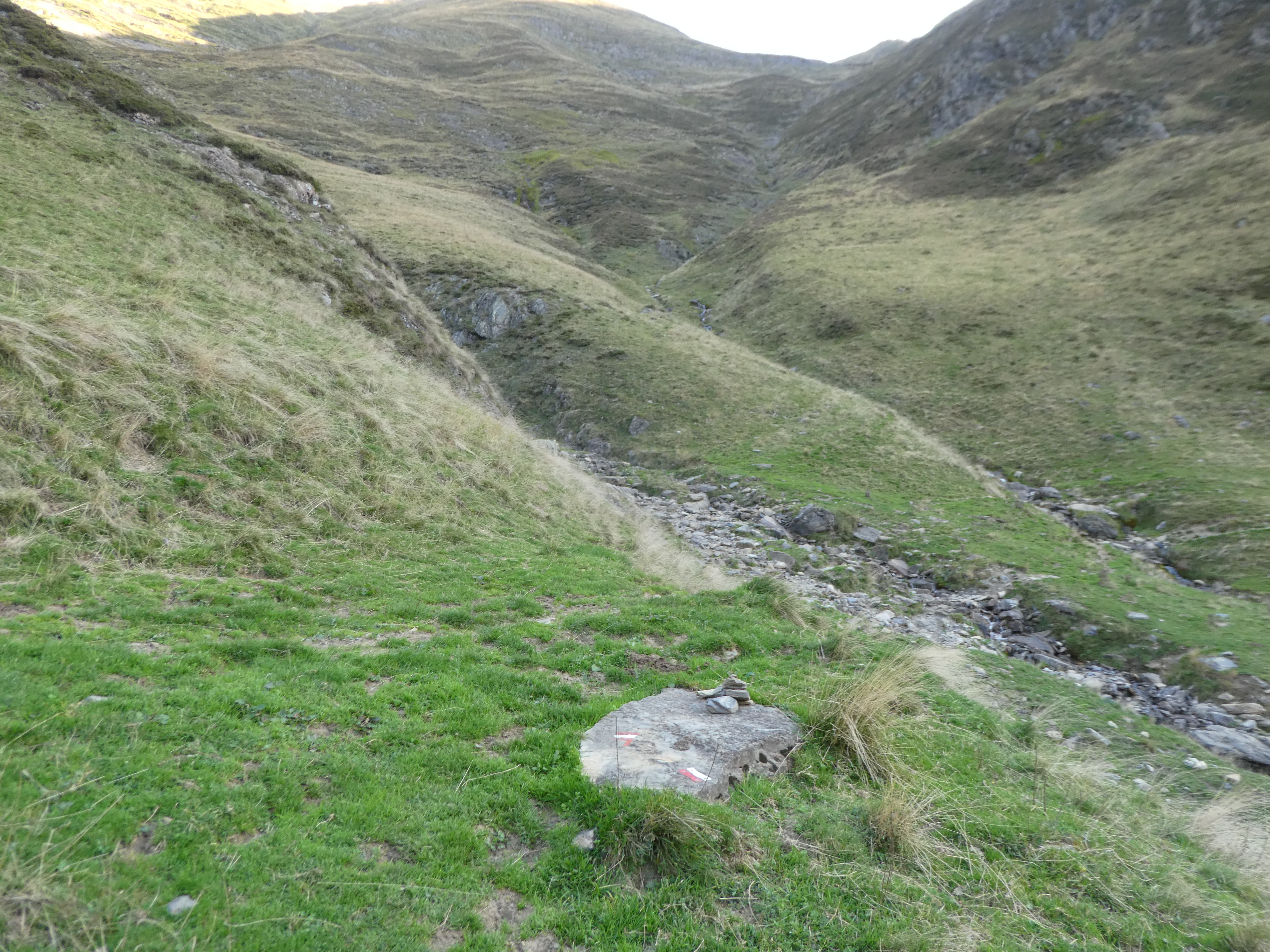 Dès que le faux-col est atteint (500 mètres après avoir atteint le couloir herbeux très raide), suivre le chemin partant tout droit et perdant un peu d'altitude direction Lane Fomente (le but est de rejoindre la ligne de crête du Lane Formente située en face) (quelques marques de peinture bleue sont présentes sur le chemin aidant à la progression)