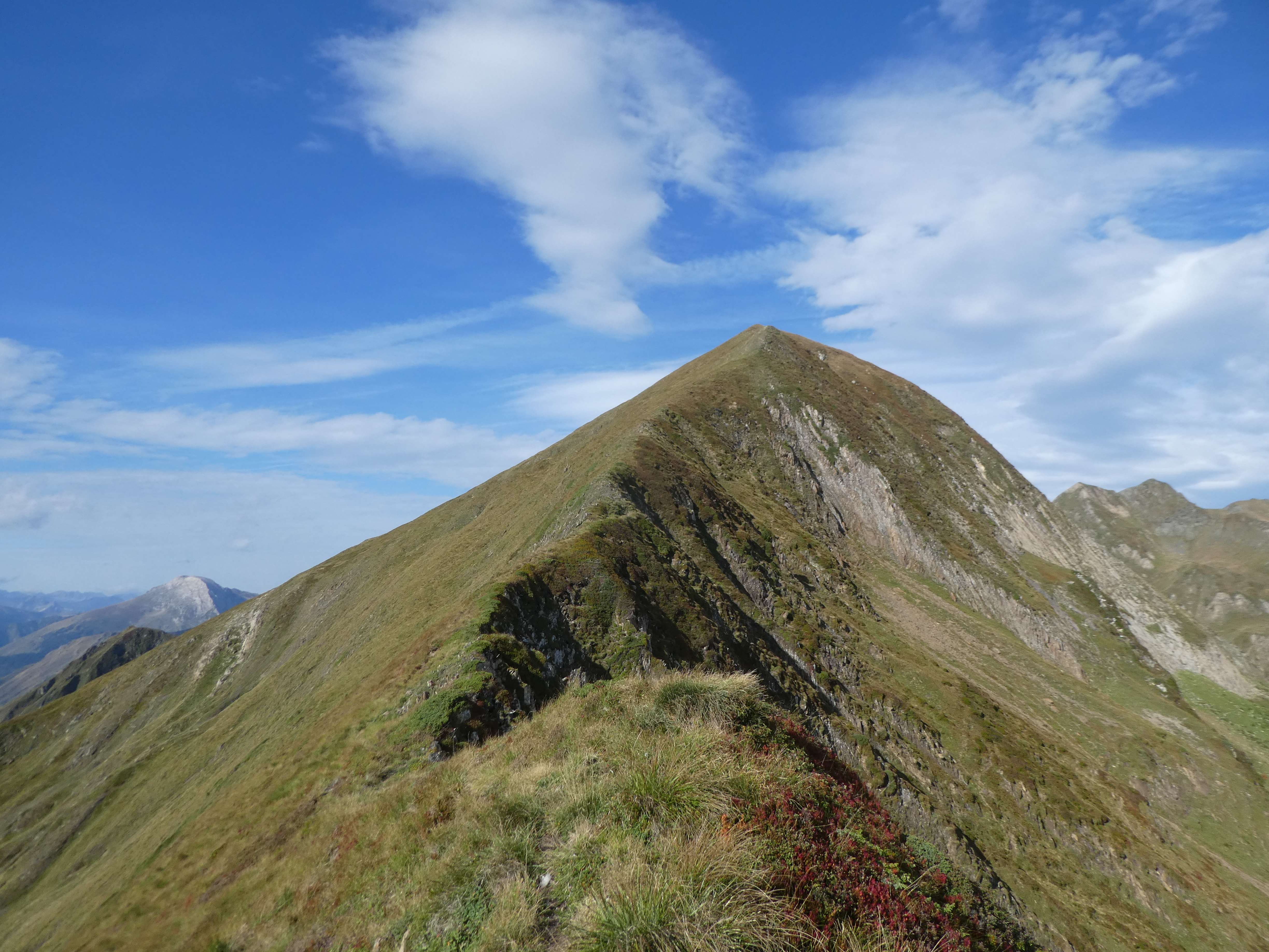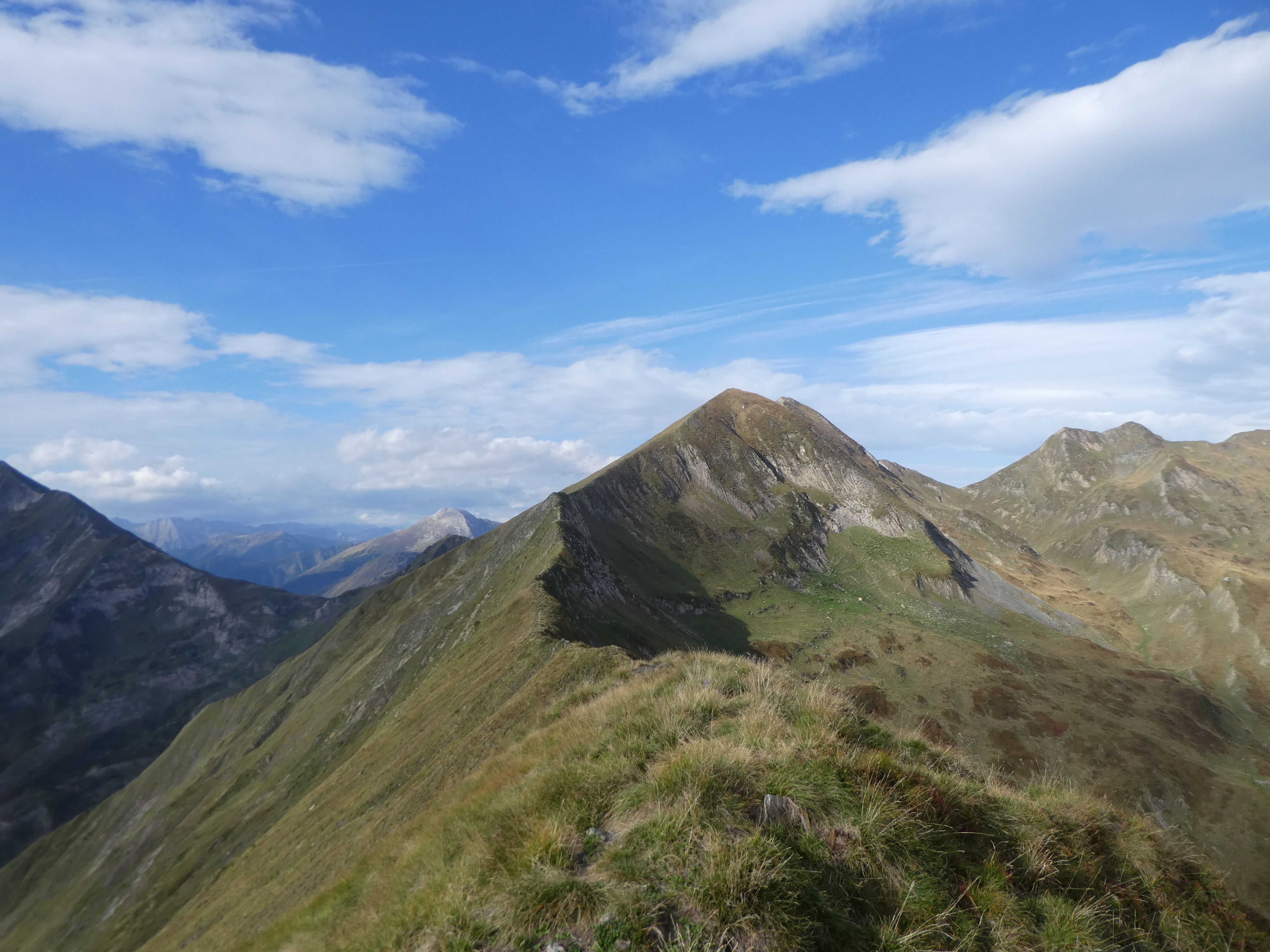 Dès que le chemin de crête vient buter contre ce piton rocheux (200 mètres après le col), contourner ce dernier sur la gauche puis suivre de nouveau le fil de crête direction Pic de Montaud