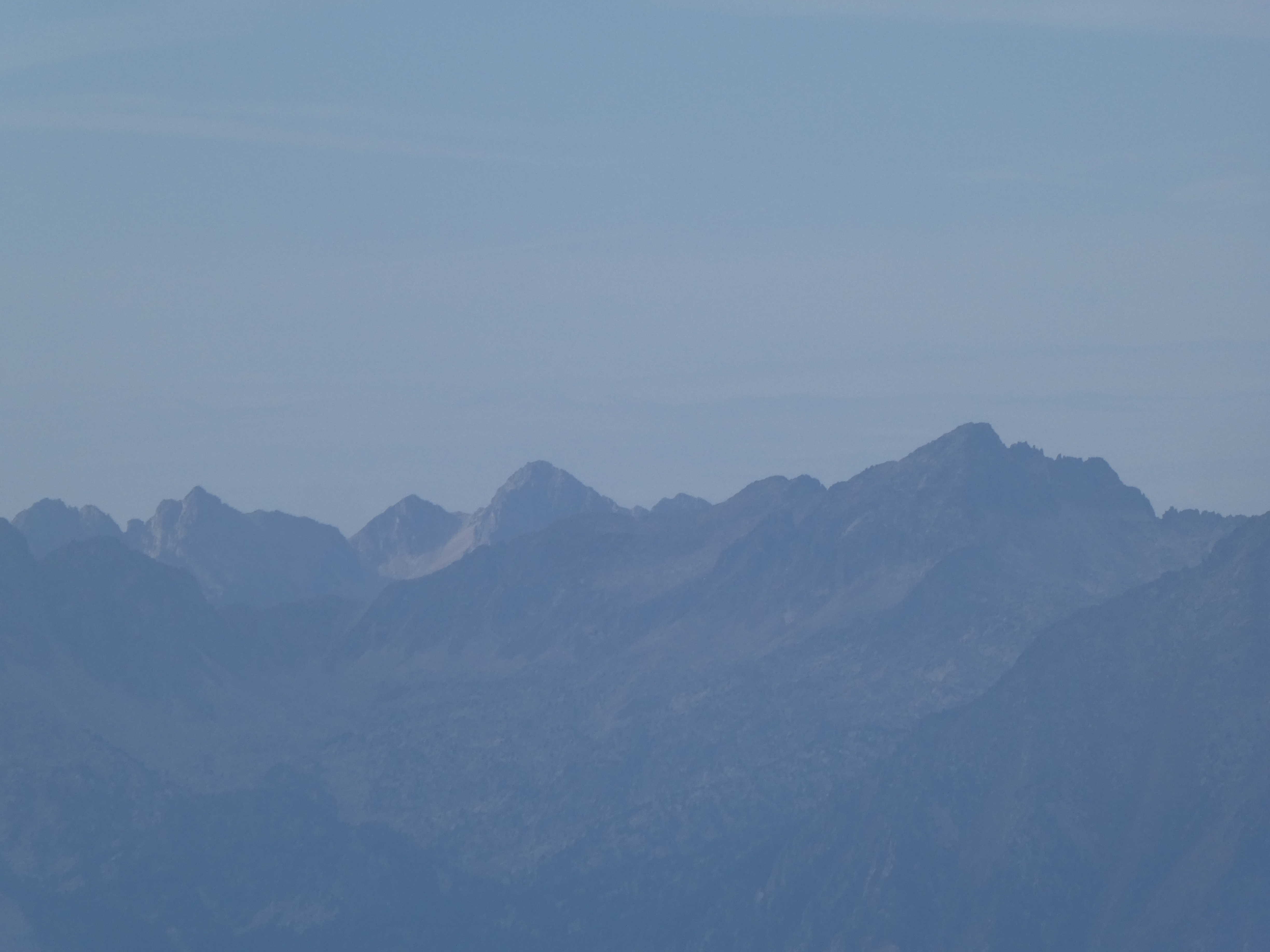 Zoom sur le Pui de la Bonaigua (2776 m) à gauche, le Pic de Bassiero (2902 m) au centre et le Pic de Xemeneies (2768 m) au centre-droit