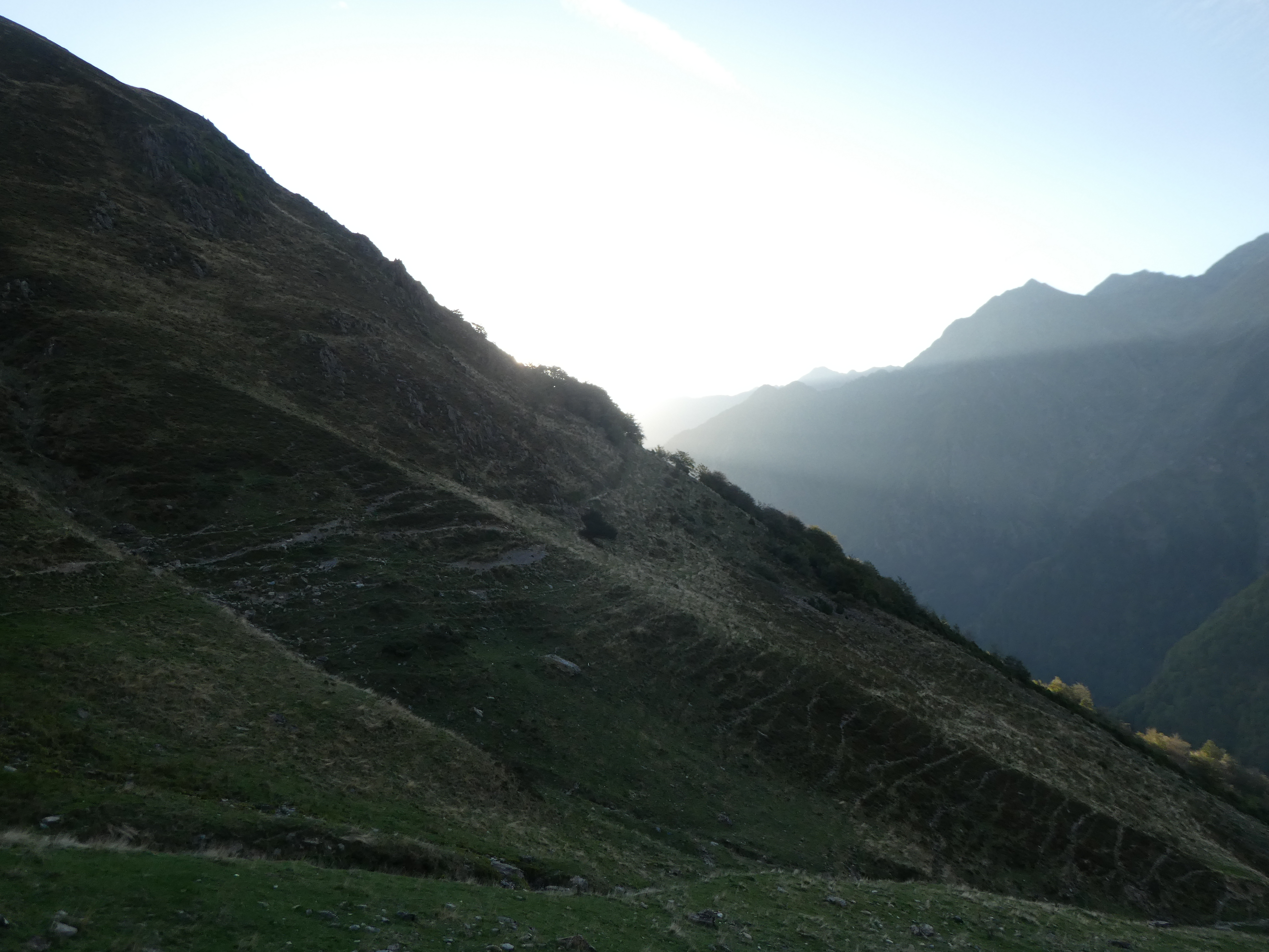 Dès que le sentier en dévers vient buter contre un couloir herbeux très raide (600 mètres après le précédent croisement), suivre le chemin mal tracé montant sur la gauche et prenant un cap plein Nord direction Lane Formente