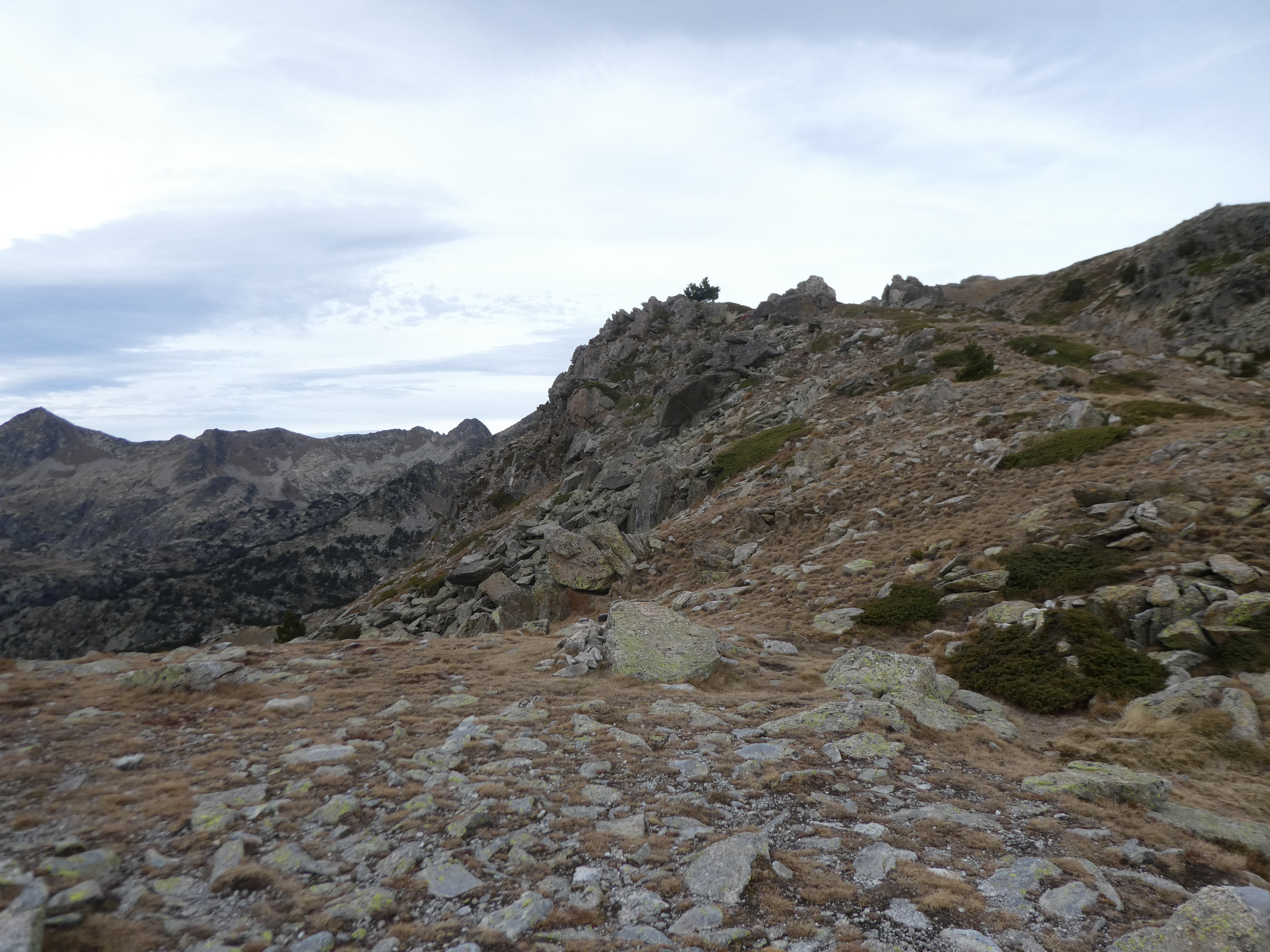 Dès que le fil de crête du Cirque du Pedros est atteint (300 mètres après avoir quitté le Puig Pedros Sud), suivre le semblant de chemin cairné partant tout droit direction Étang des Bésines