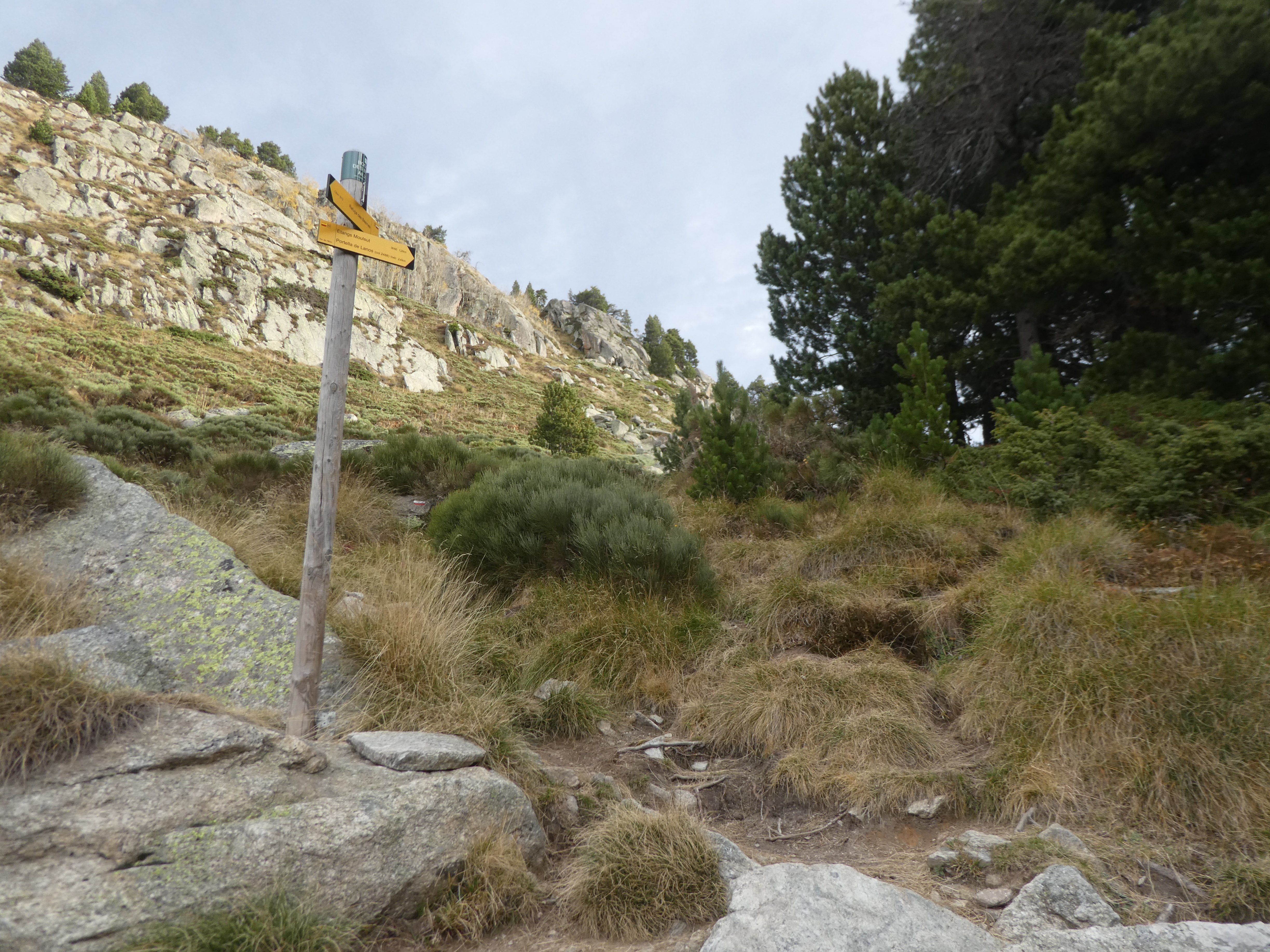 Bosquet des Bésines (2097 m) : suivre le GRP Tour des Pérics partant sur la droite direction Portella de Lanós, balisé en jaune et rouge dorénavant