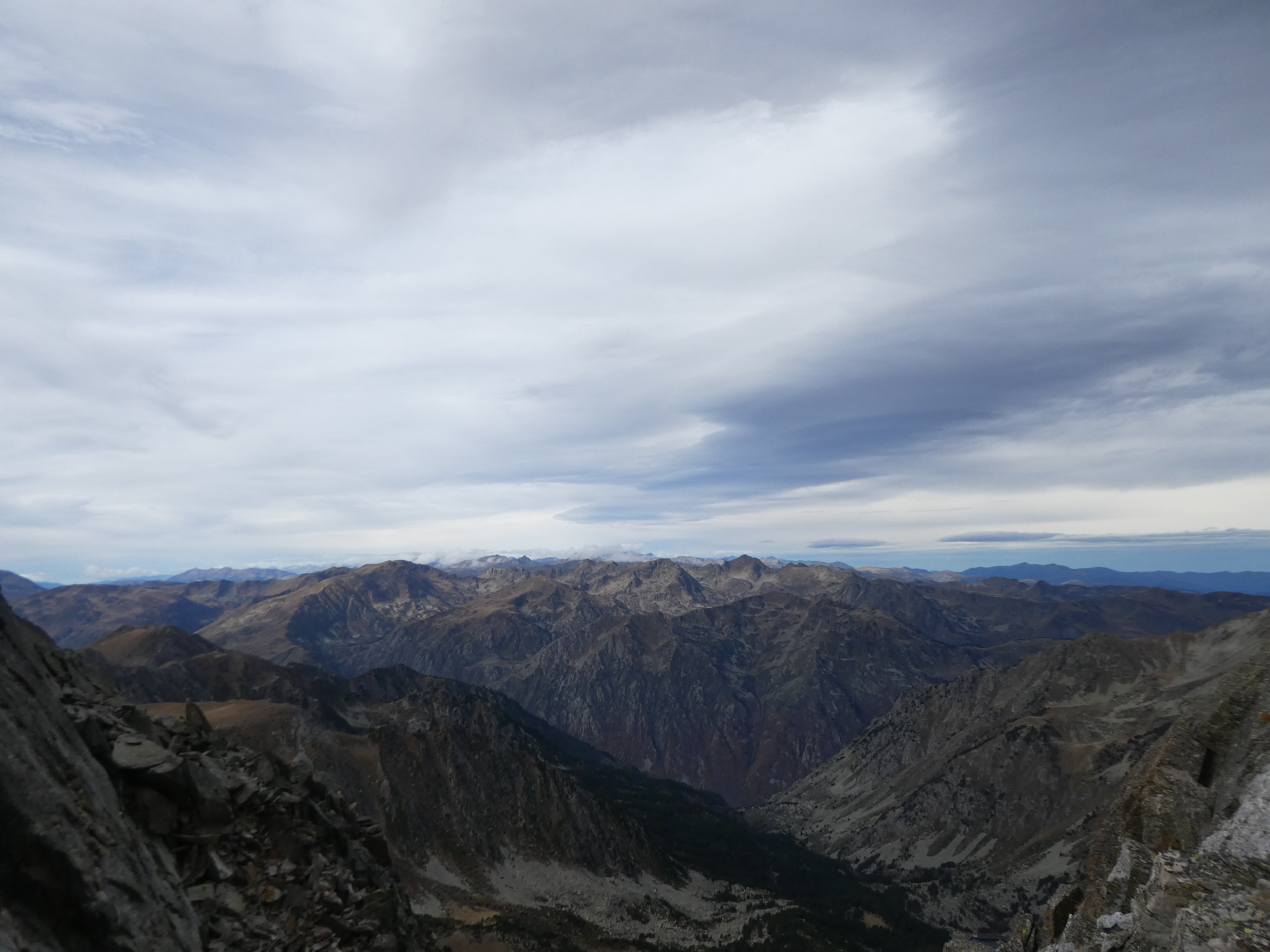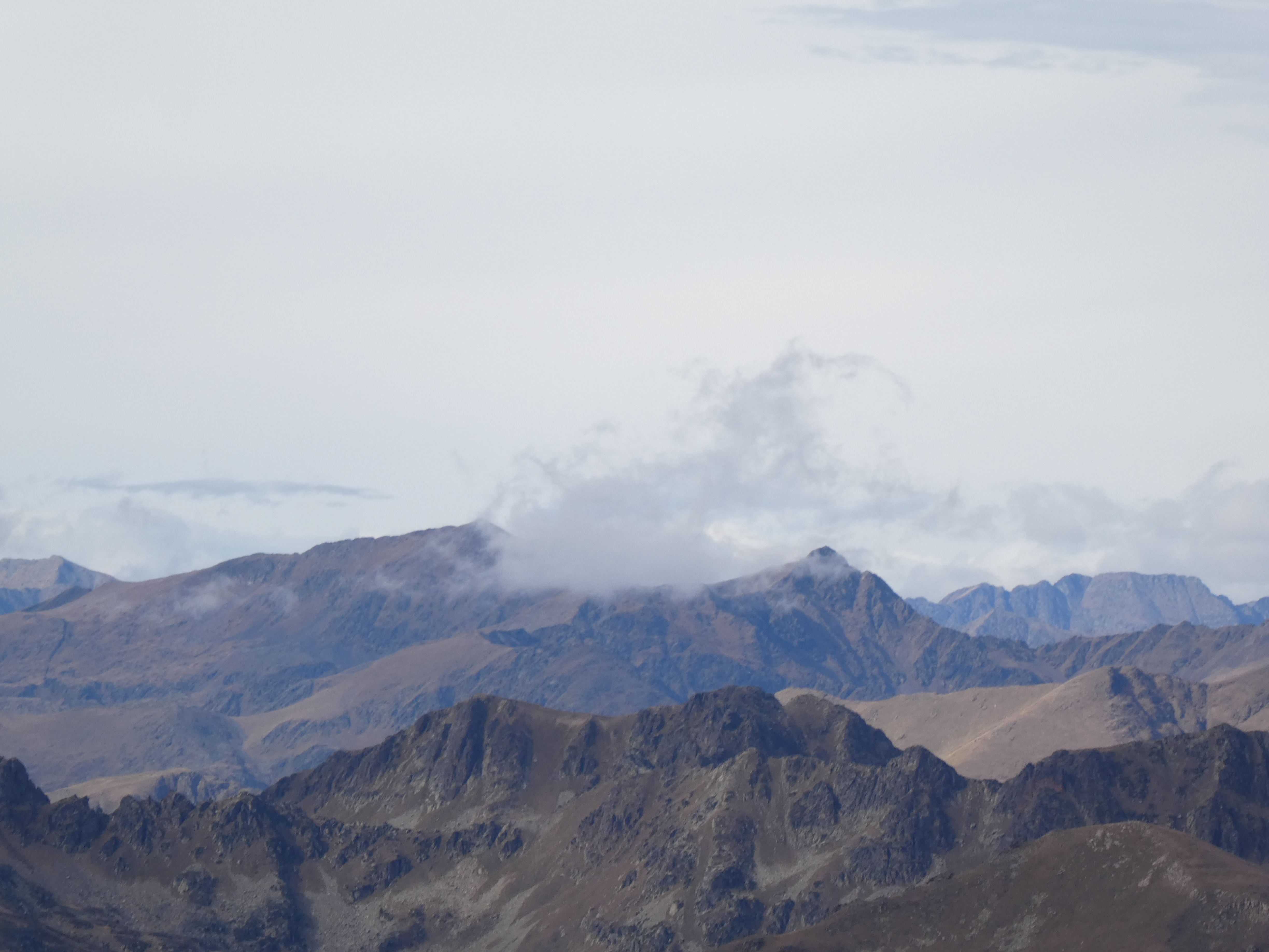 Zoom sur le Pic de l'Estanyó (2915 m) partiellement dans les nuages au centre-gauche et le Pic de la Cabaneta (2862 m) au centre-droit