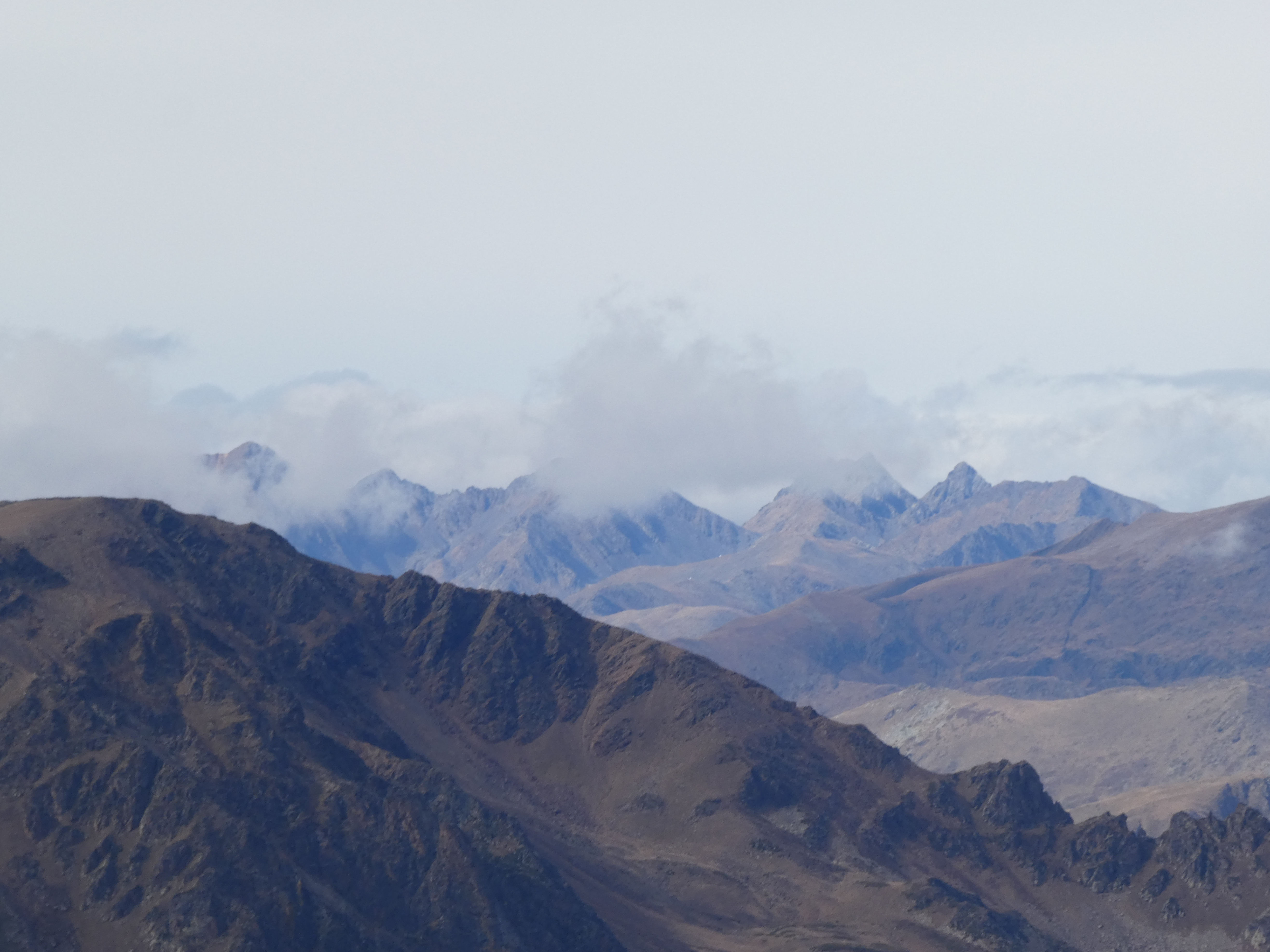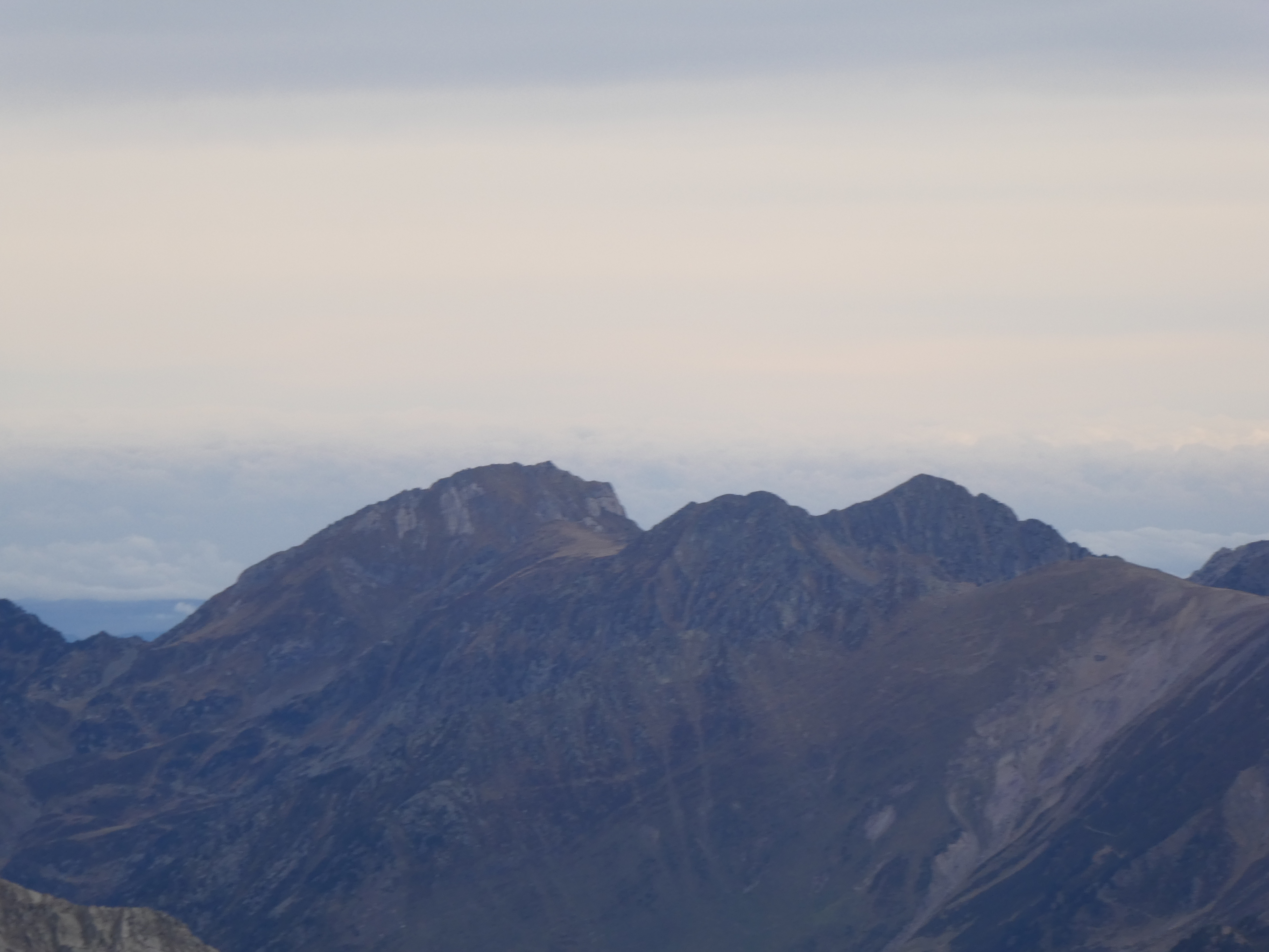 Zoom sur le Pic de l'Infern (2868 m) à gauche, le Pic Inferior de la Vaca (2820 m) au centre et le Pic Superior de la Vaca (2826 m) à droite dans les nuages