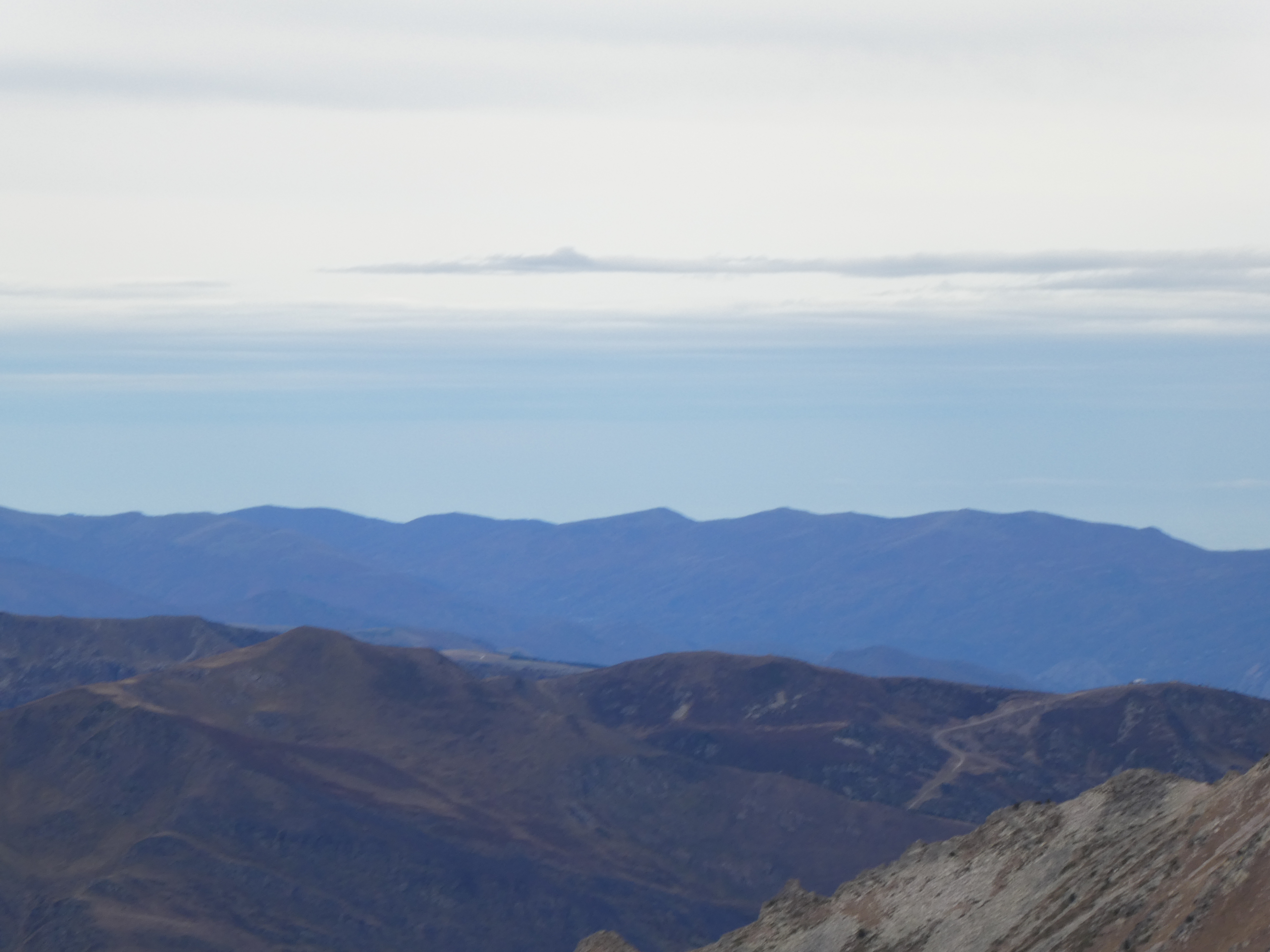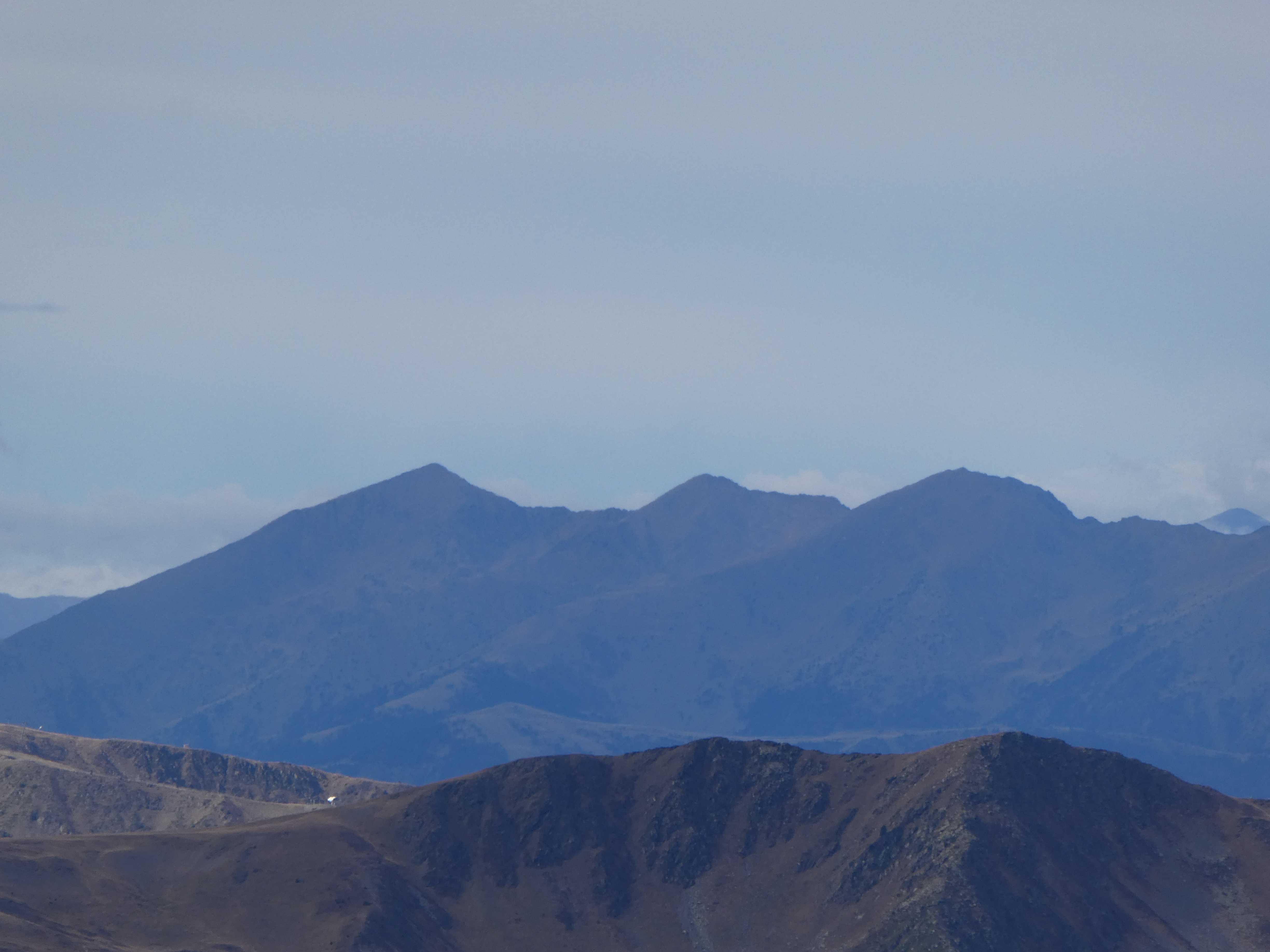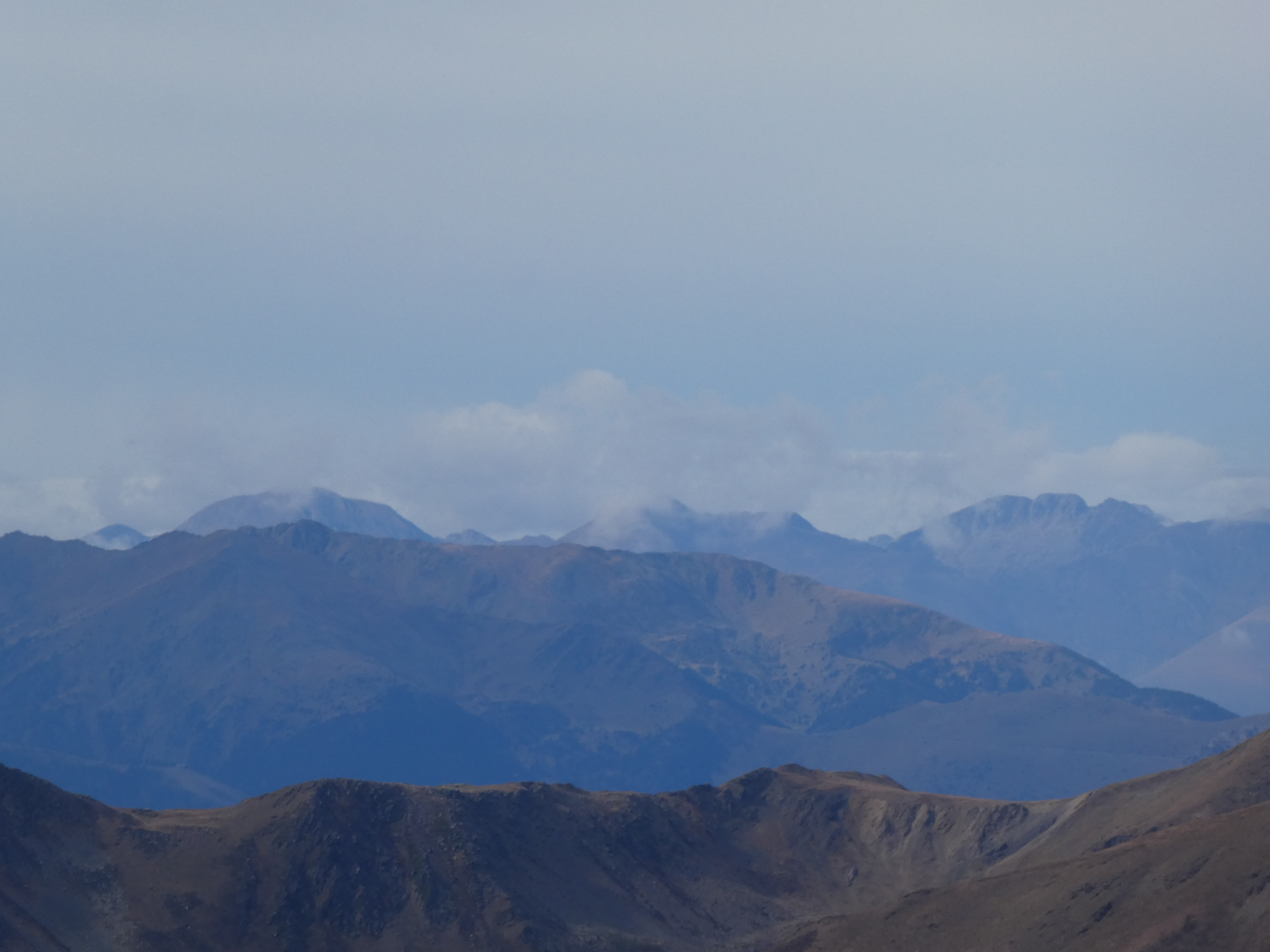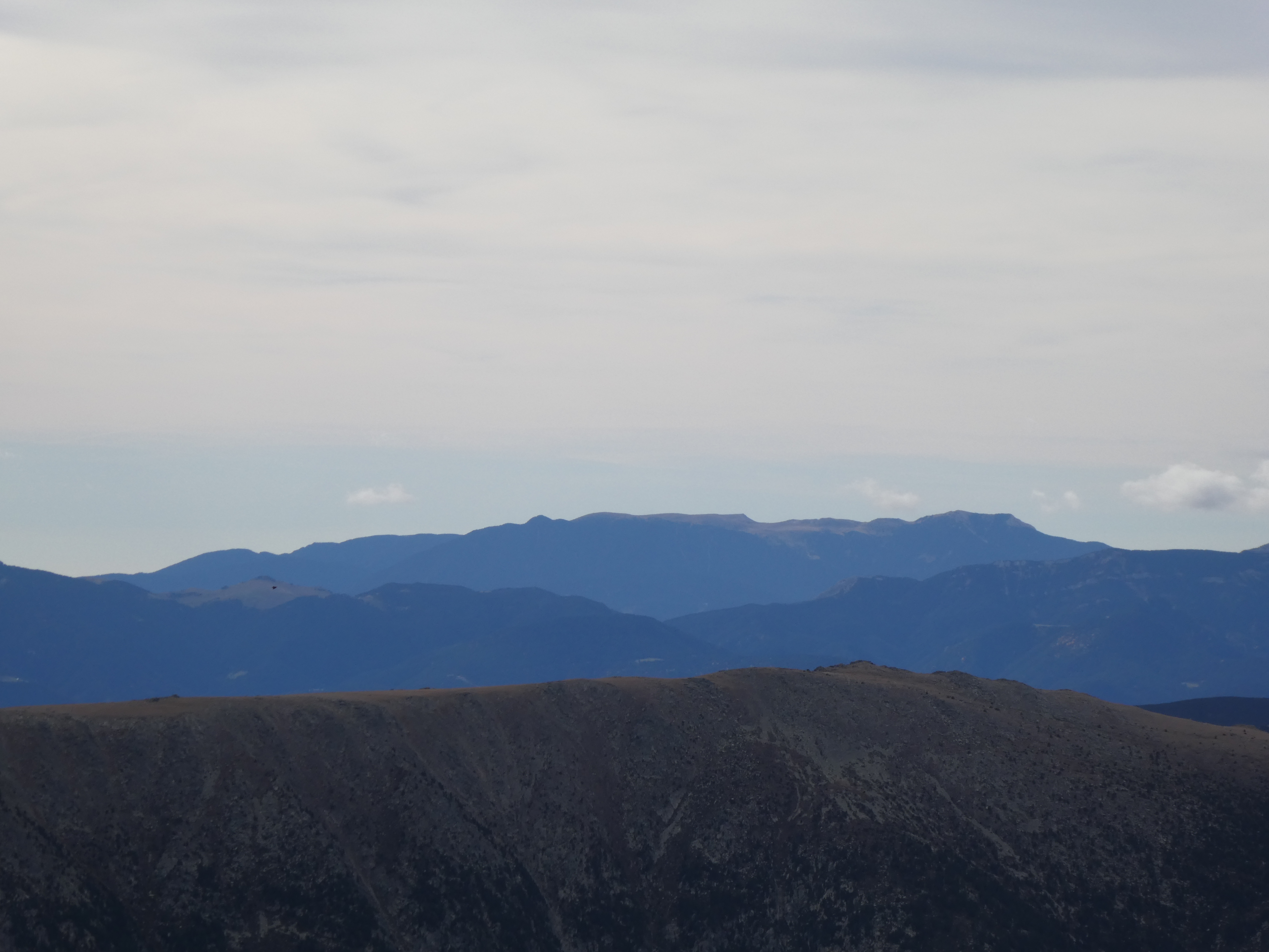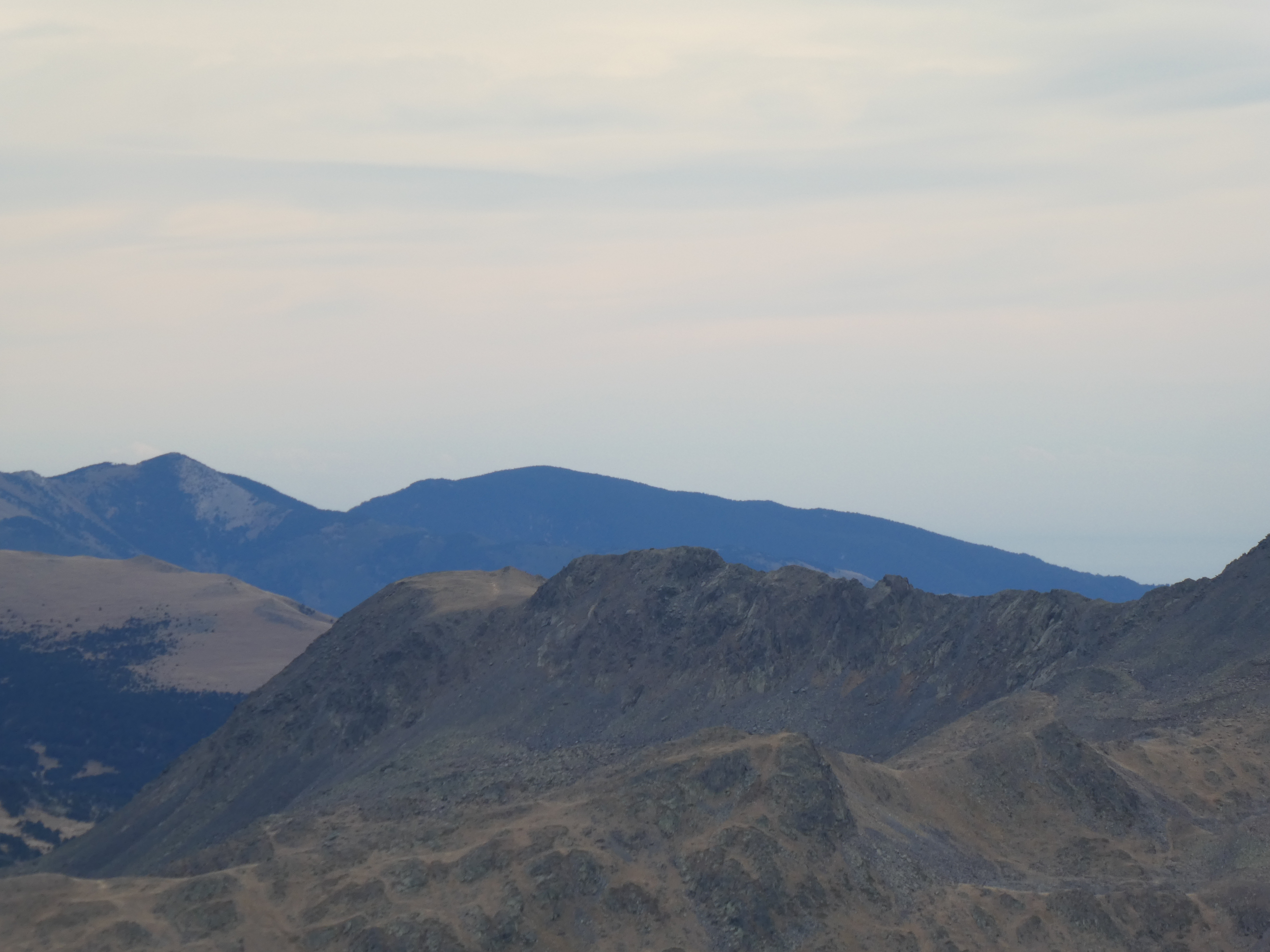 Zoom sur les Suquetes (2200 m) au centre-gauche et les Penyes Altes de Moixeró (2274 m) au centre-droit ... en arrière-plan, on aperçoit les sommets dentelés du massif de Montserrat