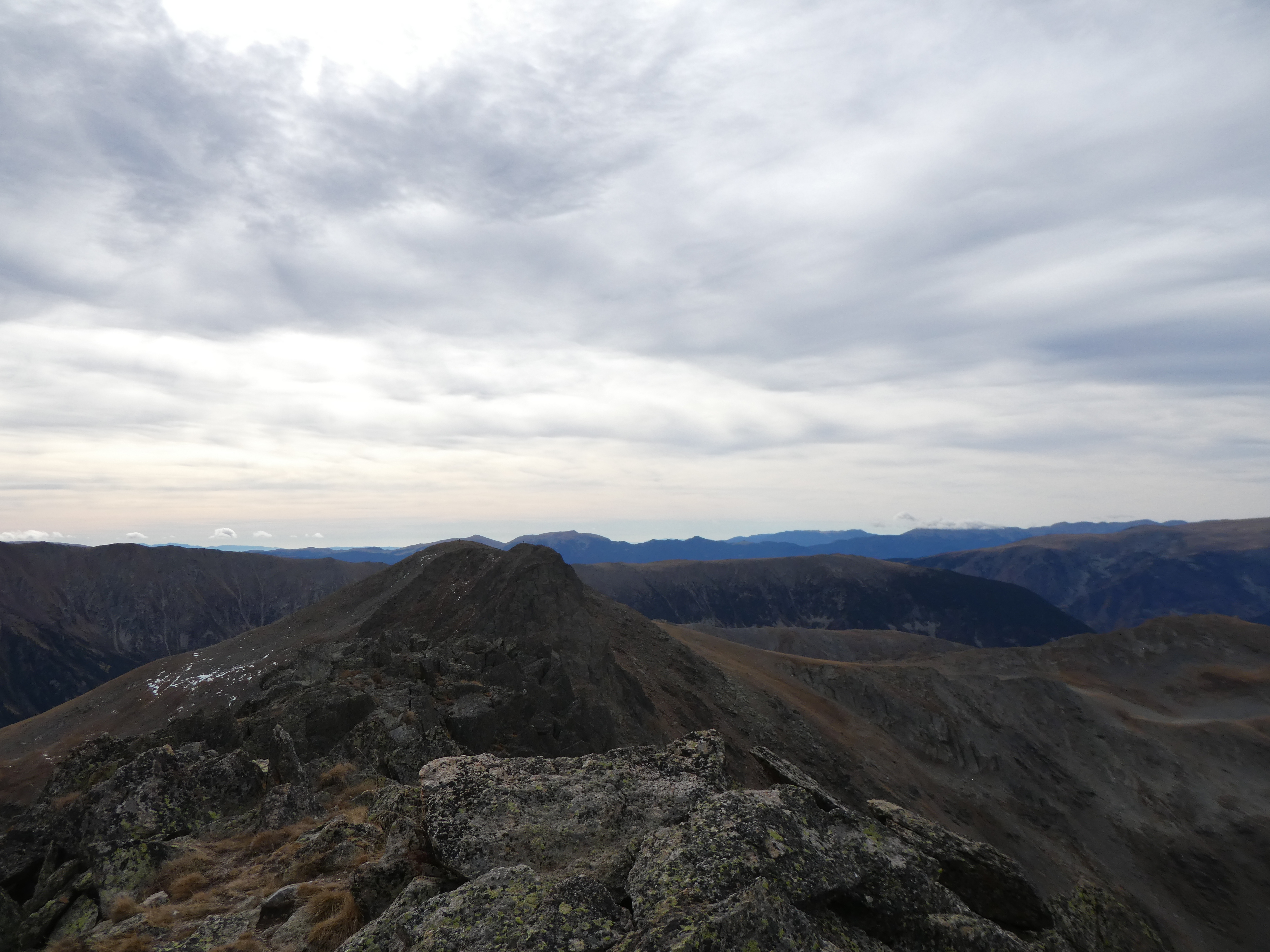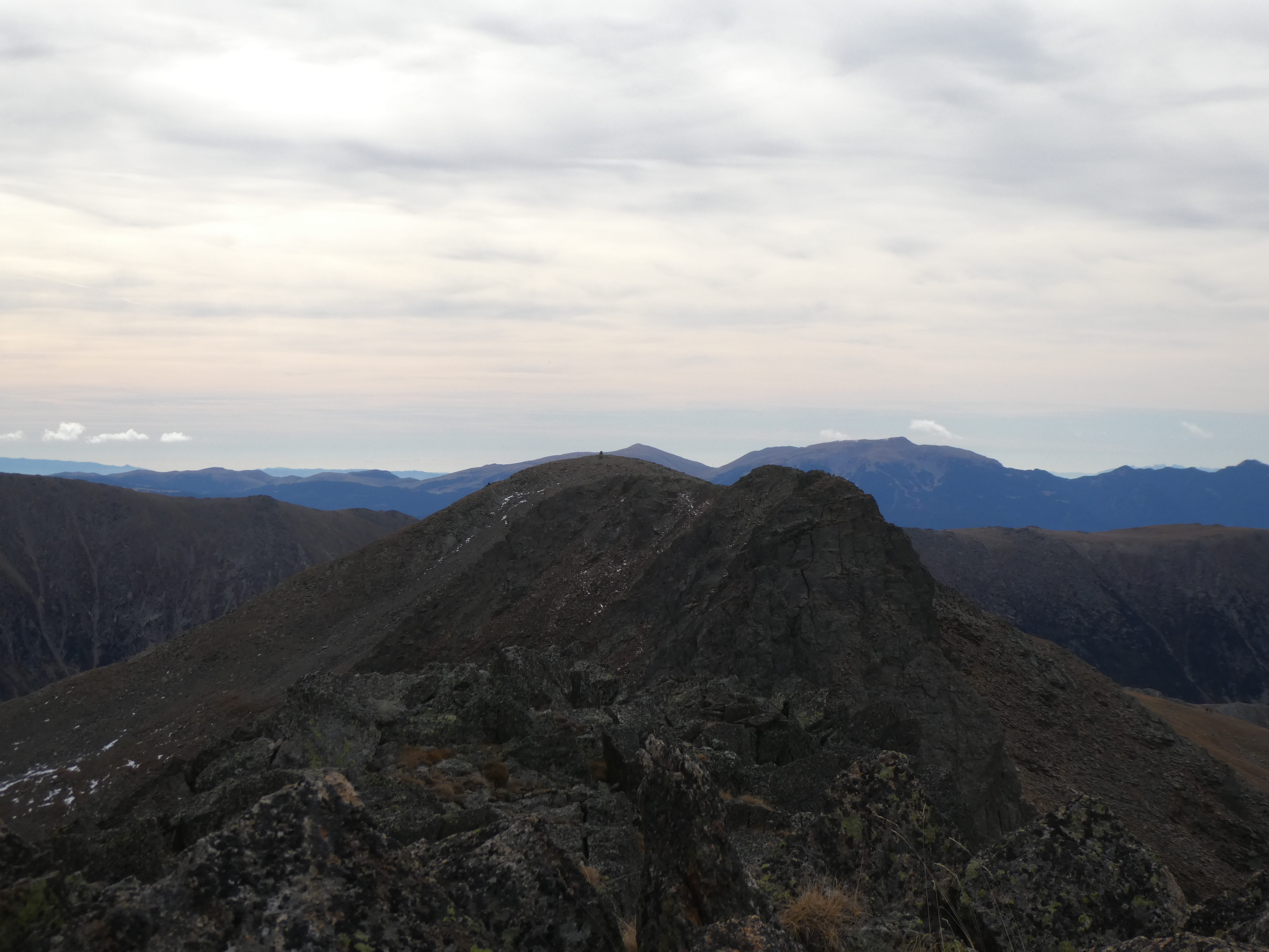 Arrivée au sommet du Puig Pedros Sud ou Puigpedrós de Lanós (2842 m) : panorama semblable à celui du Puig Pedros Nord avec vue plus étendue sur les sommets de la Cerdanya et de l'Alt Urgell