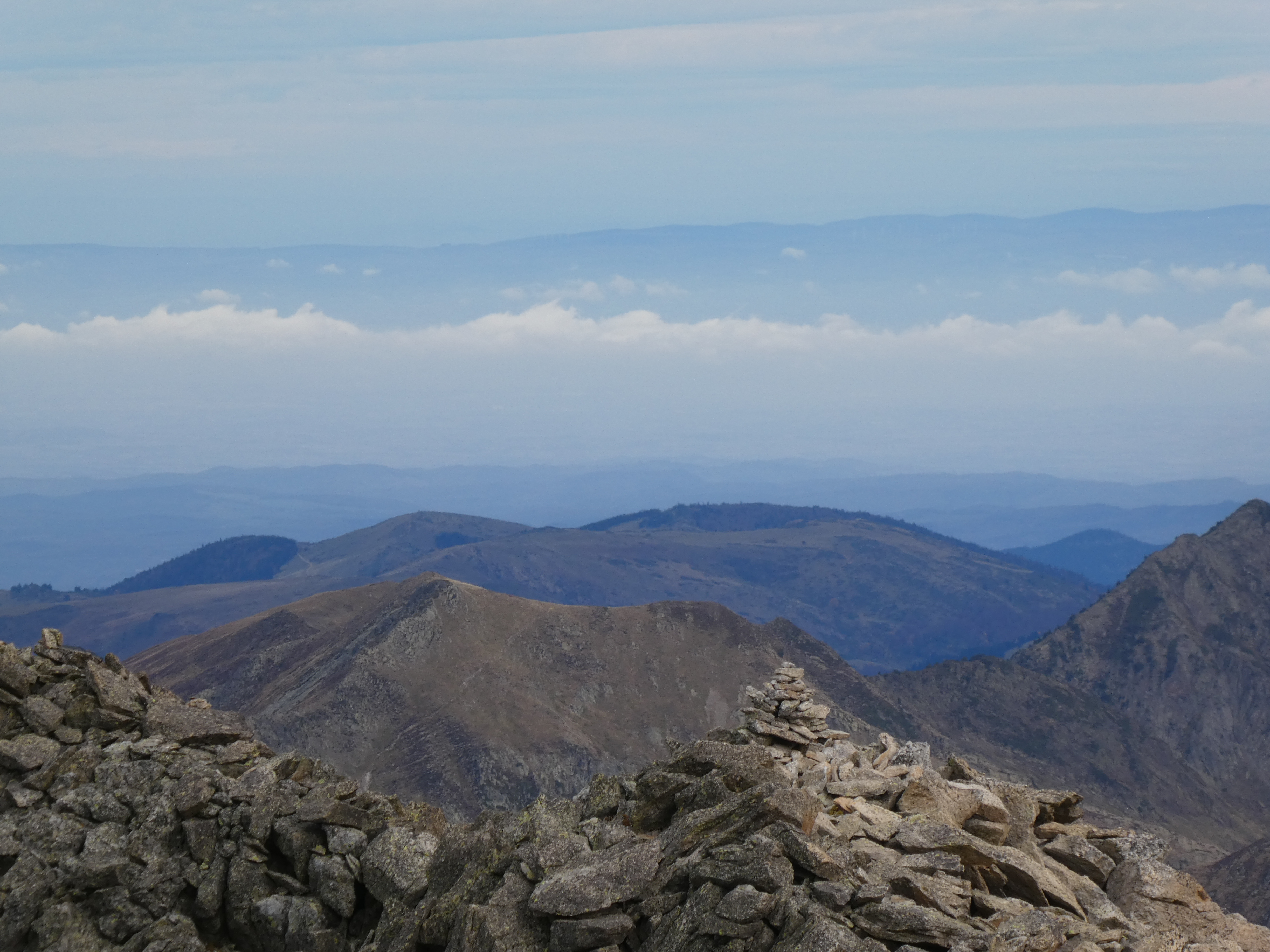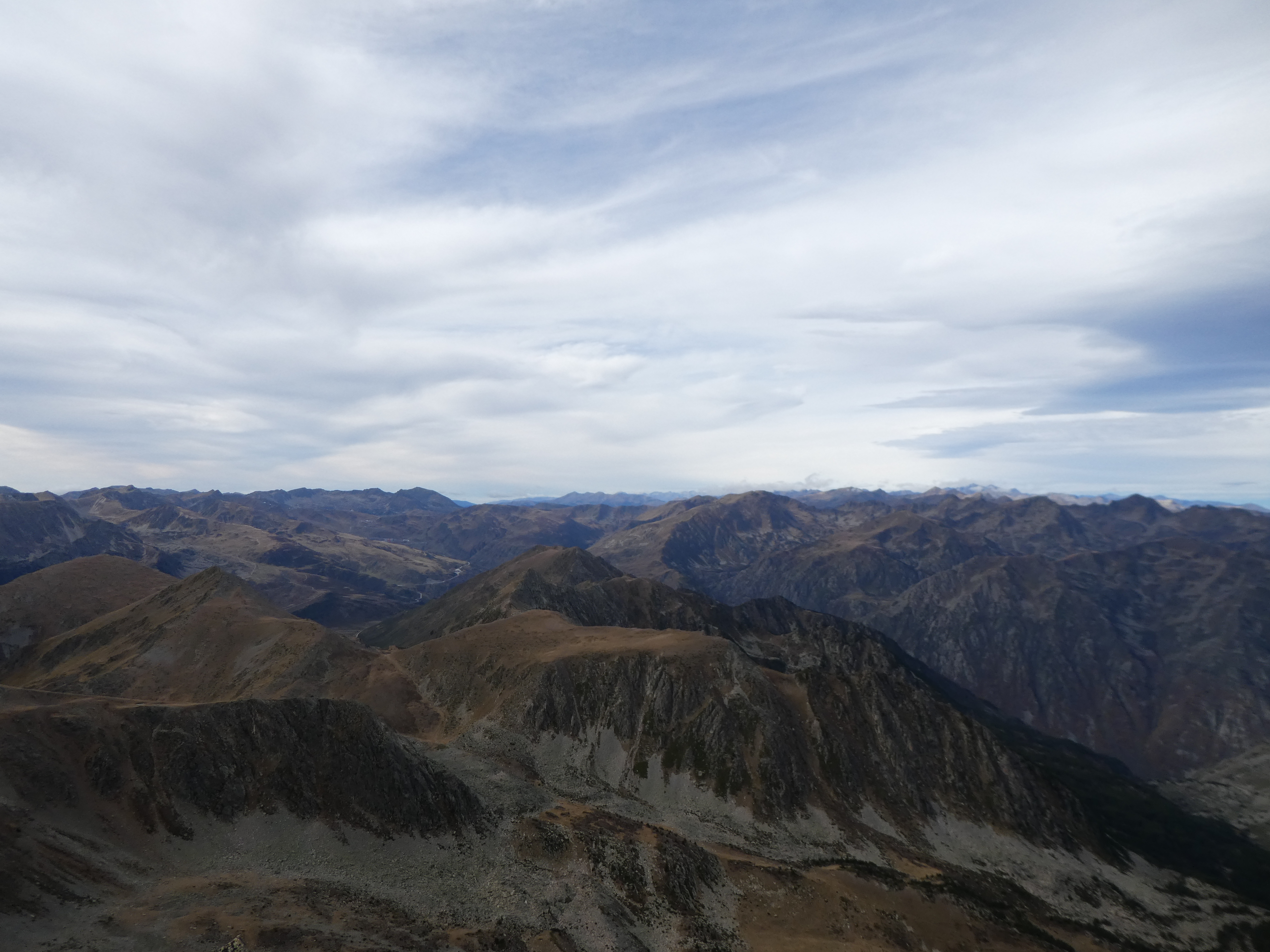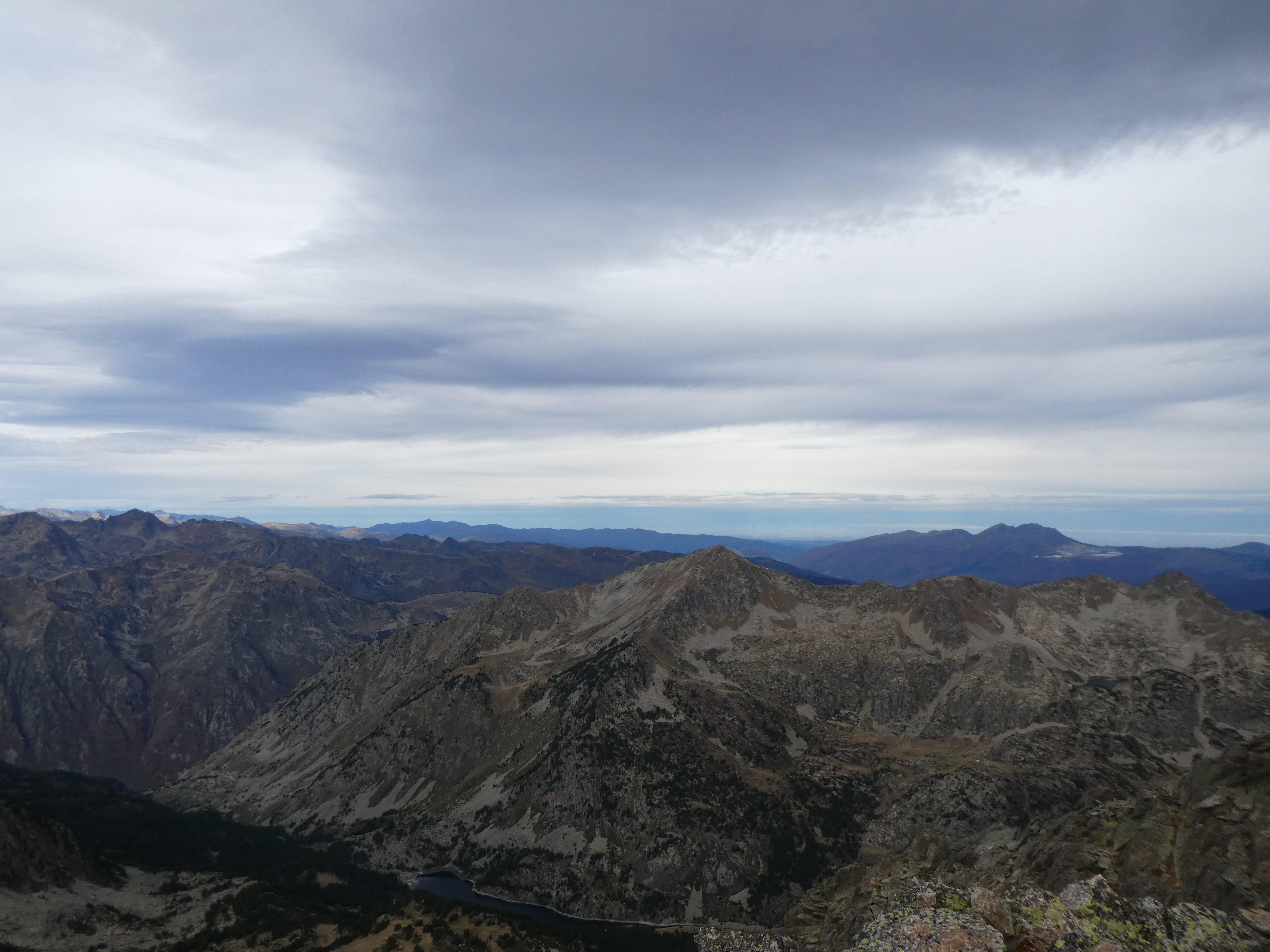 Arrivée au sommet du Puig Pedros Nord (2830 m) : beau panorama sur les sommets de la Haute-Ariège, du Donezan, du Capcir, de la Haute-Cerdagne, de la Cerdanya, de l'Alt Urgell, de l'Andorre, du Pallars Sobirà et des Monts d'Olmes