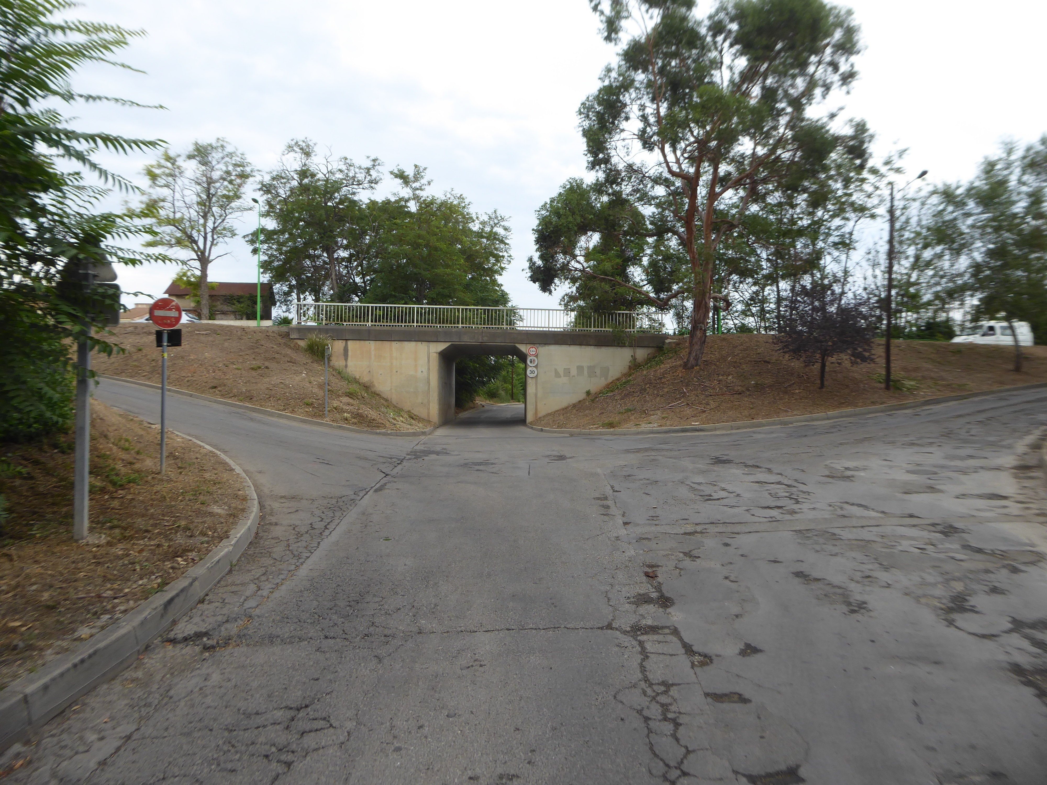 A cette intersection entre deux tunnels, suivre la route montant sur la droite vers un rond-point direction Saint-Gilles, balisé en rouge et blanc