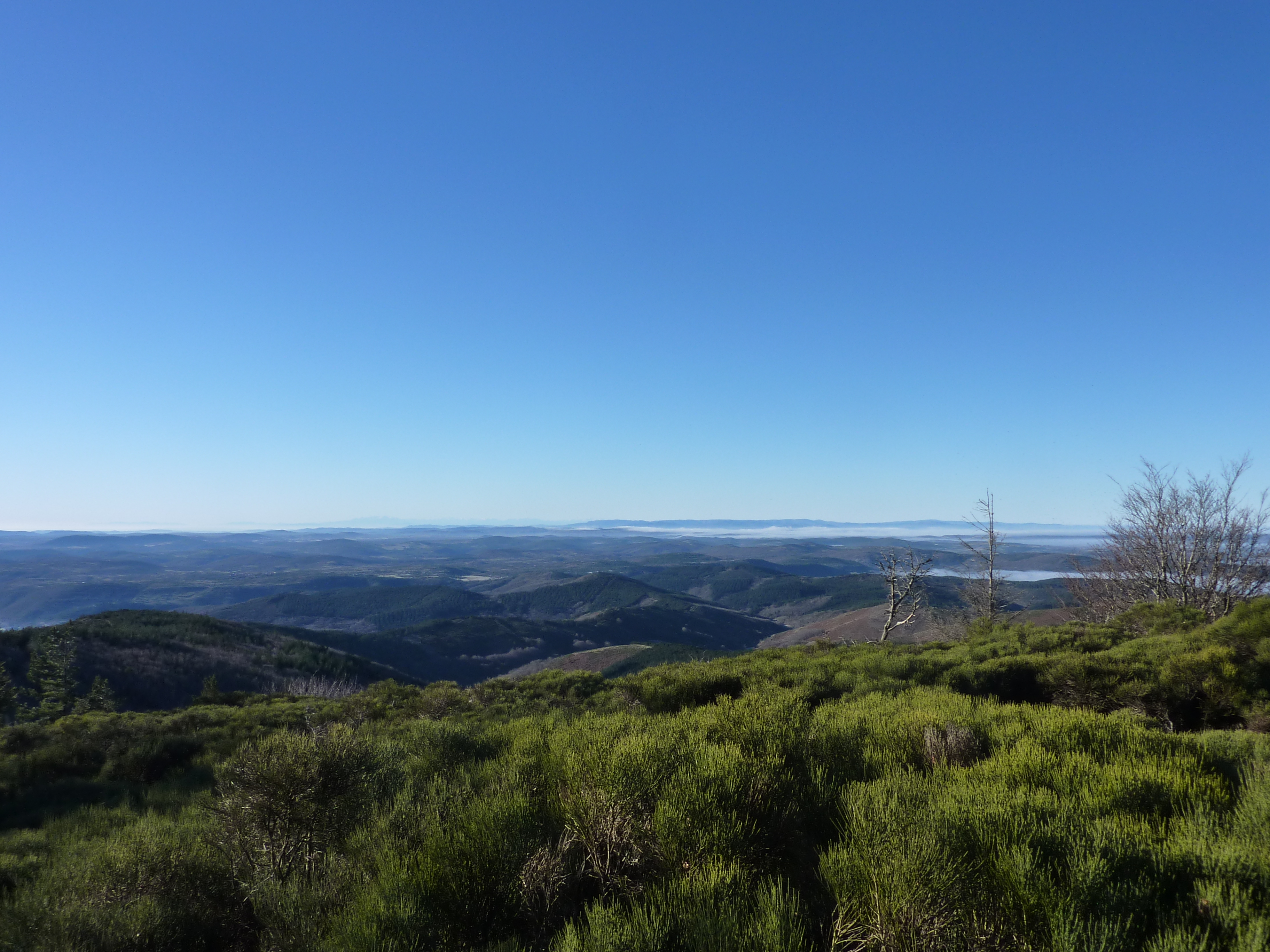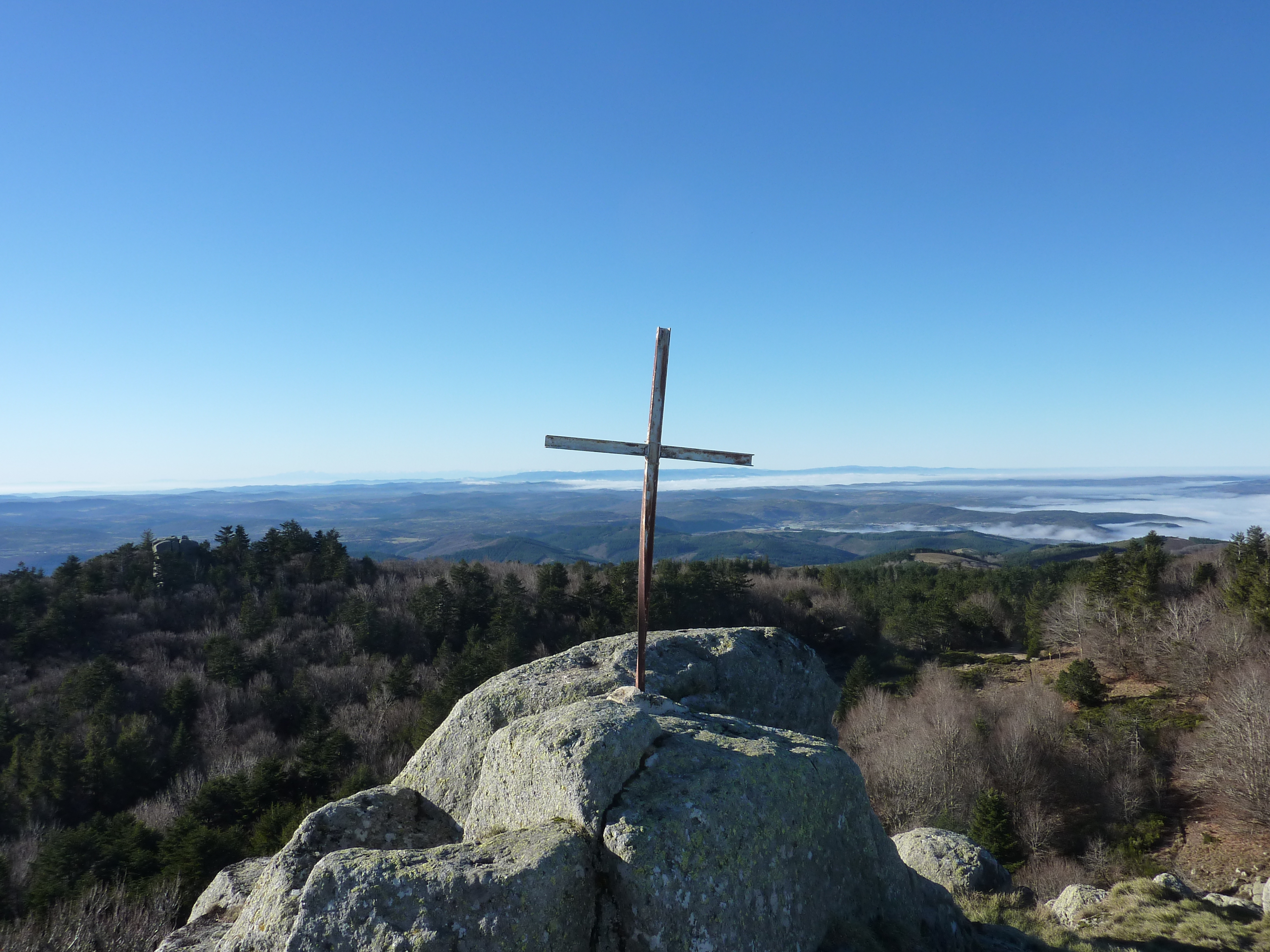 Arrivée au sommet du Saint-Guiral (1366 m) : magnifique panorama aujourd'hui sur les Cévennes gardoises, les sommets héraultais du Piémont Cévenol et du Haut-Languedoc, les causses aveyronnais et les Pyrénées catalanes enneigées au loin