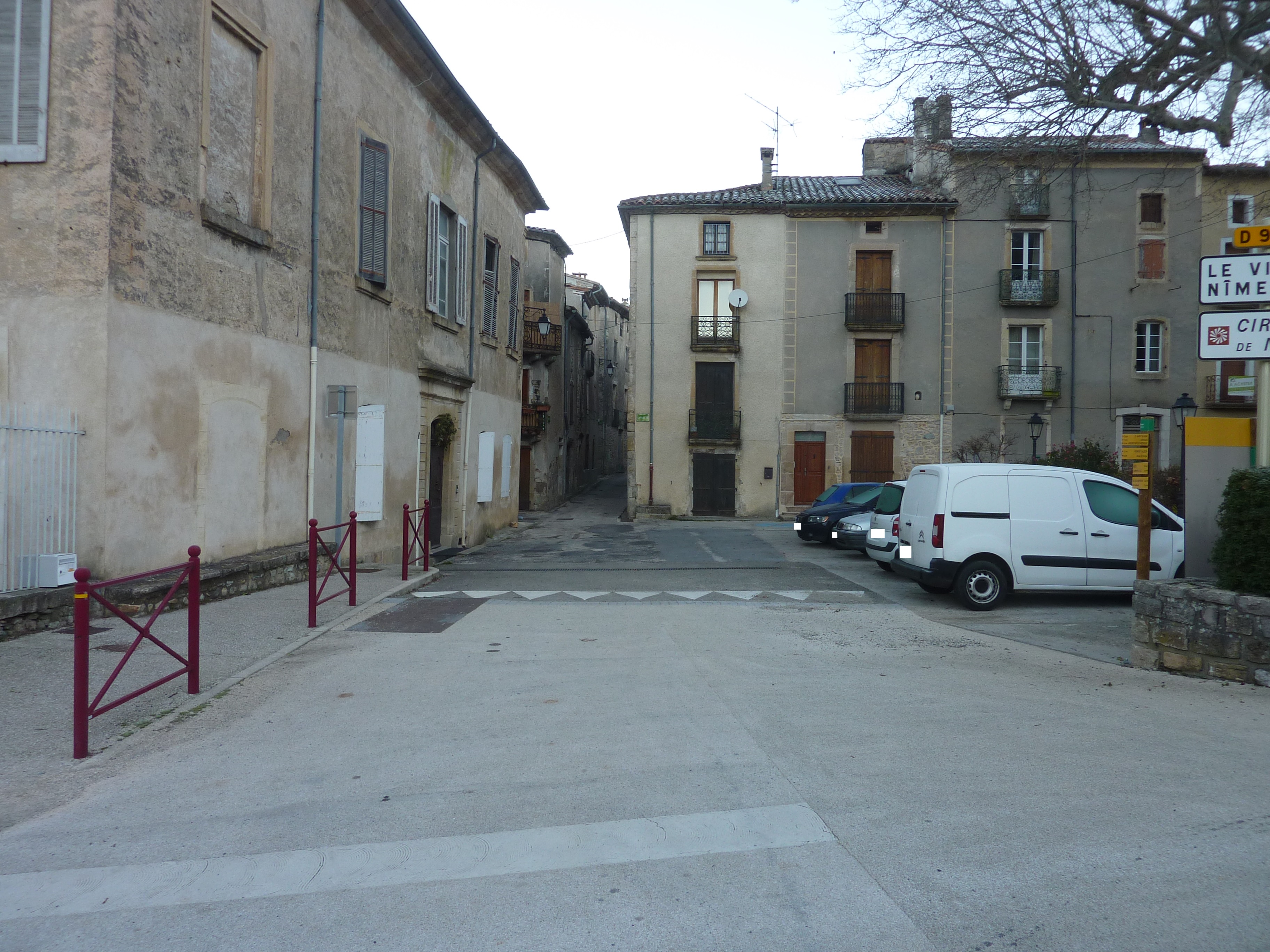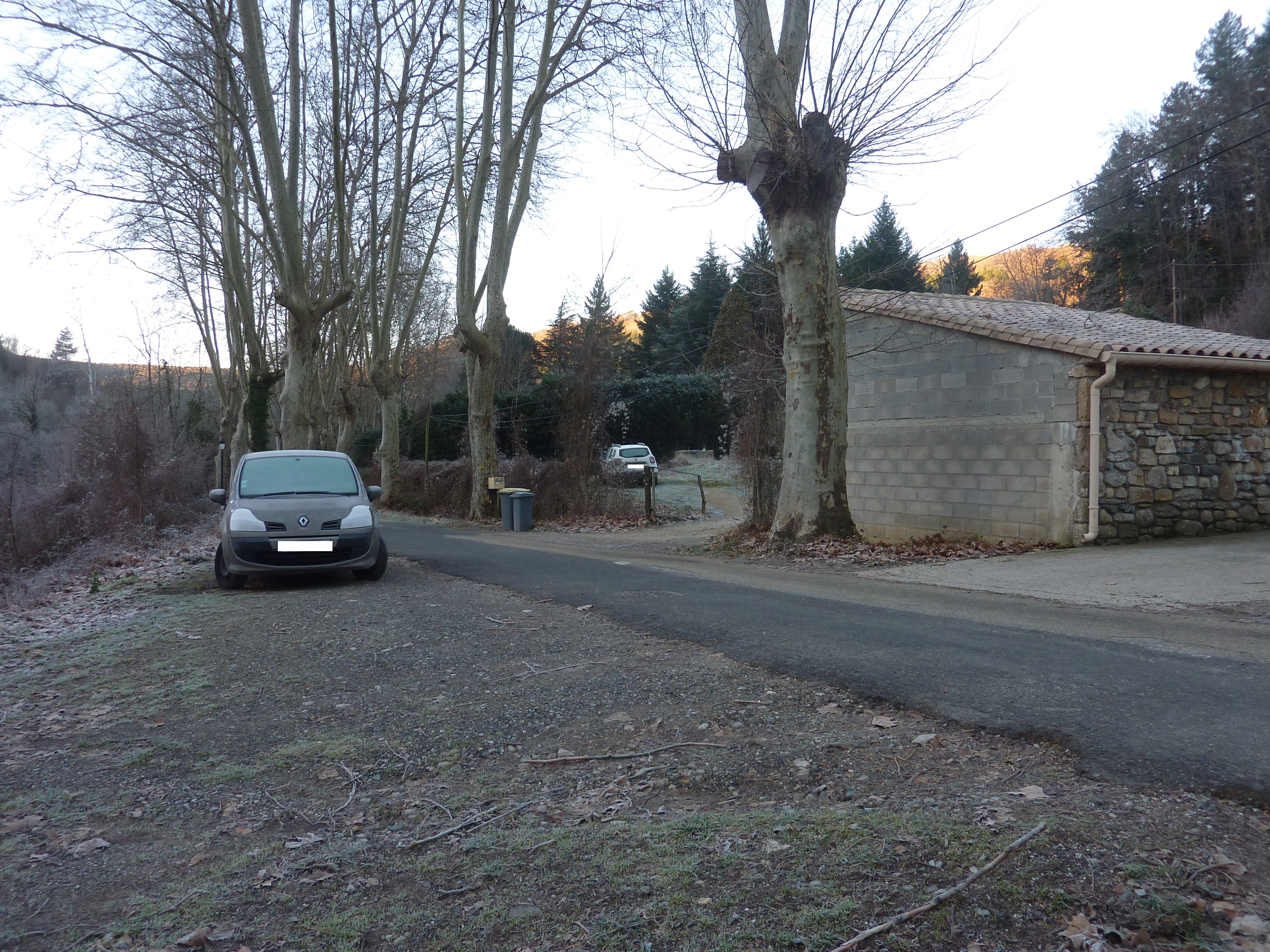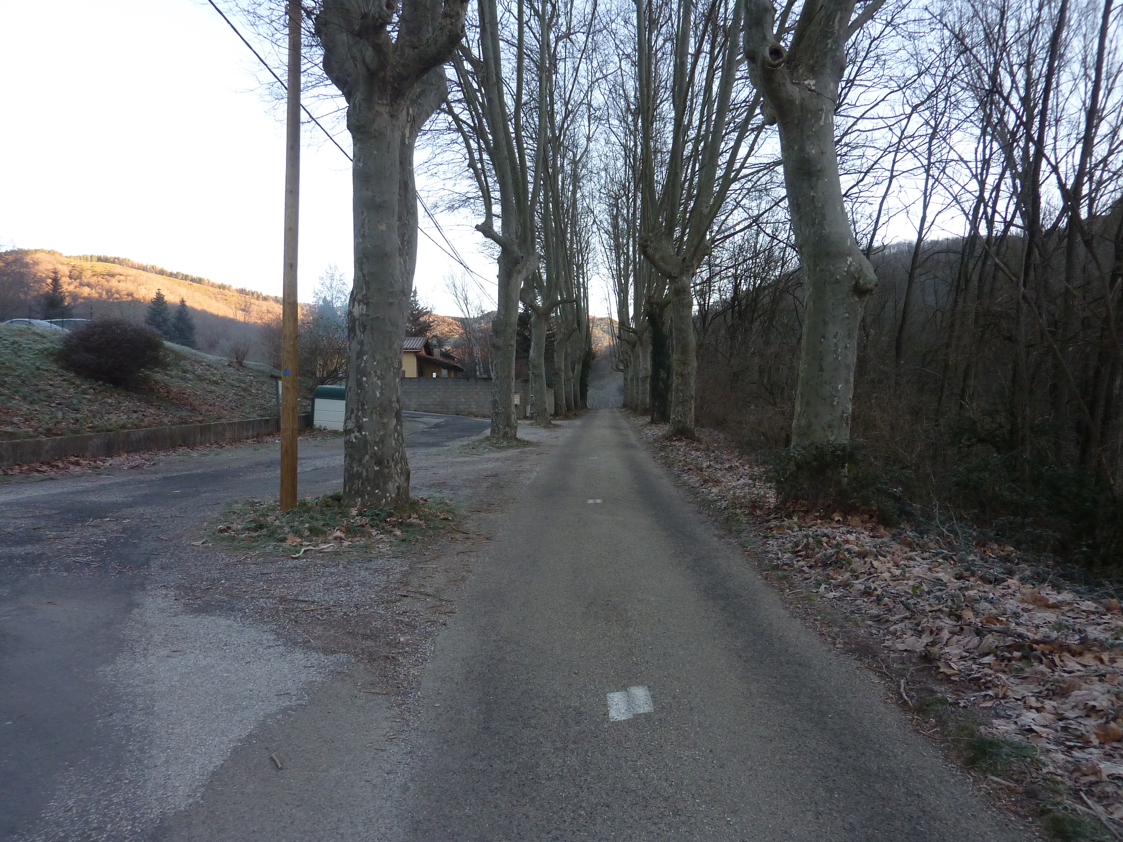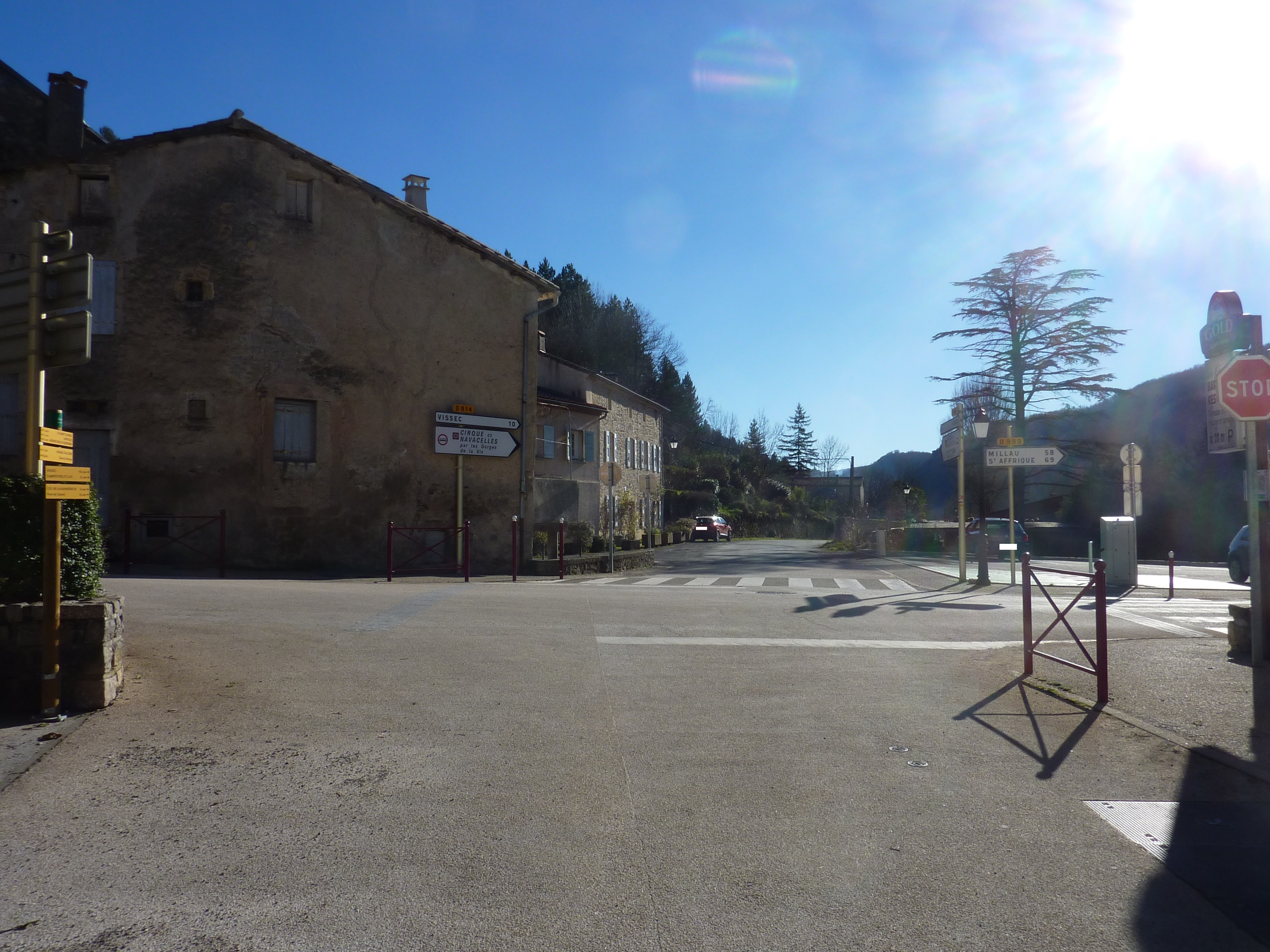 A ce croisement avec la route venant du centre d'Alzon (50 mètres après le pont enjambant la Vis), suivre cette dernière sur la droite direction Saint-Guiral, balisé en rouge et blanc, et en jaune