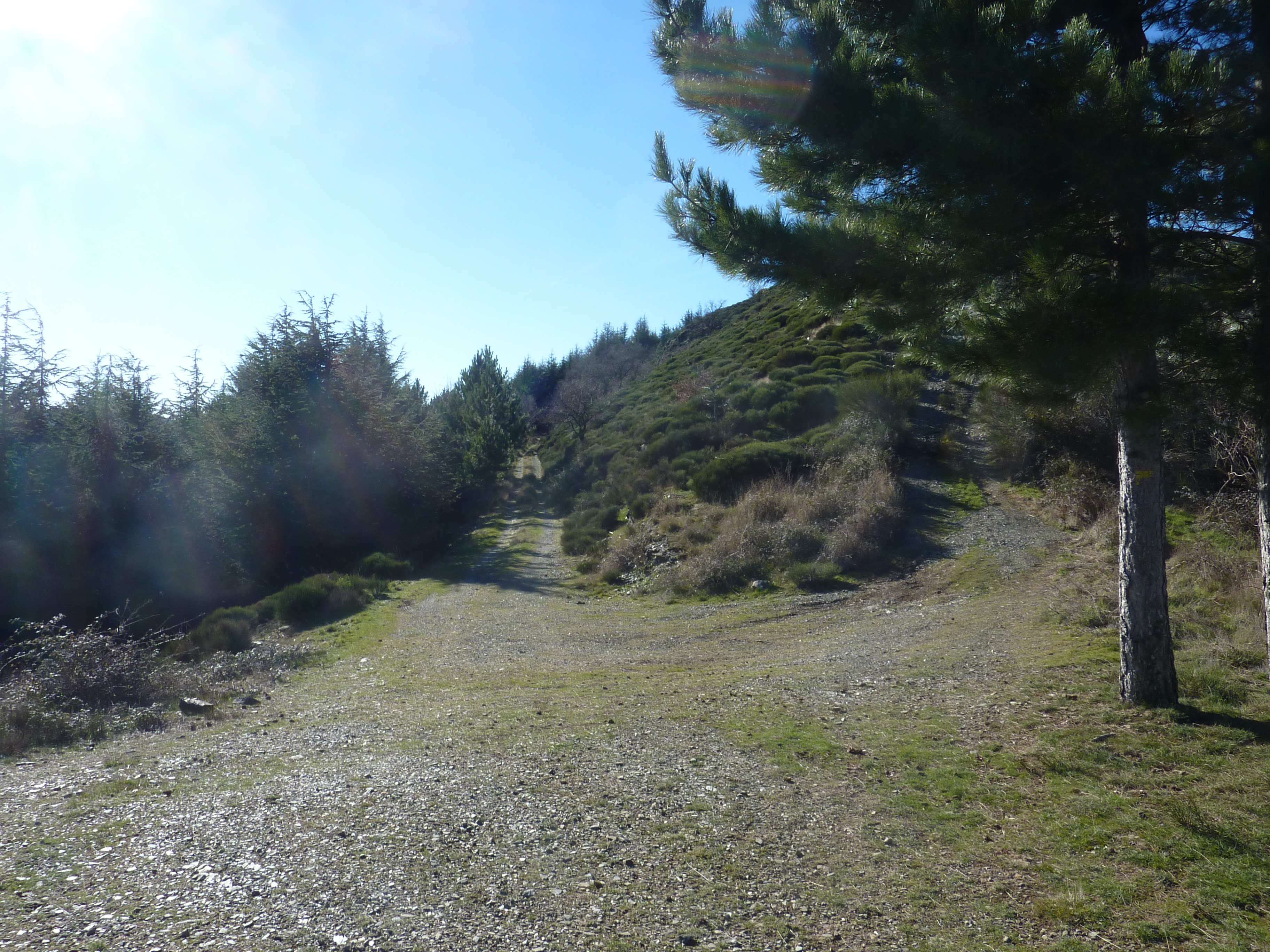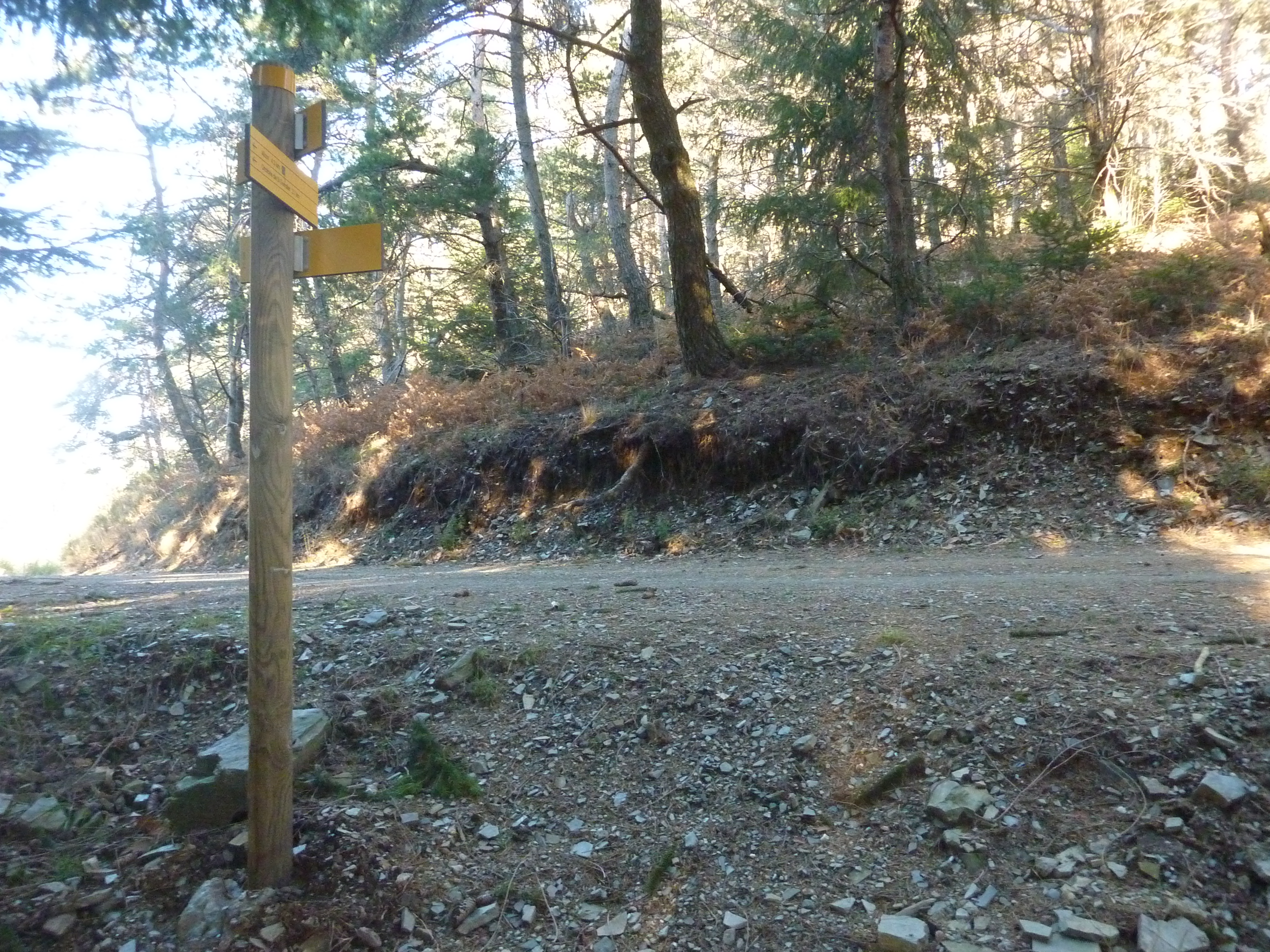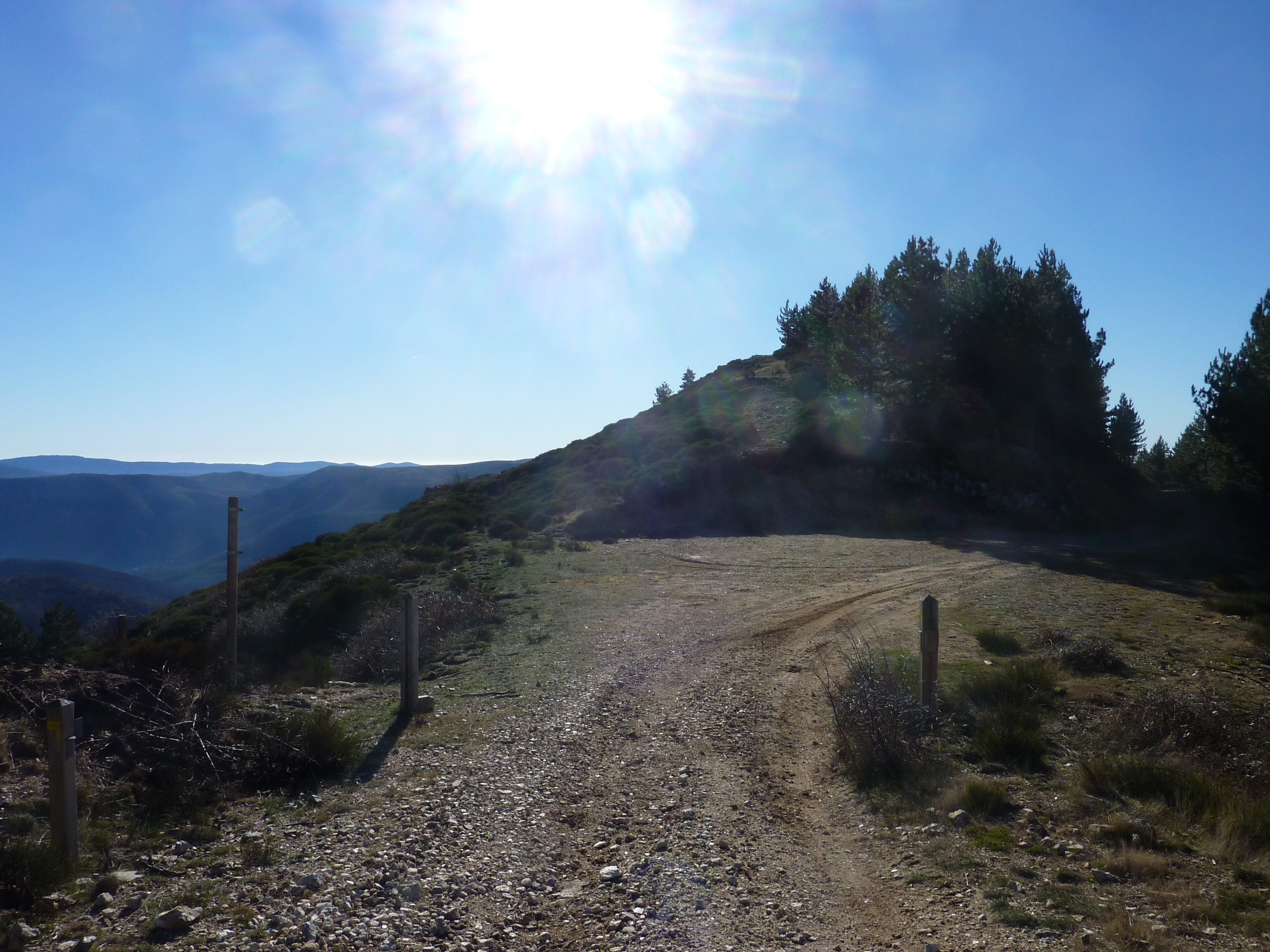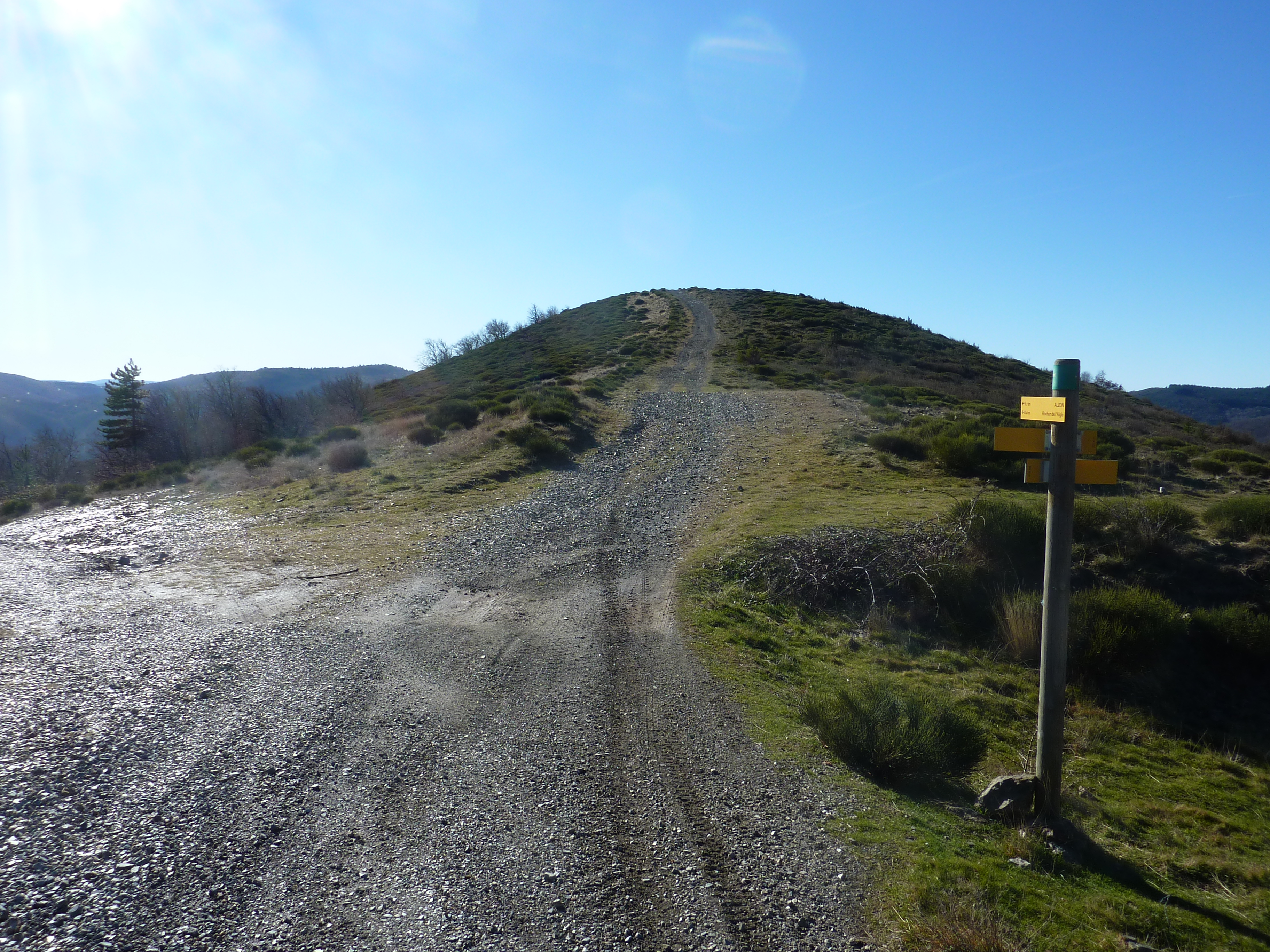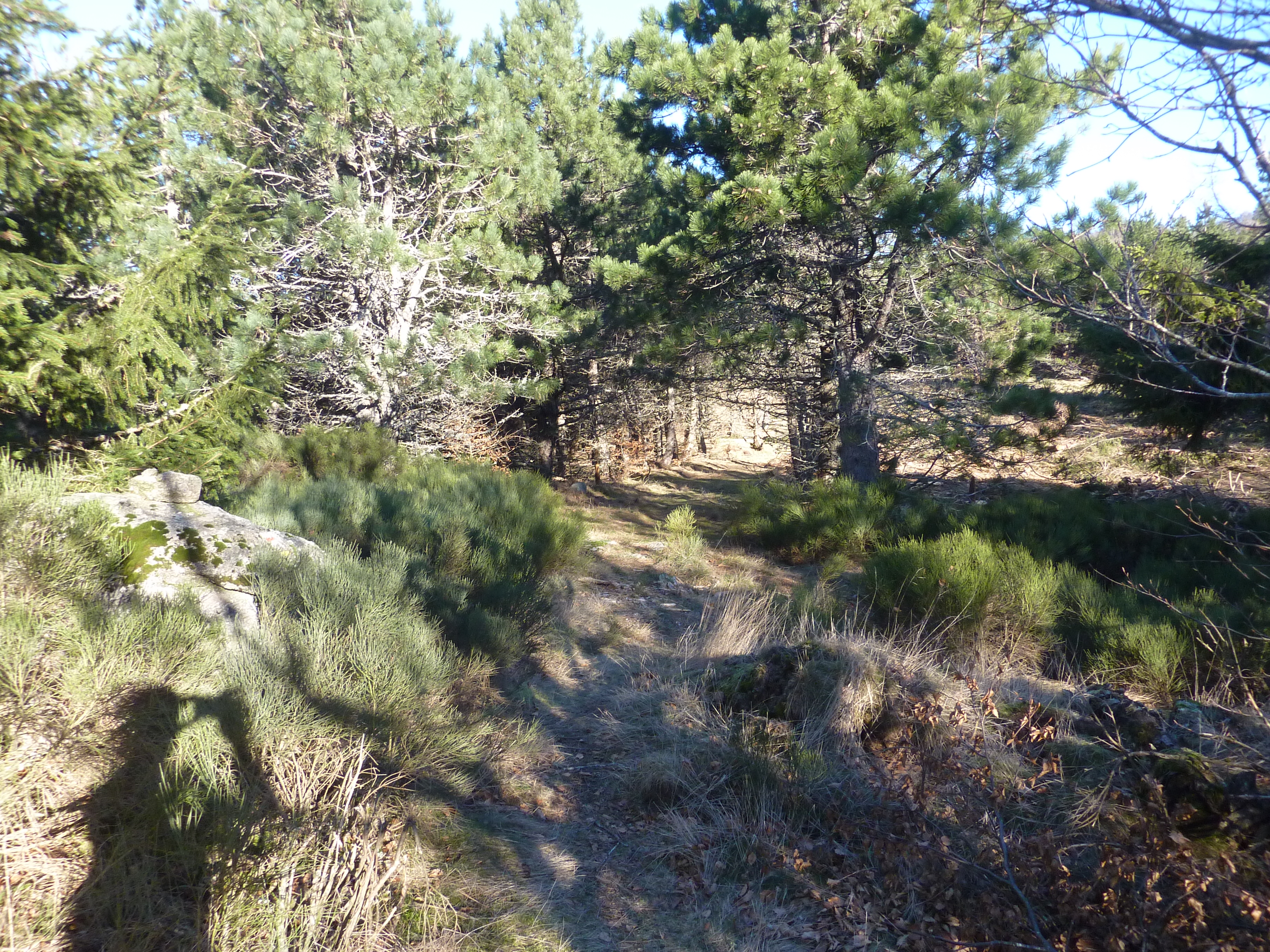 A ce croisement (100 mètres après avoir quitté le sommet du Serre de la Mouche), suivre le chemin partant tout droit direction Alzon, balisé en jaune