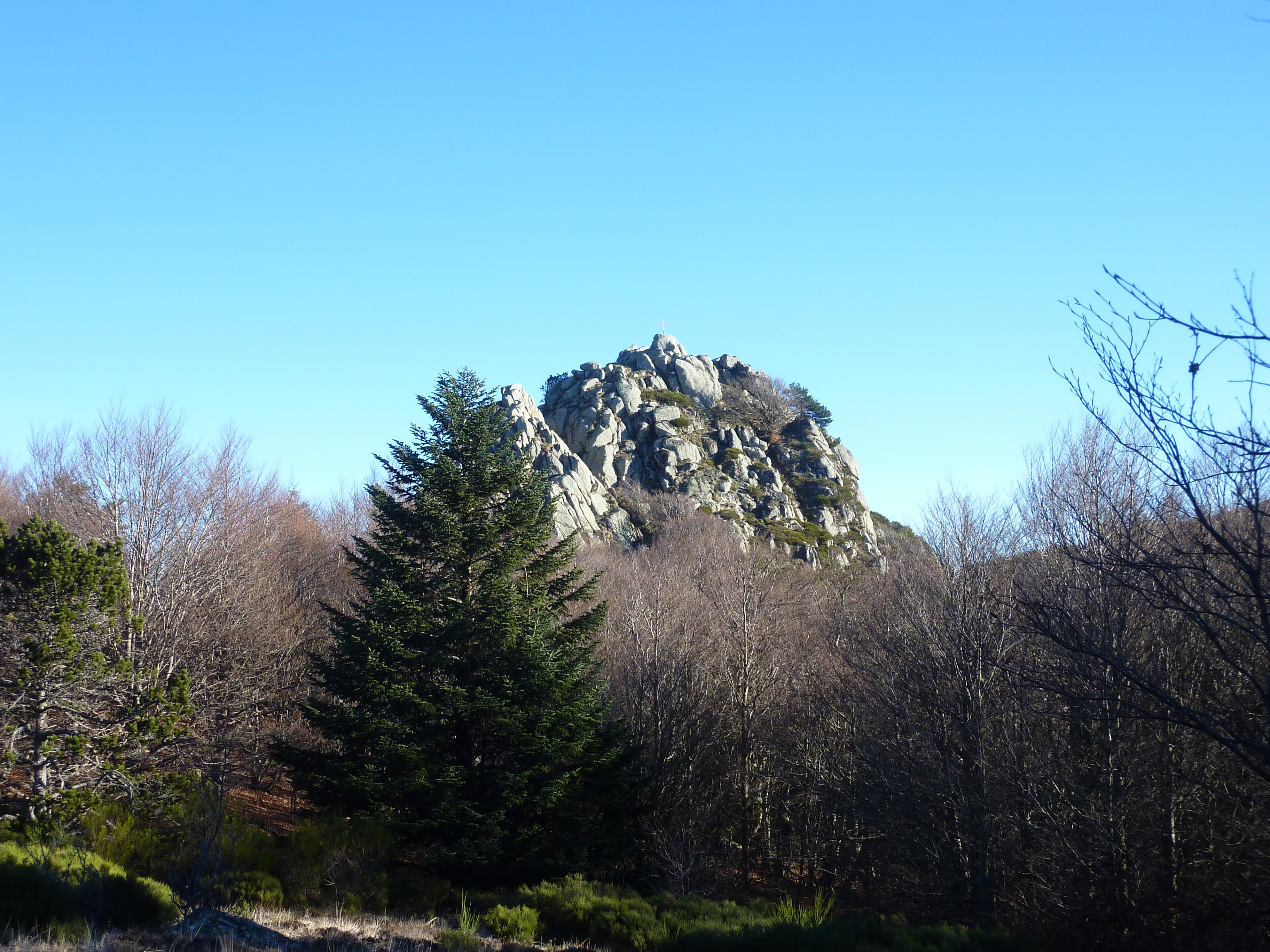 Le Pic Saint-Guiral symbolisé par ce dôme granitique se dévoile au dernier moment dans la forêt
