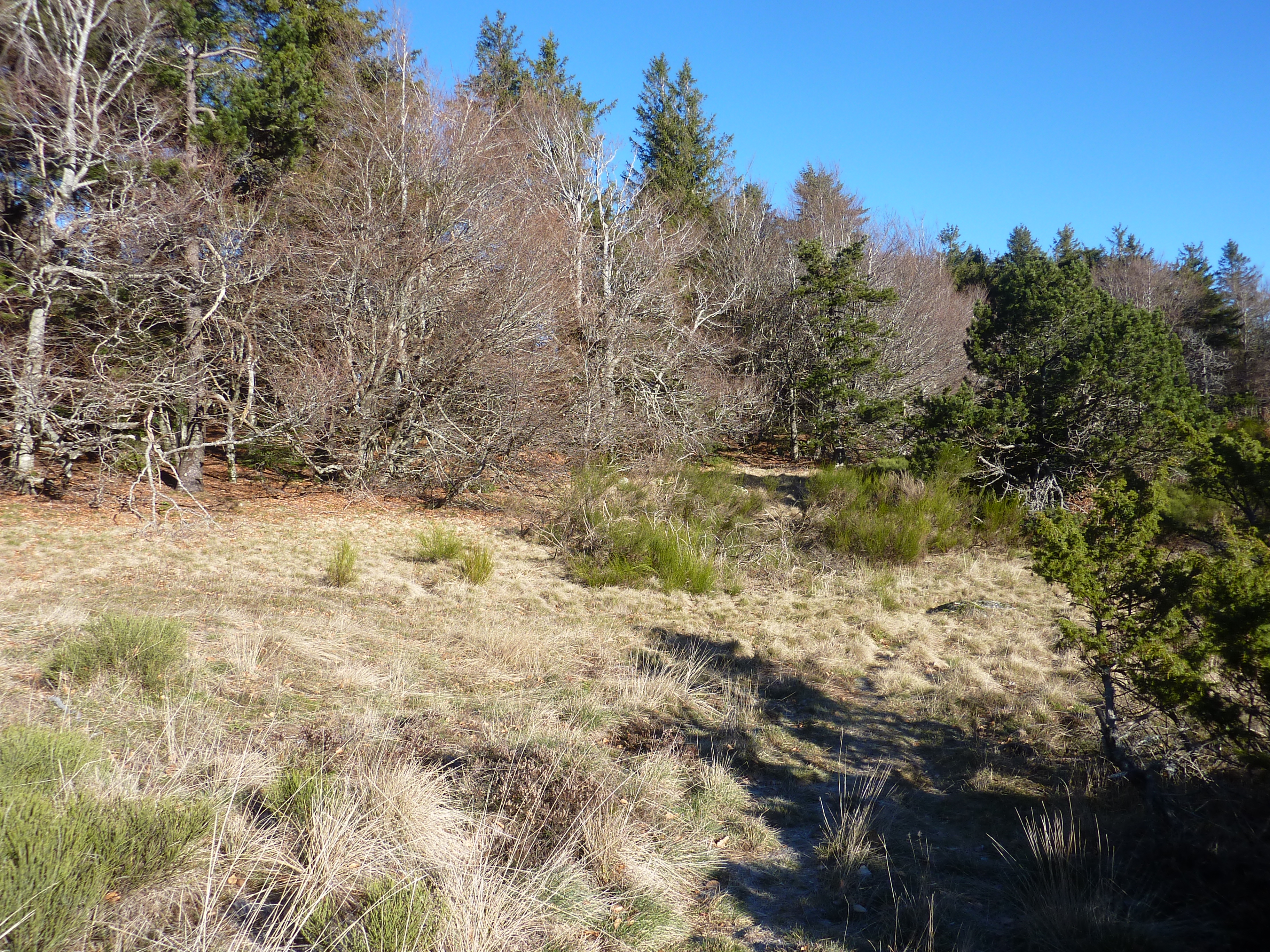 Roquefeuillet (1327 m) : suivre le chemin partant sur la droite direction Saint-Guiral, balisé en rouge et blanc, et en jaune