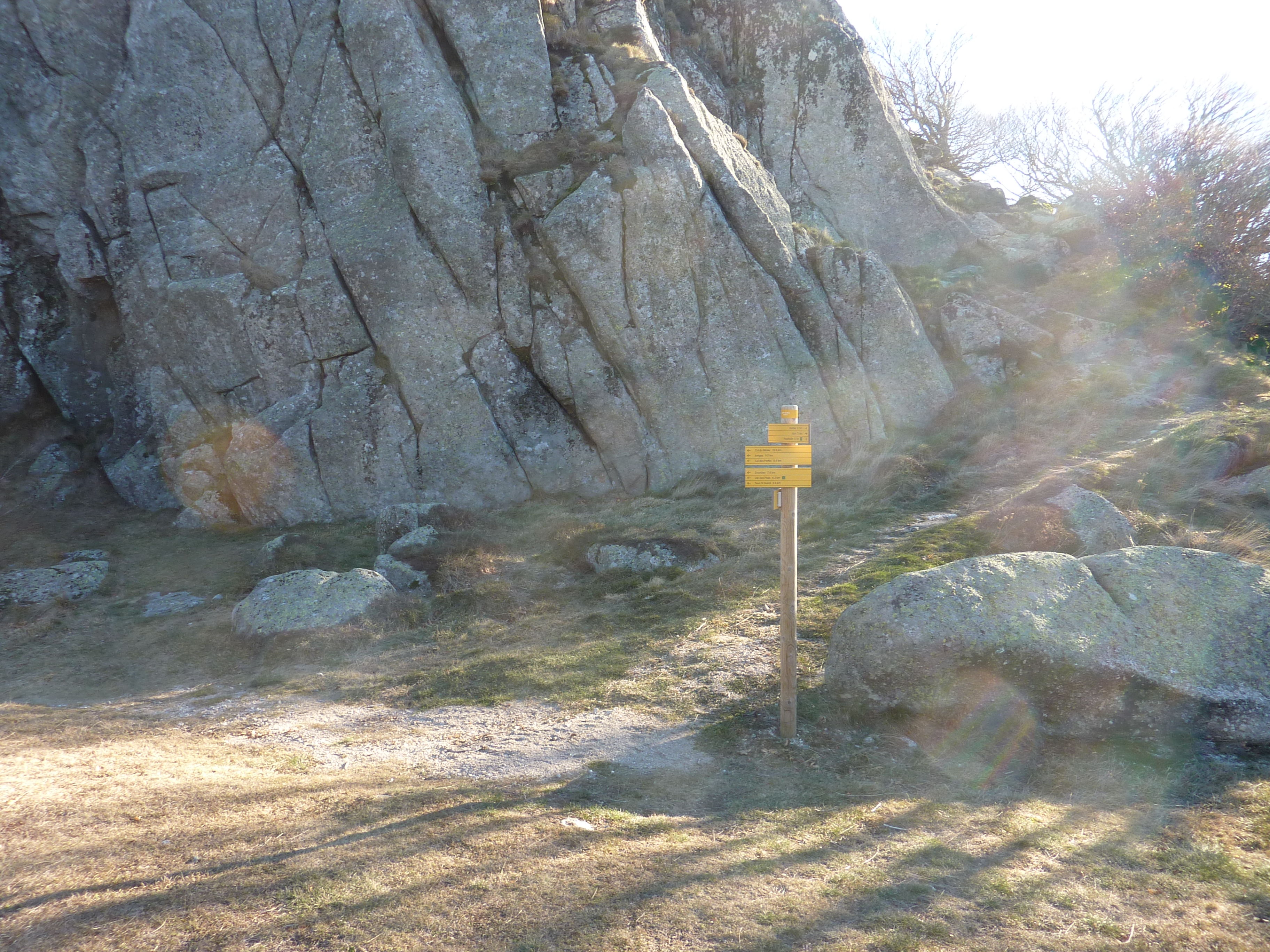 Saint-Guiral (1330 m) : suivre le chemin partant sur la droite et montant à travers le dôme granitique direction Saint-Guiral, aucun balisage dorénavant