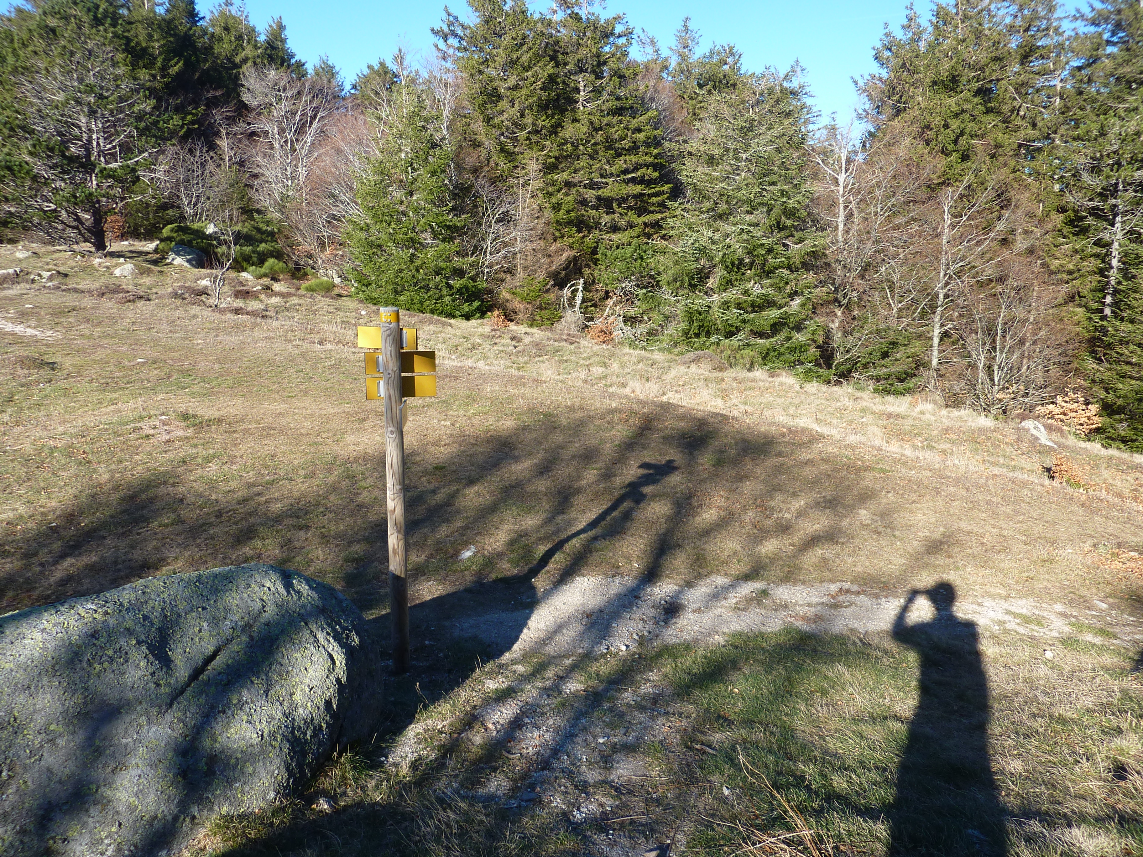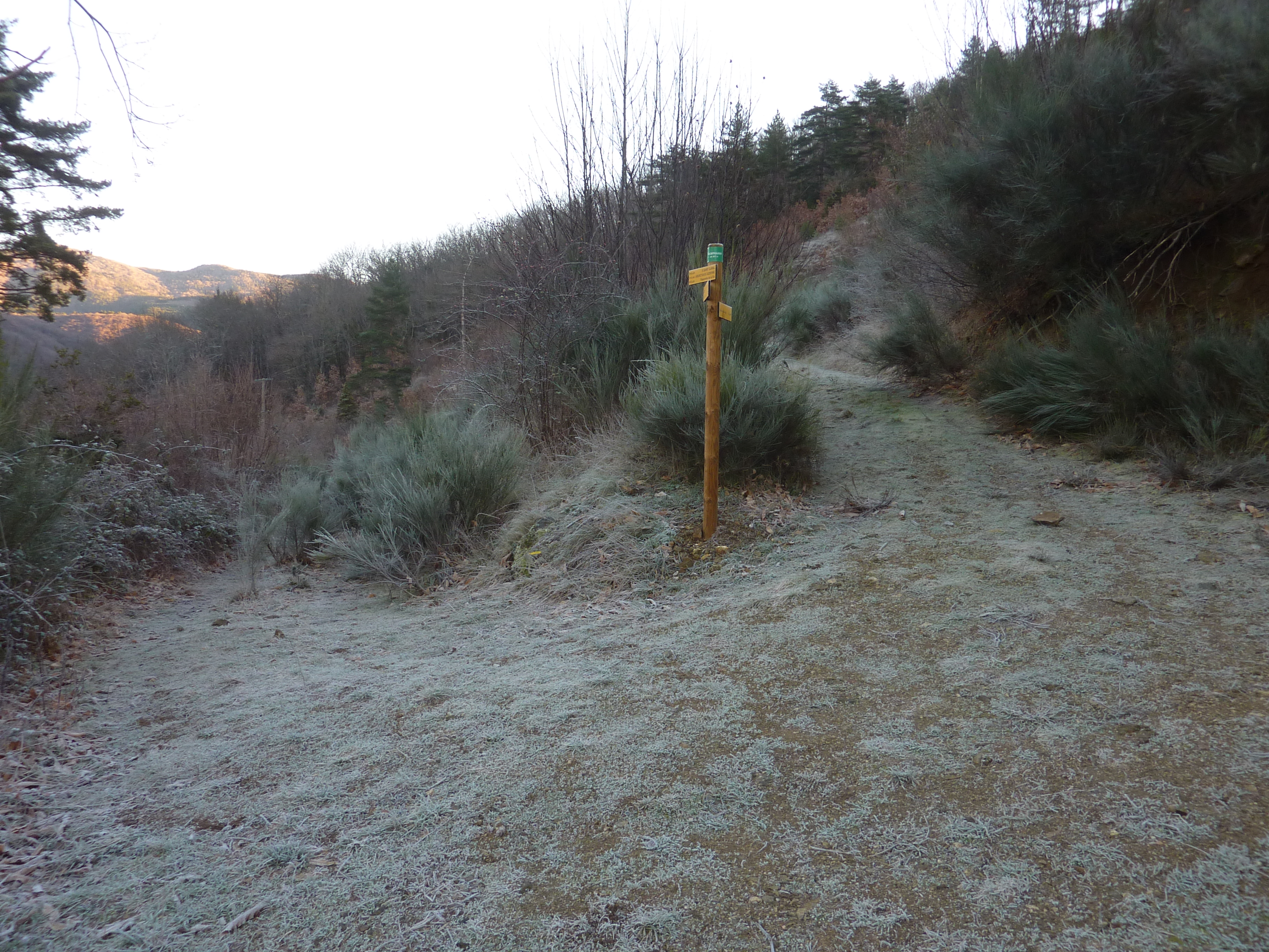A ce croisement avec la piste descendant vers le hameau des Égals, continuer à suivre le large chemin partant tout droit direction Saint-Guiral, balisé en rouge et blanc, et en jaune (entrée dans le Parc National des Cévennes)