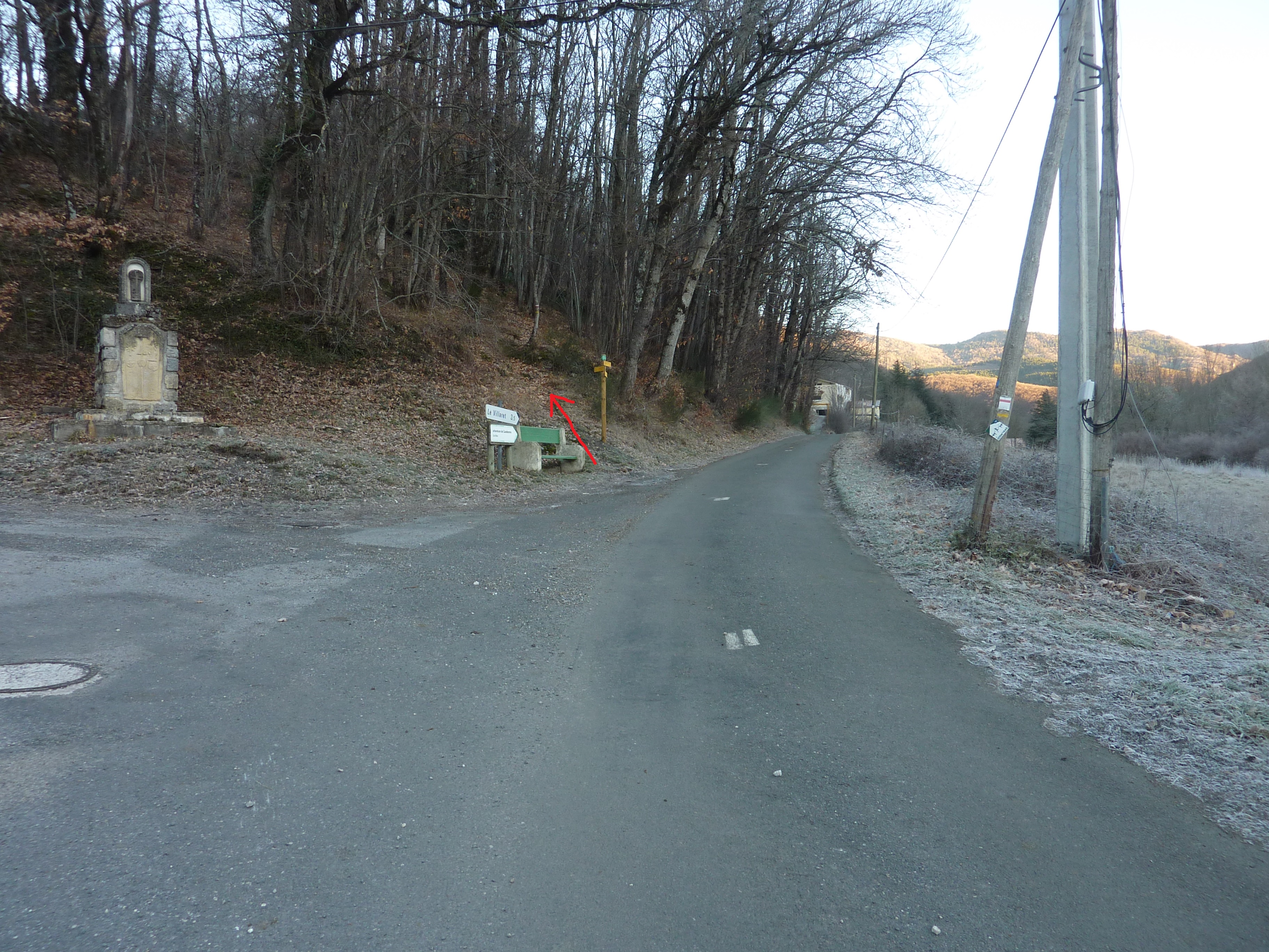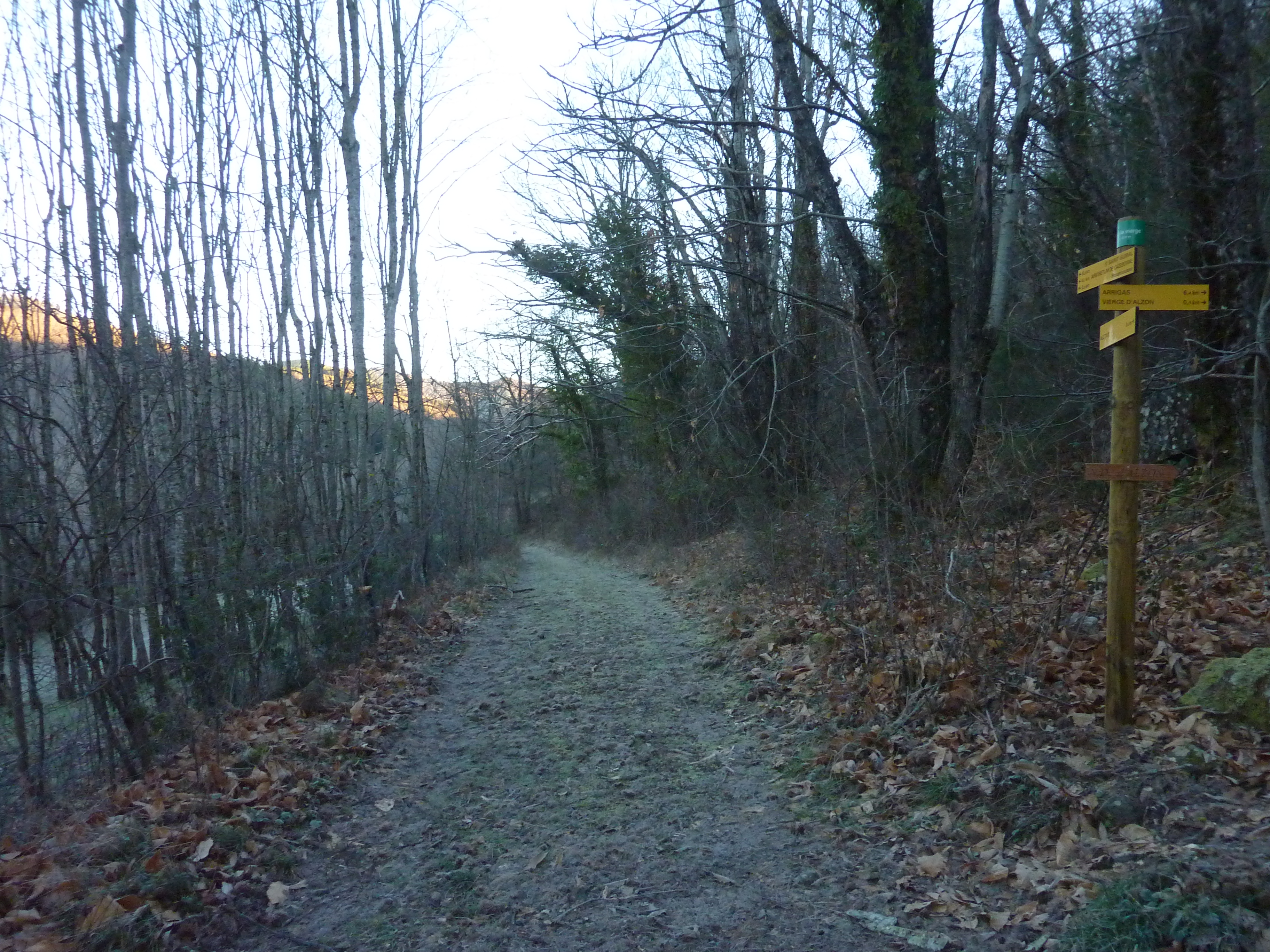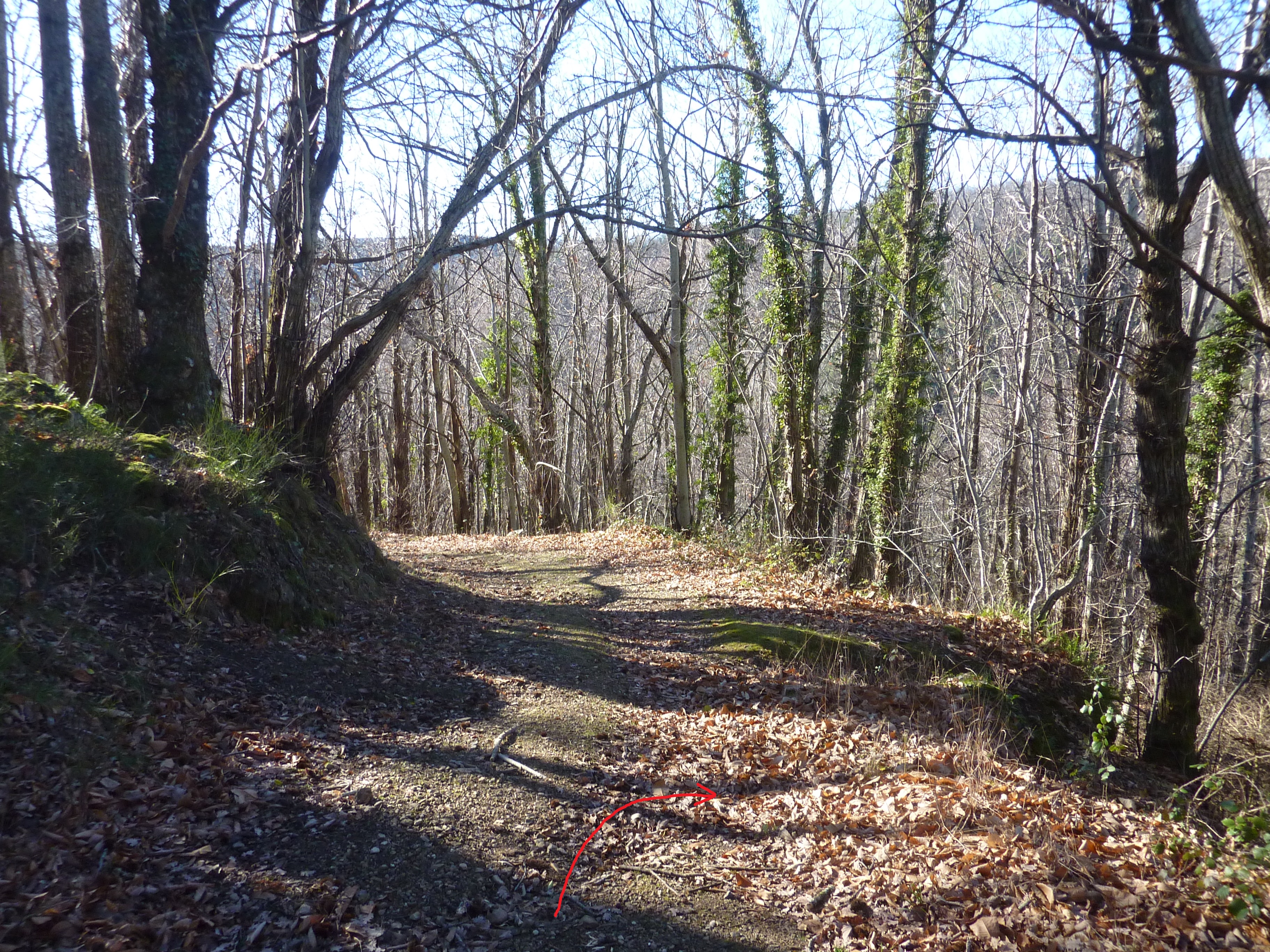 Sous la Vierge (624 m) : suivre la piste partant tout droit direction Saint-Guiral, balisé en rouge et blanc, et en jaune (le chemin de droite sera emprunté au retour)