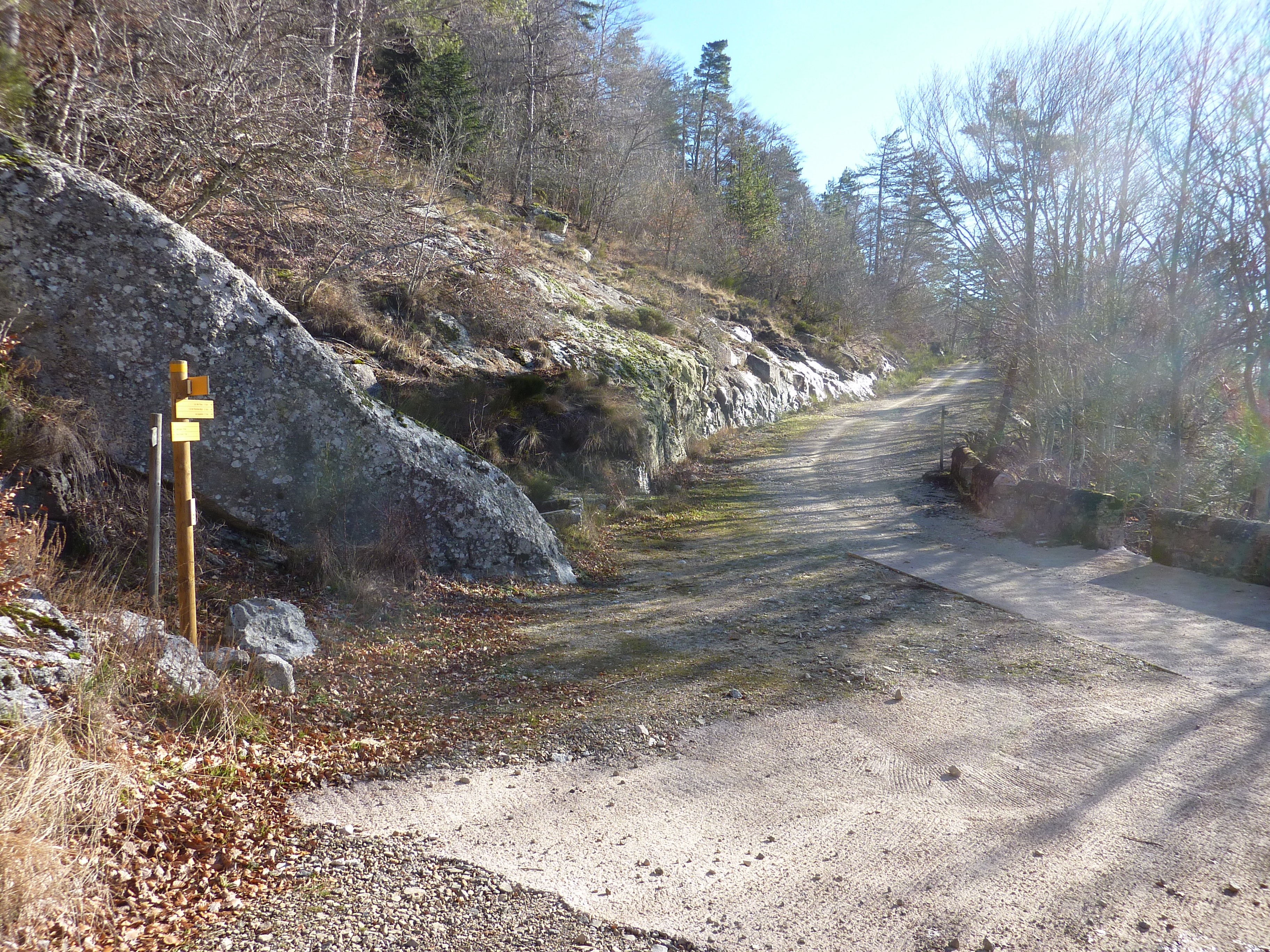 Col des Tempêtes (997 m) : suivre la large piste partant sur la gauche direction Arrigas, balisé en jaune