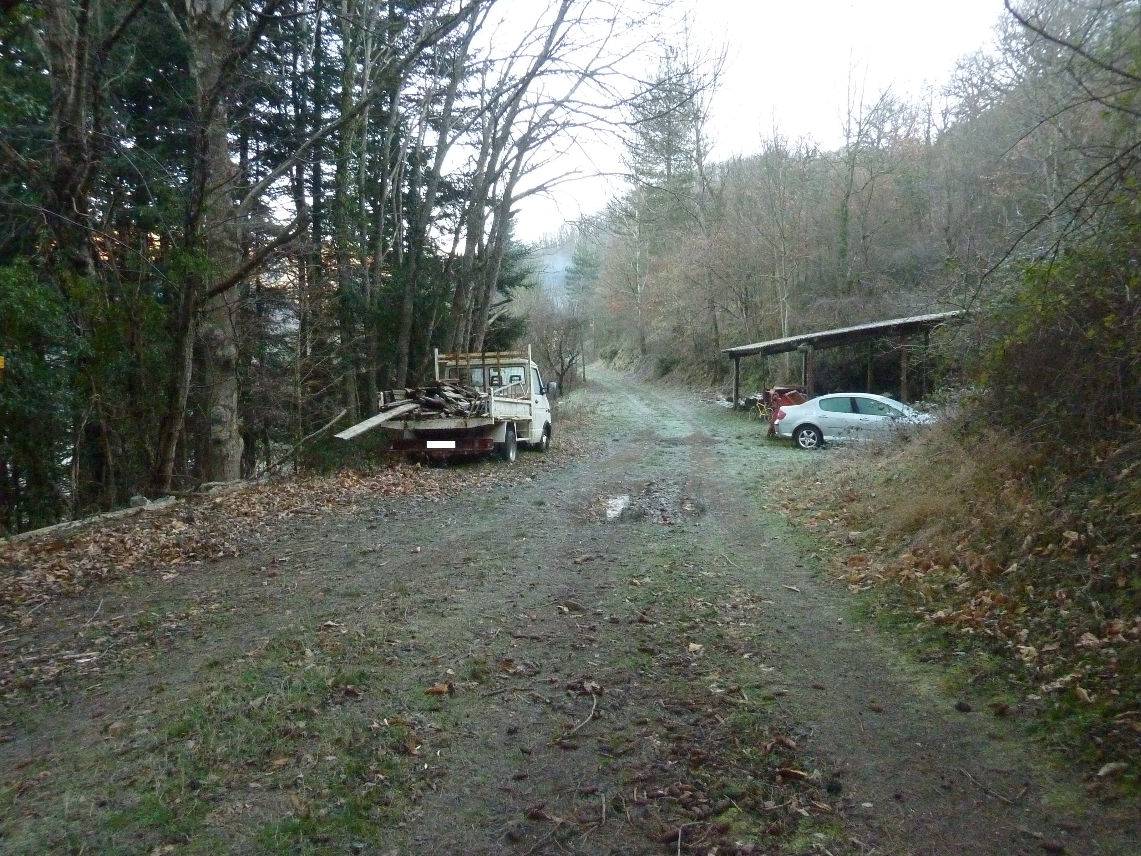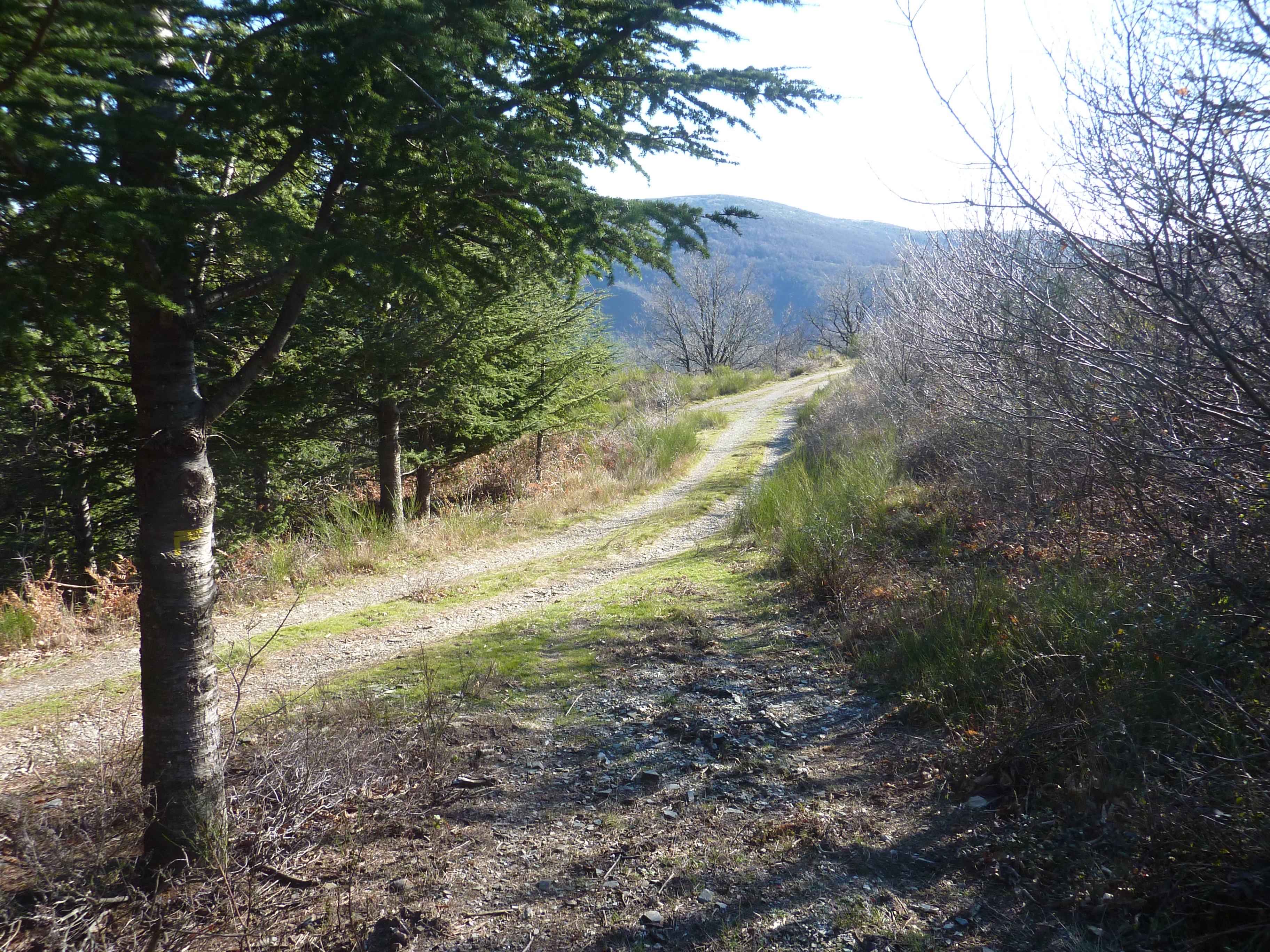 Sous Saint-Guiral (1300 m) : suivre la large piste partant sur la droite direction Alzon, balisé uniquement en jaune dorénavant